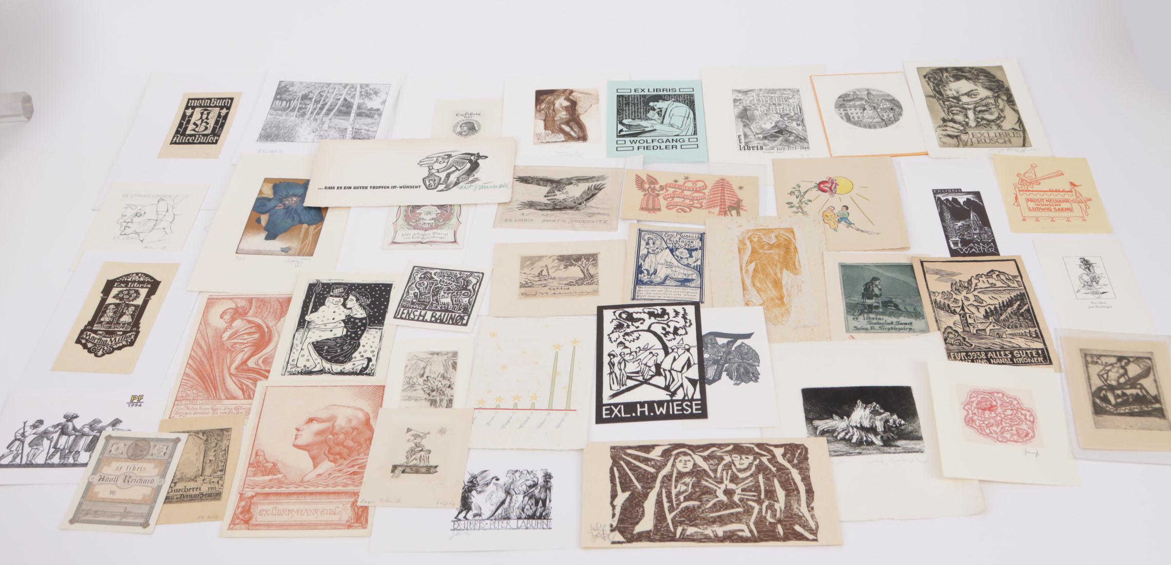 collectie Duitse en Zwitserse exlibris en kleingrafiek, diverse technieken, deels opgeplakt, deels gesigneerd (o.a. Naumann, Stauf, Tilgner, Dachauer, Warnecke, Preuss, Boetel, Wolbrandt, Koch, Pilz, Riess, Volkamer, Franke, Beier, Hirsch, Schmidt, Rusch)