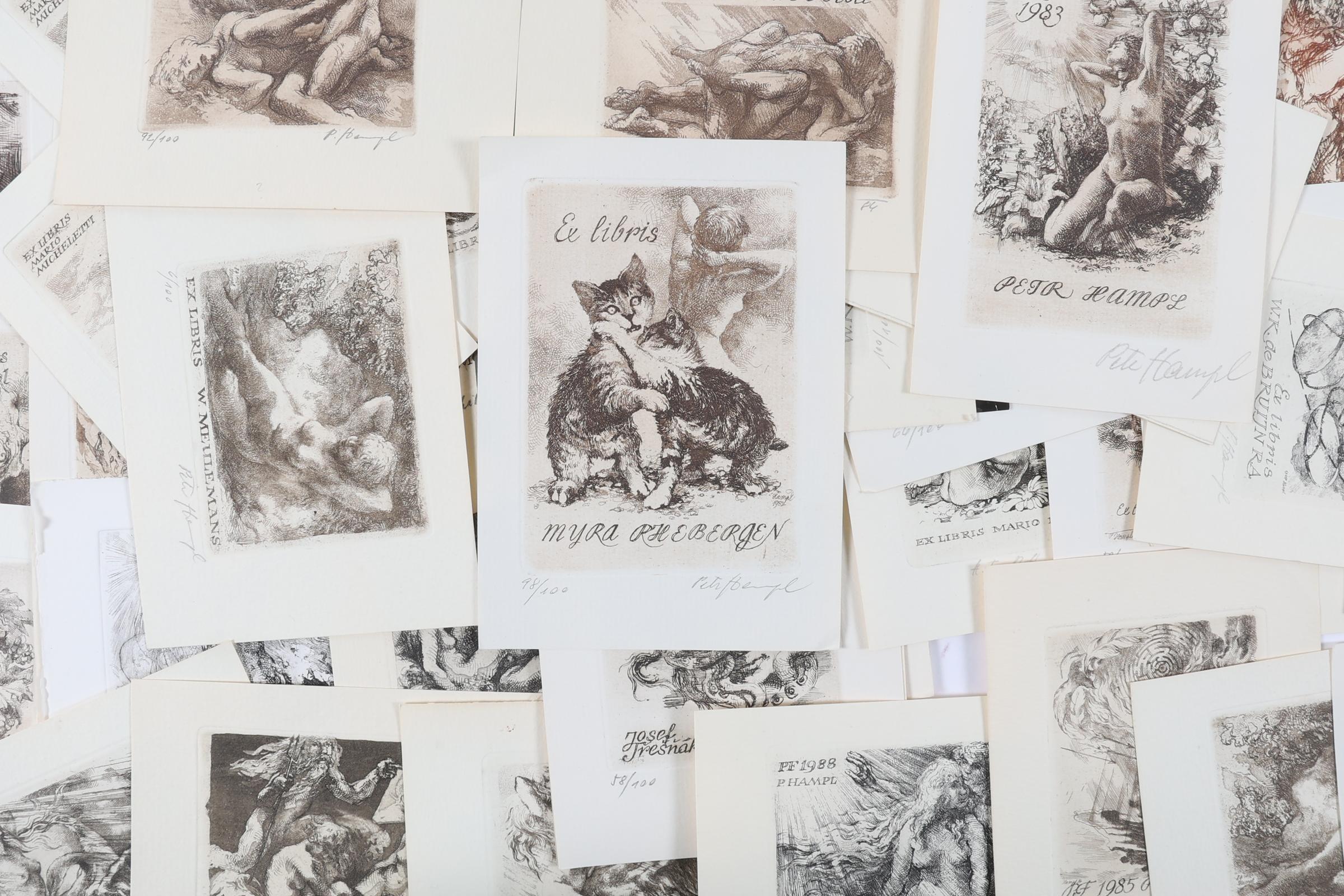 Hampl, P., plm. 110 exlibris / kleingrafiek, C3, gesigneerd, enkele doubletten, enkele opgeplakt, veel vrouwelijk naakt