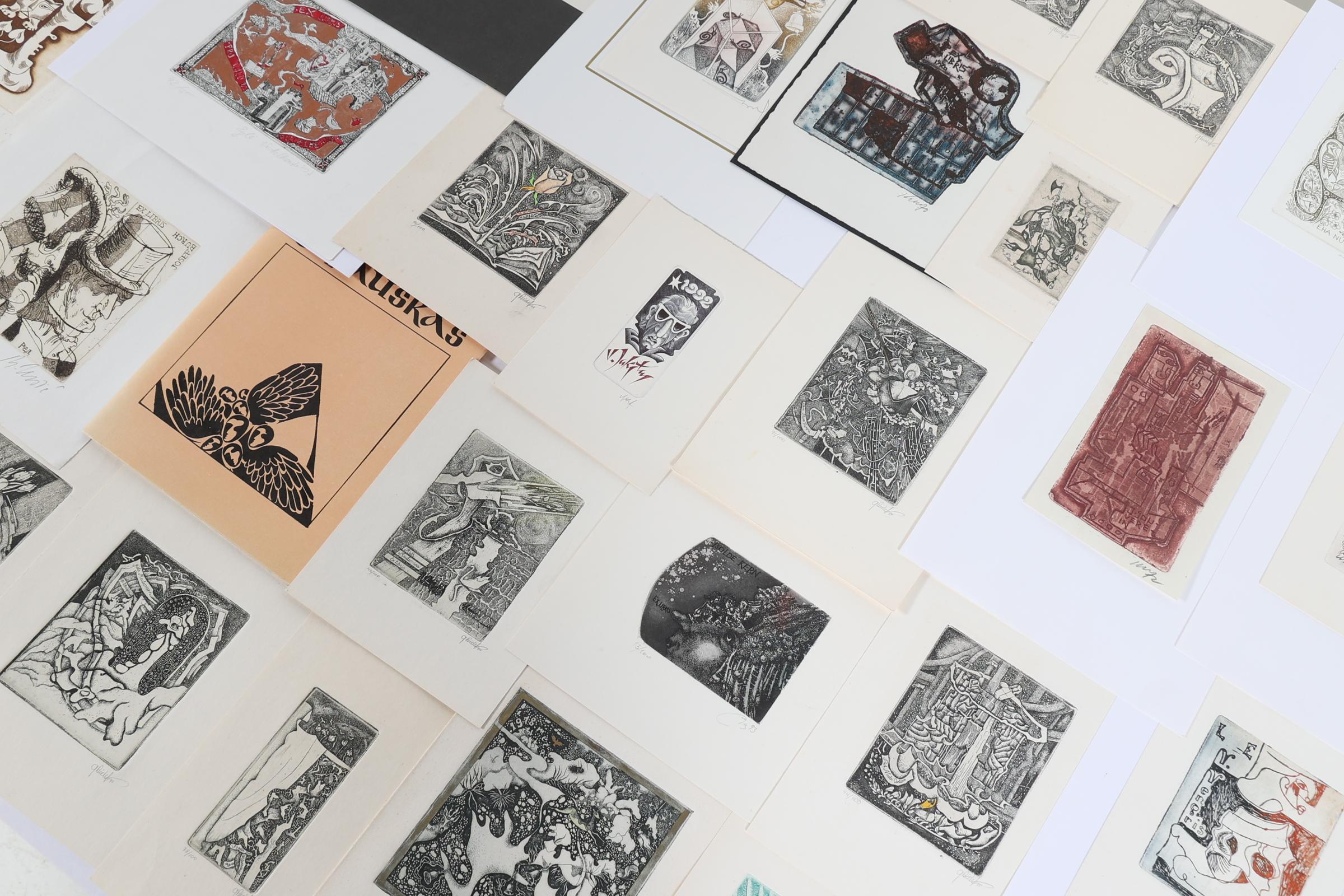 collectie van plm. 75 exlibris, gemaakt door kunstenaars uit Estland, Letland. Litauen. Diepdrukken, deels gesigneerd, deels opgeplakt. O.a. Kisauraskas, Saltenyte, Cepauskas, Didelyte, Jakstas, Vaher, Valjal, Vertelkeite, Kmieliauskate, Chernetsova, Danute.