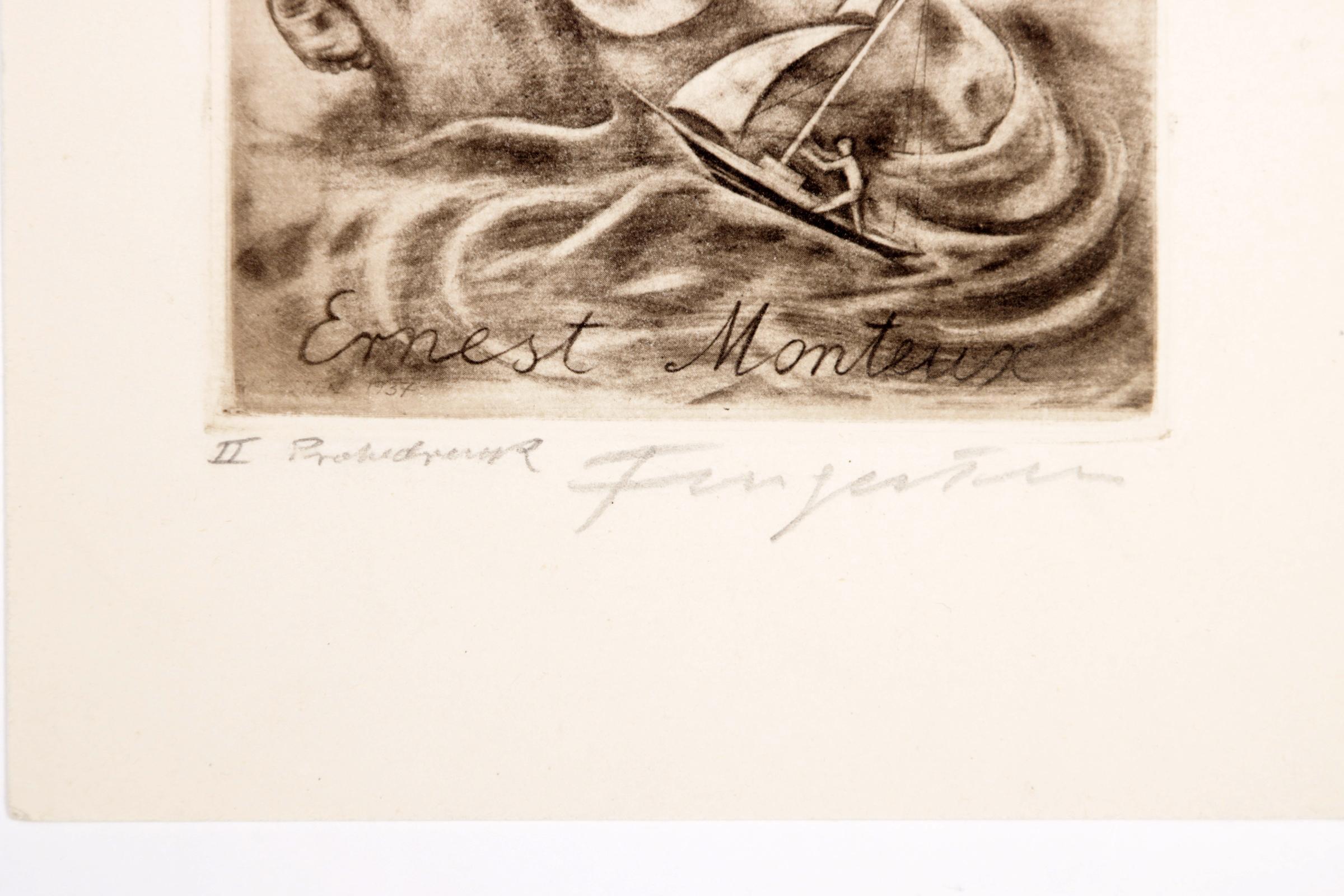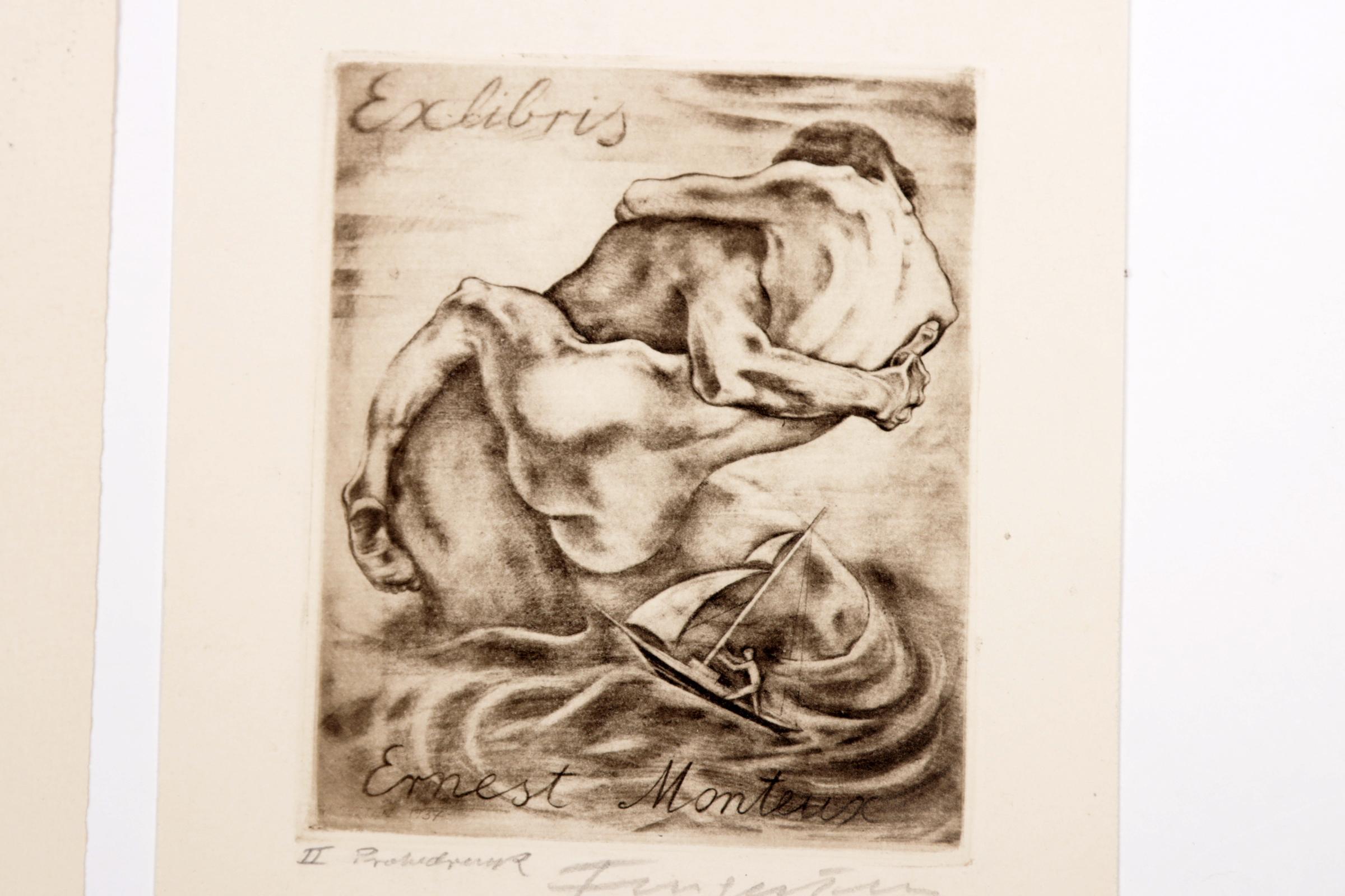Fingesten, M, 3 exlibris (Lombardo, G.M., Ernest Monteux), C3, gesigneerd, opgeplakt (geweest)