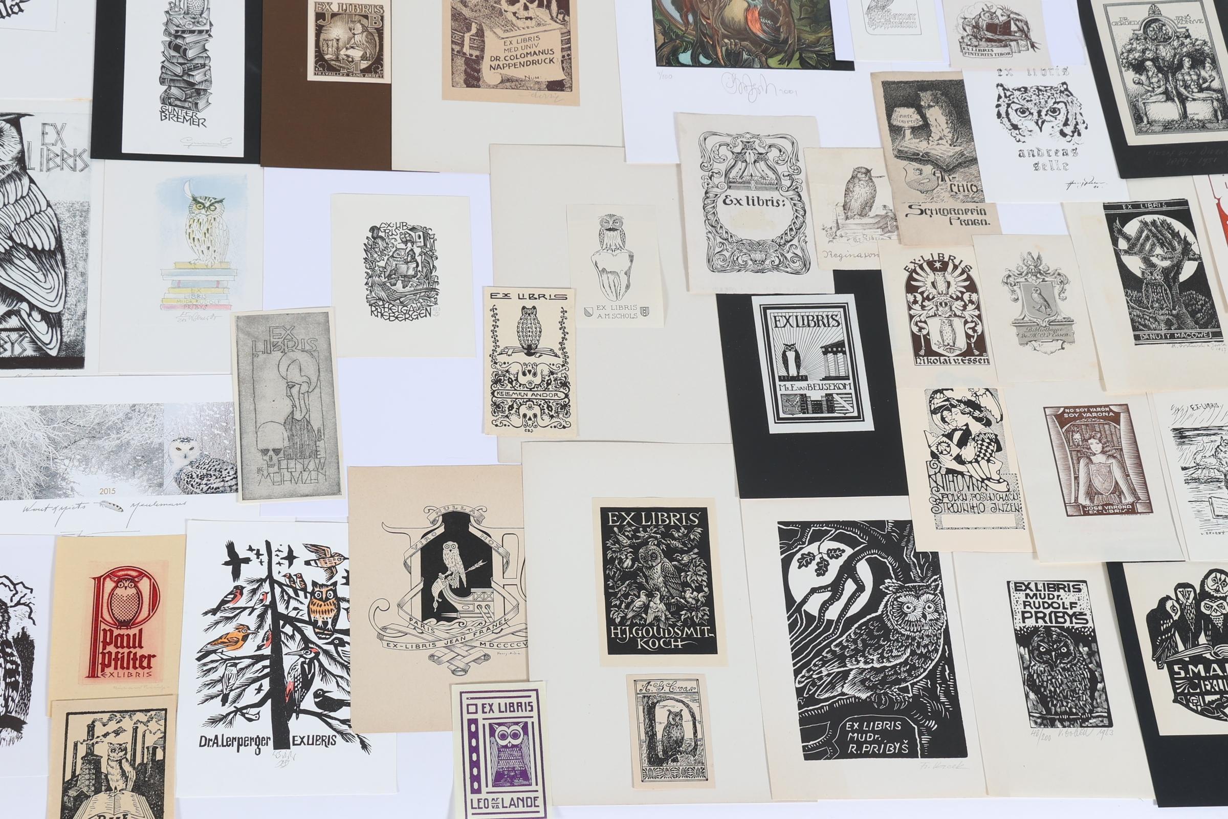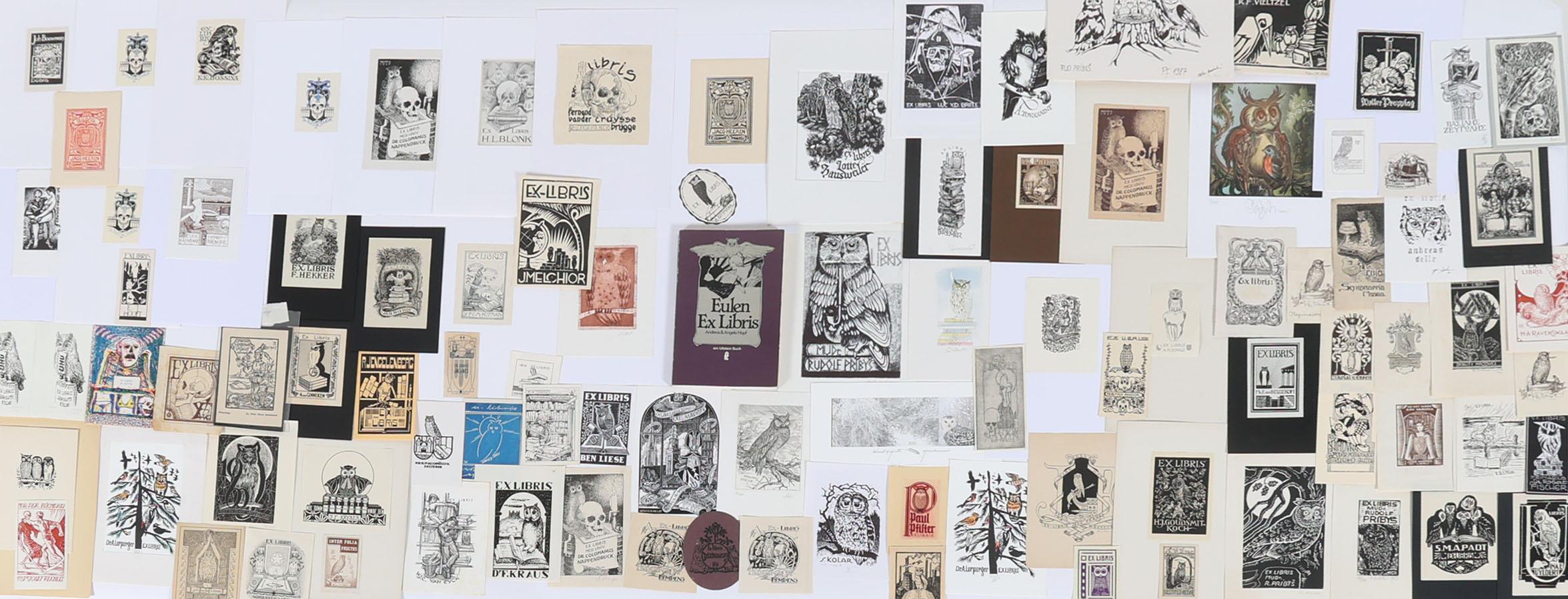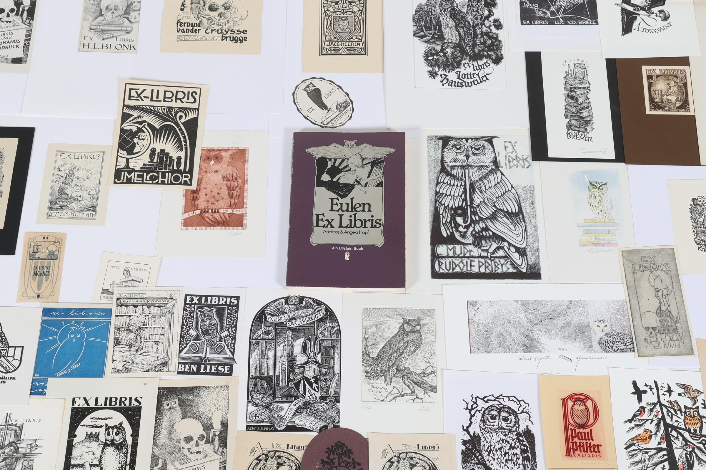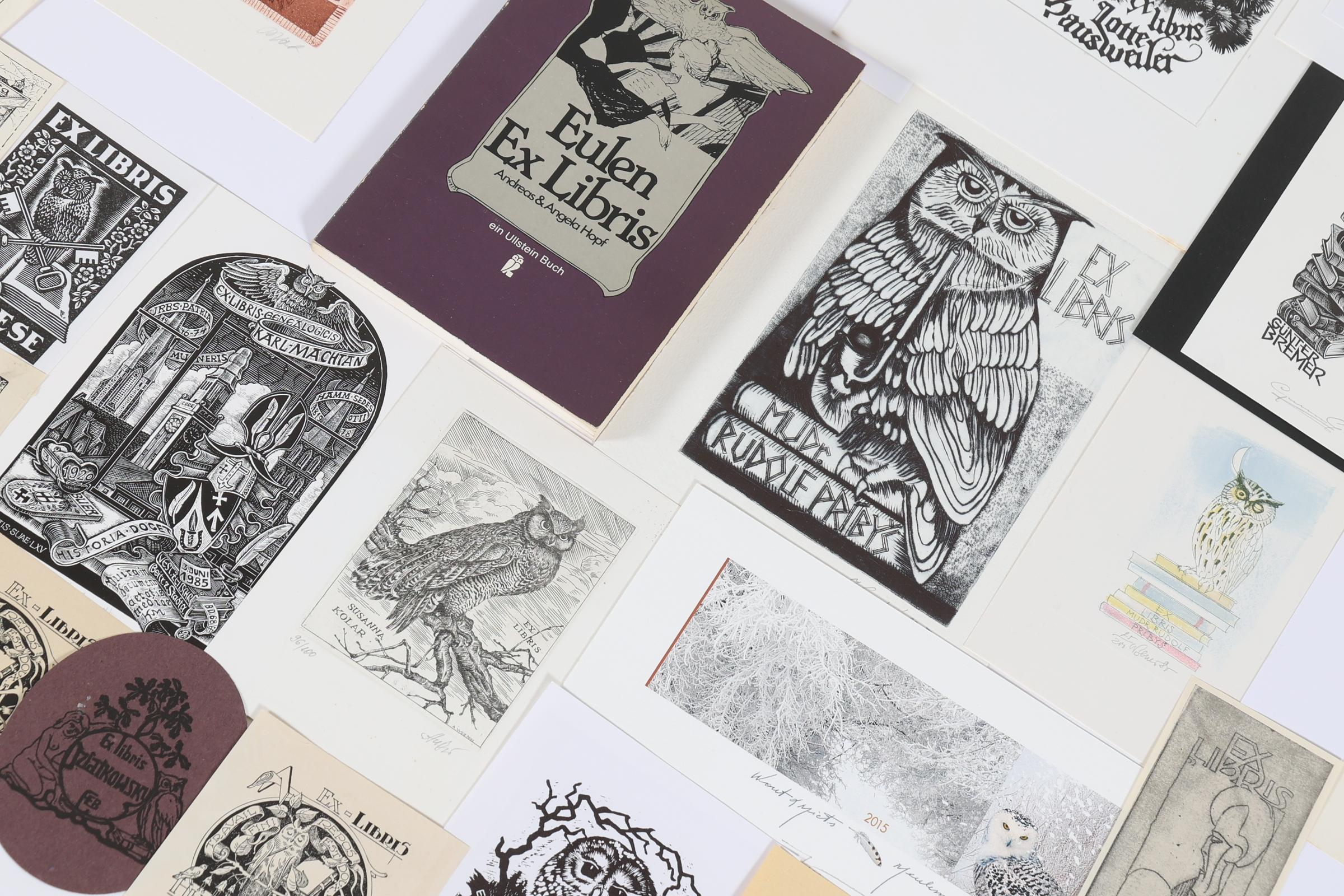 collectie van plm. 100 exlibris / kleingrafiek, thema: 'uilen', vooral hoogdruk, deels opgeplakt / gesigneerd. O.a. door Arndt, Agirba, Mauve, Gaudaen, Bulder, Drahos, Benes, Preusse, Jacobs, Vutovra, Koutny. Plus: 'Eulen-Exlibris', A. + A. Hopf, pocket, tekst in Duits, 128 pag., veel afbeeldingen, ook in kleur.