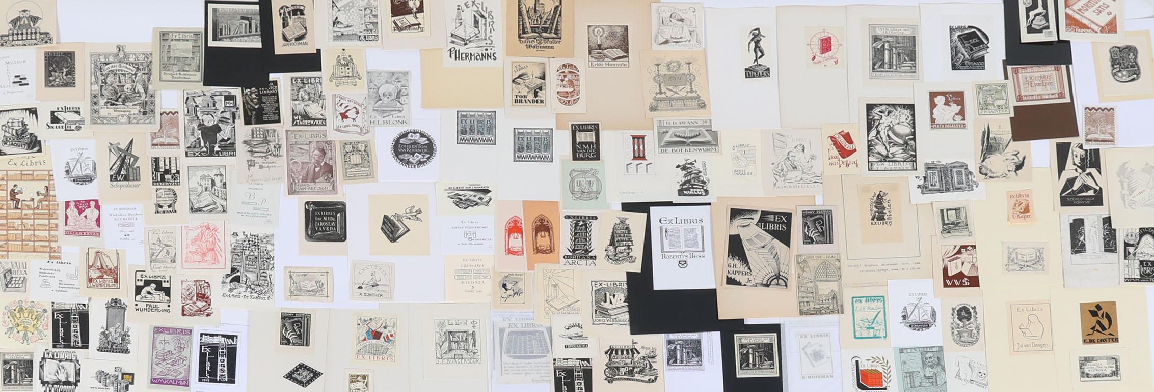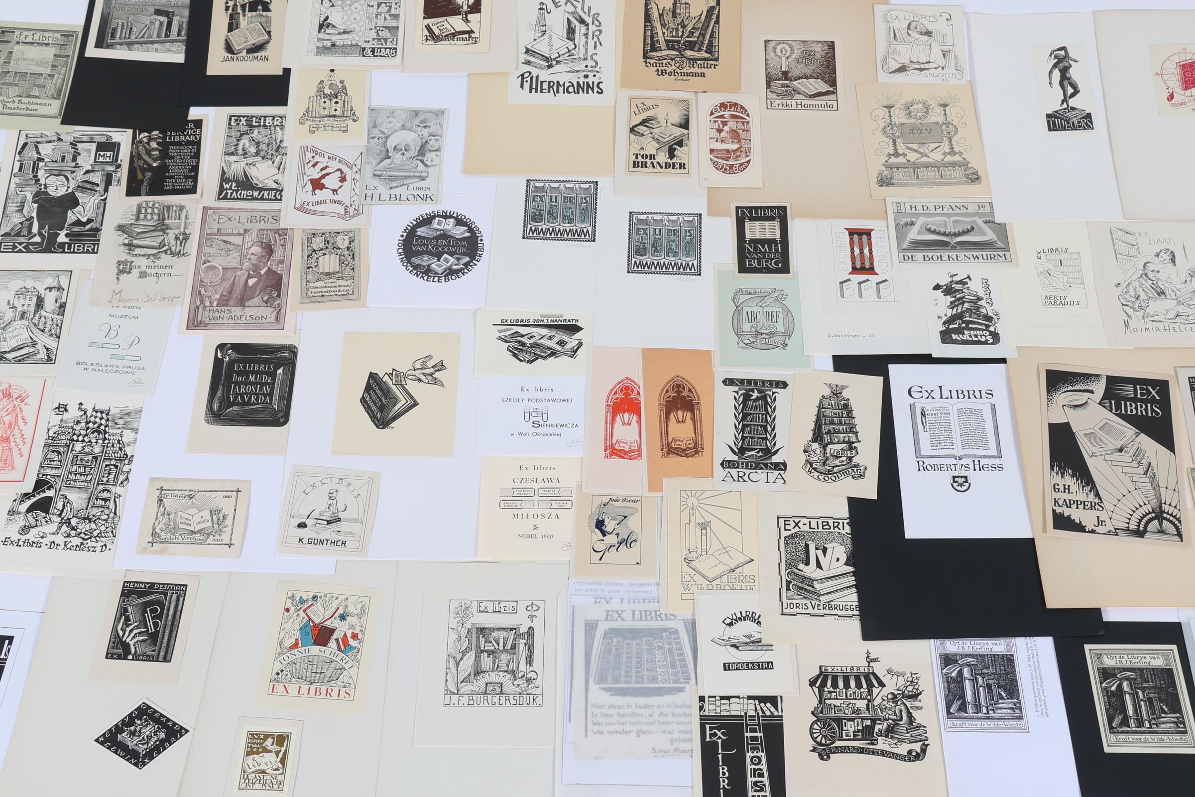 collectie van plm. 150 exlibris / kleingrafiek, thema: "boeken / bibliotheken', hoogdruk / vlakdruk, deels gesigneerd, deels opgeplakt. O.a. O. Karel, Bulder, Melan, Vlaanderen, Antal, Vodraszka, Benca, Eversdijk, Dolatowski, Rueter,