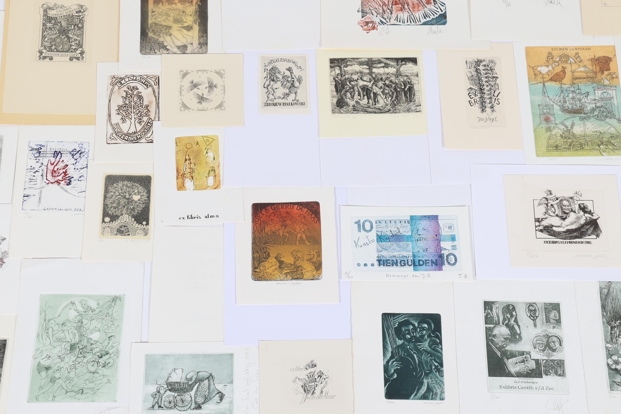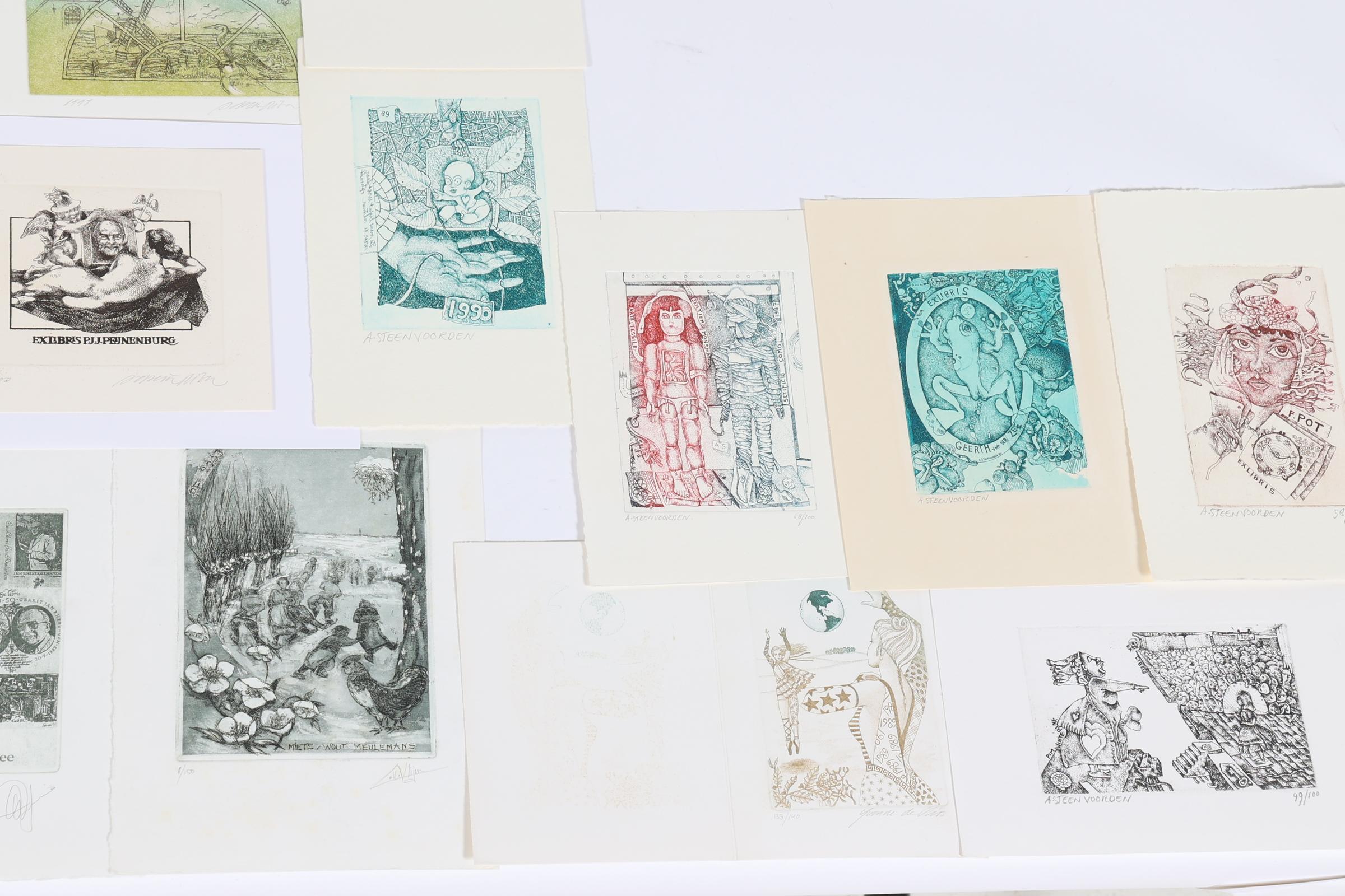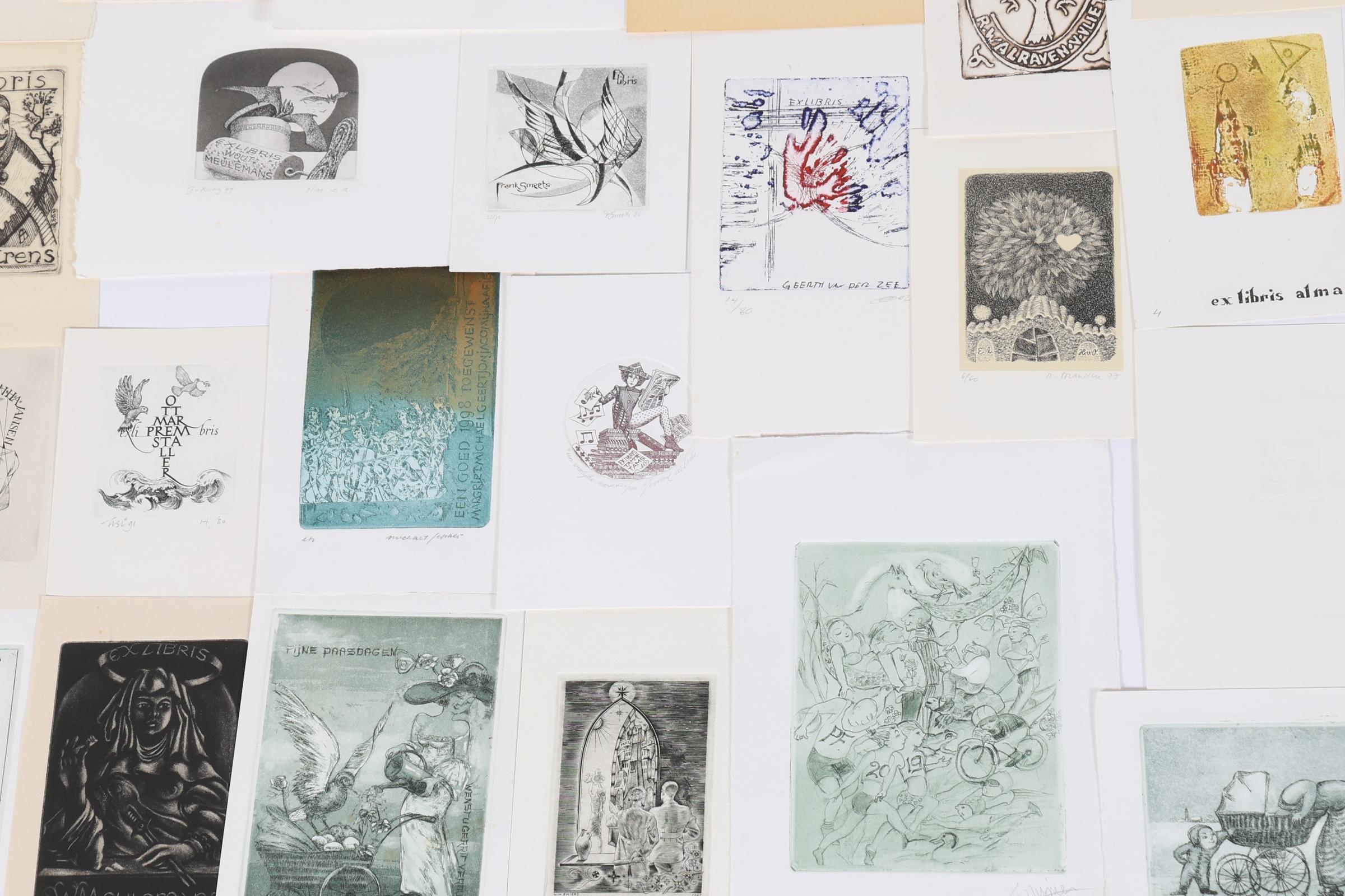 collectie van plm. 50 Nederlandse exlibris / /kleingrafiek, diepdrukken (C2, C3 etc.), deels gesigneerd, deels opgeplakt. Gemaakt door o.a. Steenvoorden, Jepkes, Smeets, Van Rooy, De Wolff, Levigne, Van Vlijmen, Wetselaar, Achttienribbe, Adzera Riba, Zwiers.