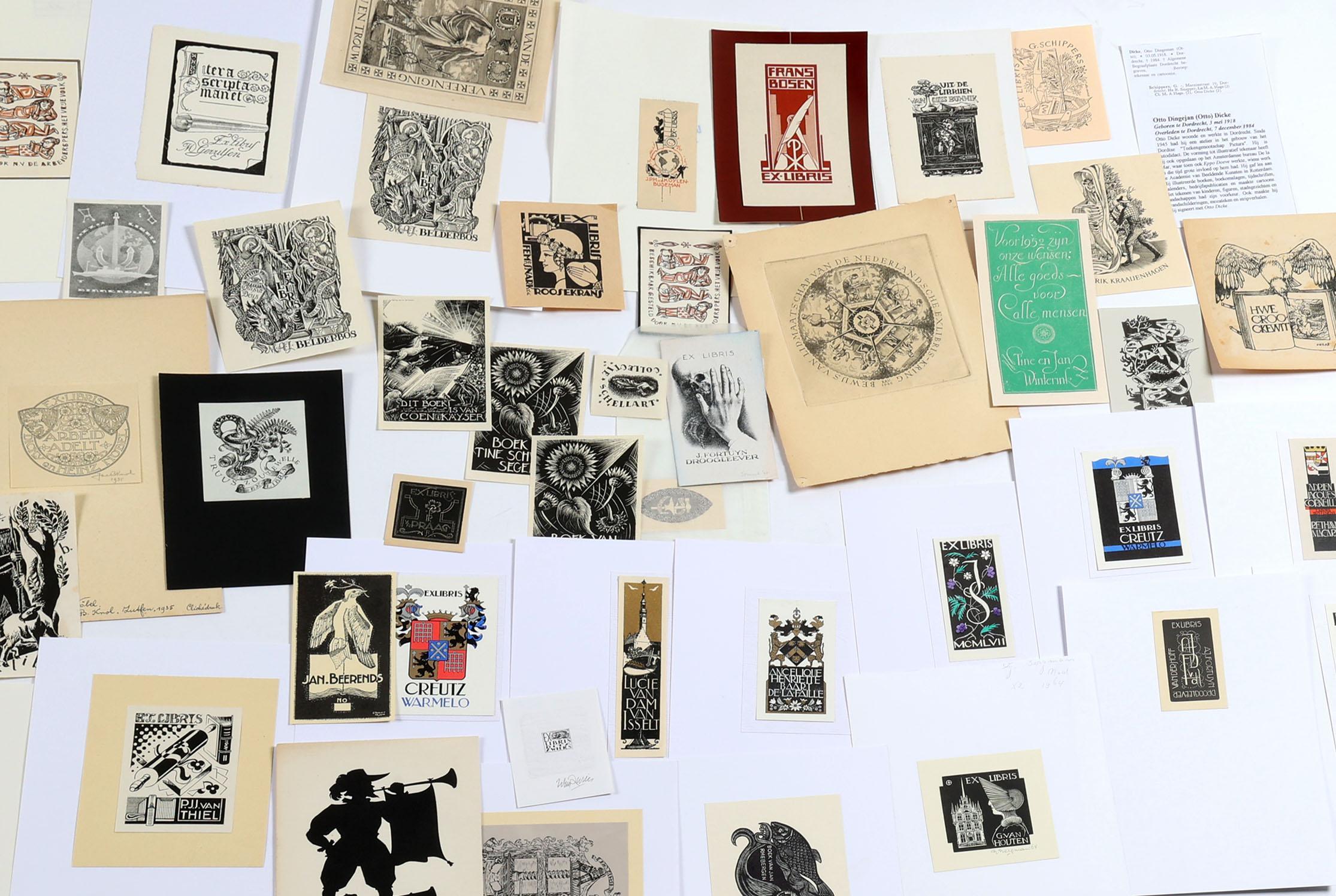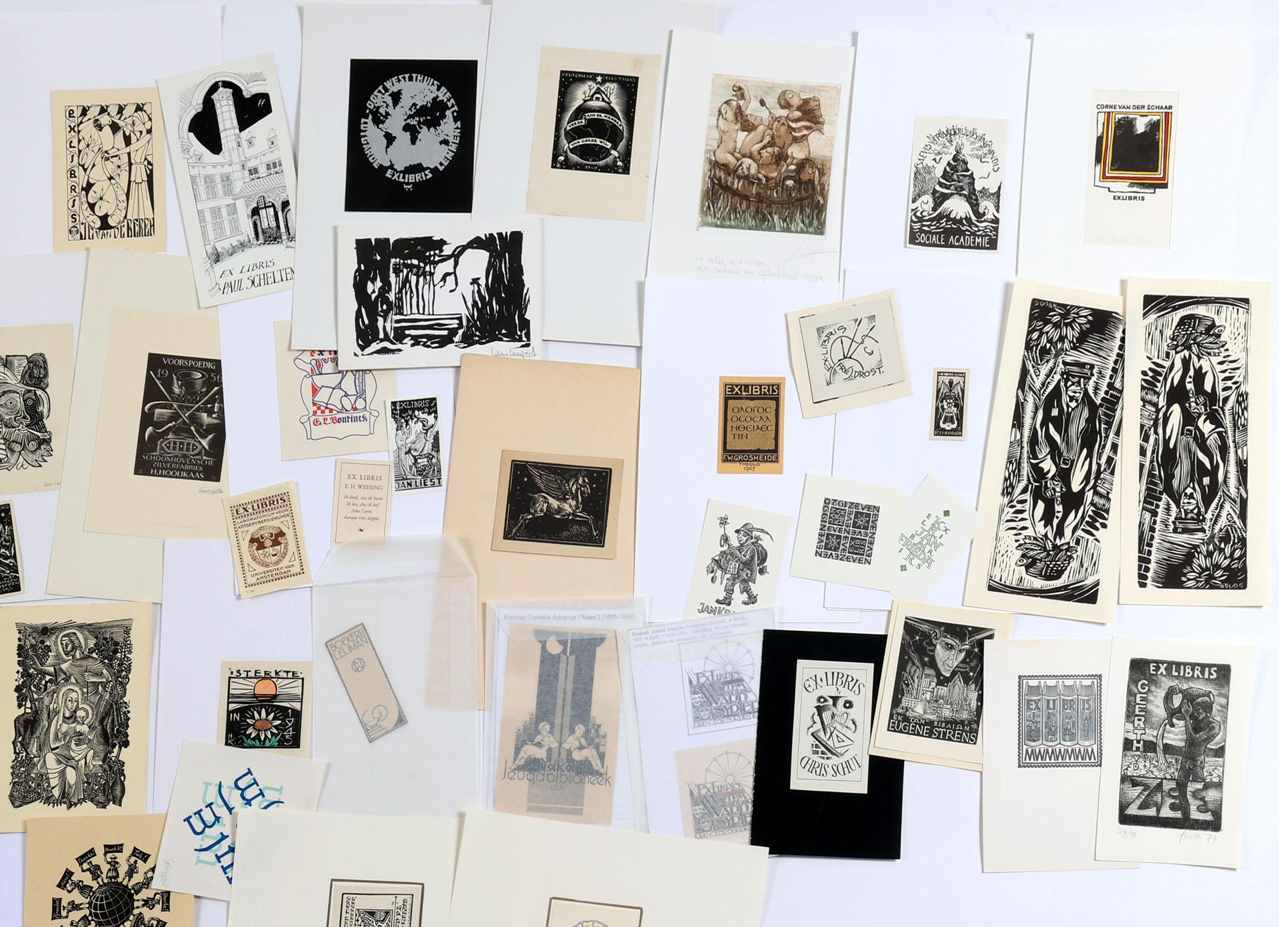 collectie van 150 Nederlandse exlibris / kleingrafiek, voornamelijk hoogdrukken, deels gesigneerd, deels opgeplakt. Gemaakt door o.a. Bieruma Oosting, M. de Zaayer, Strik, Van Gelder, Sleper, Zwiers, Bulder, Mees, Doeve, O. Dicke, Wetselaar.