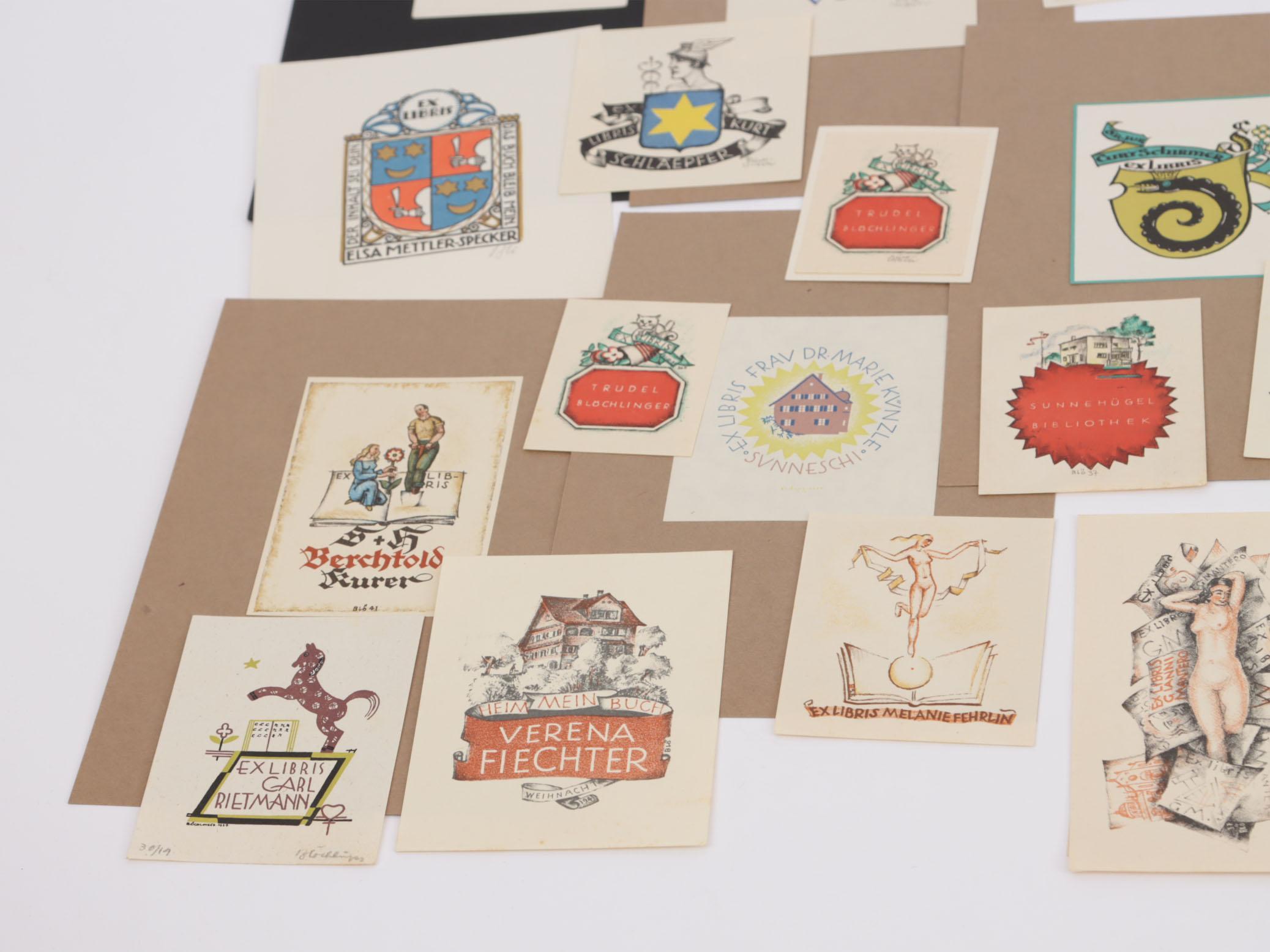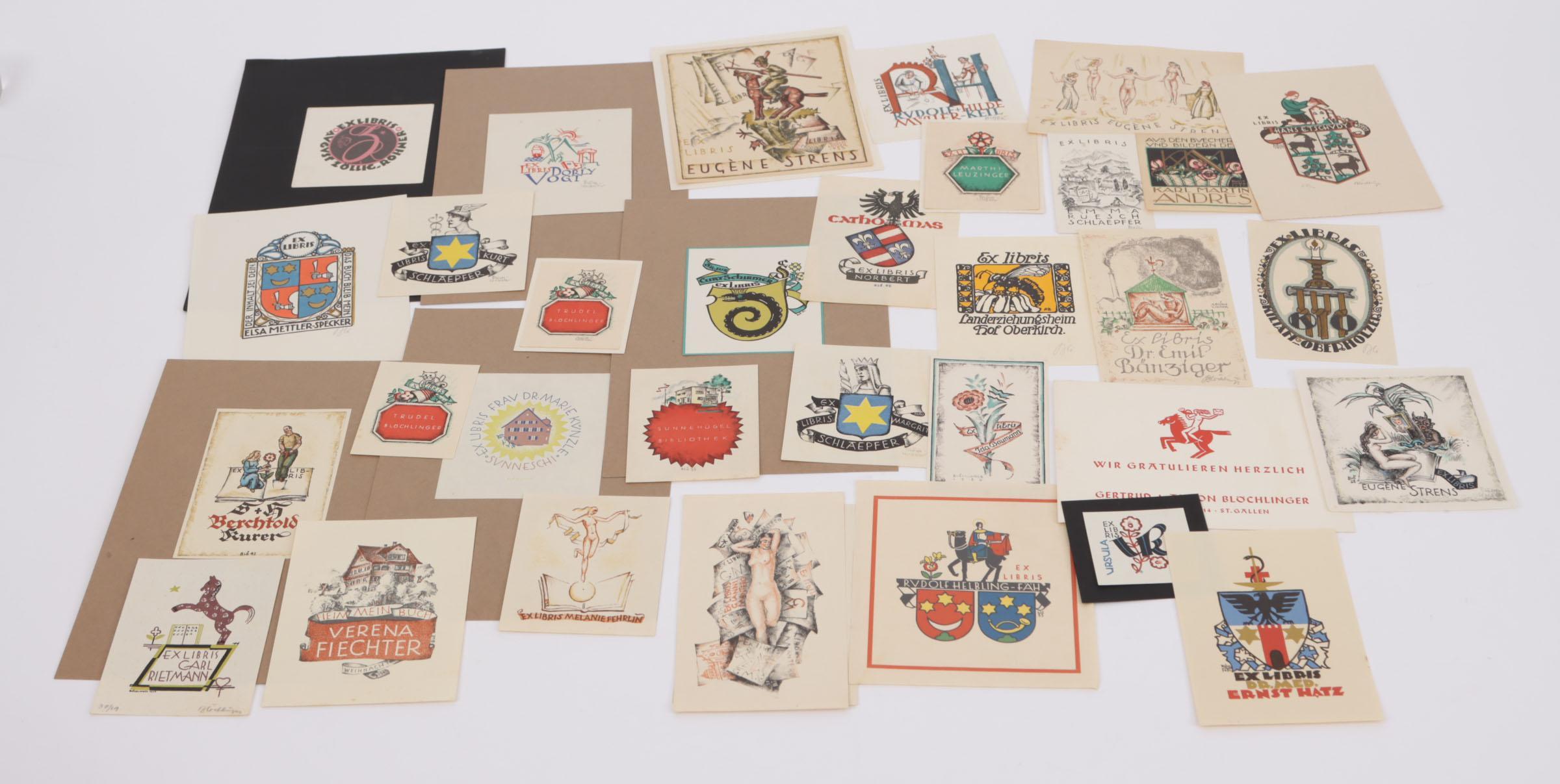 Bloechlinger, A., 37 exlibris / kleingrafiek, litho (vaak meerkleuren), deels gesigneerd, deels opgeplakt. Bevat enkele doubletten. O.a. voor Schirmer, Mettler, Kurer, Vogt, Keller, Bersinger, Kern.