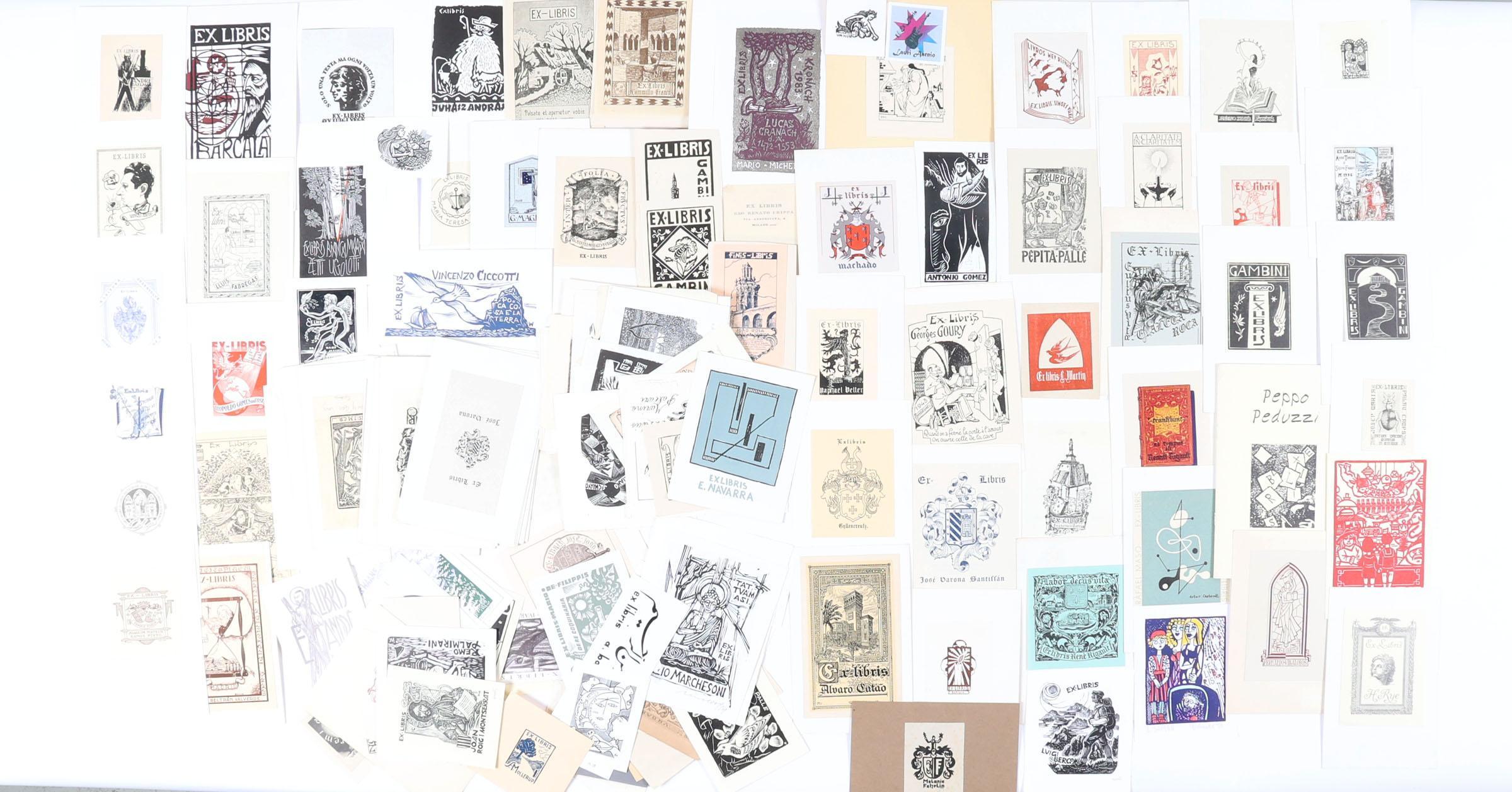 collectie van plm. 150 exlibris / kleingrafiek, gemaakt door kunstenaars uit Italië, Spanje, Frankrijk, Portugal. Hoogdruk / vlakdruk. Deels opgeplakt, deels gesigneerd. Gemaakt door o.a. Zetti, Wolf, Gambini, Burzi.