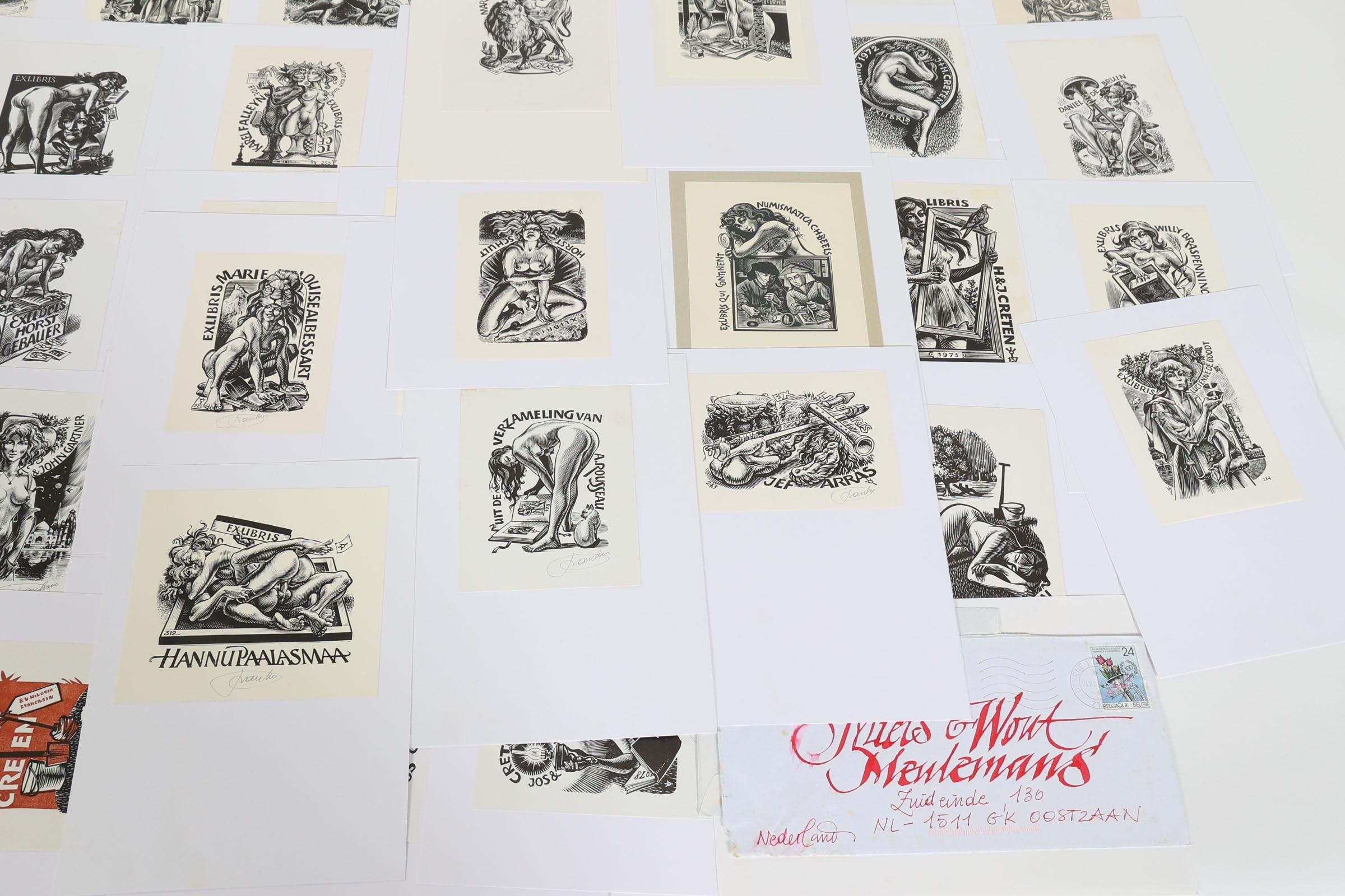 Damme, F.-I. van, 75 exlibris, X2, deels gesigneerd, opgeplakt. Deels erotisch / vrouwelijk naakt.
