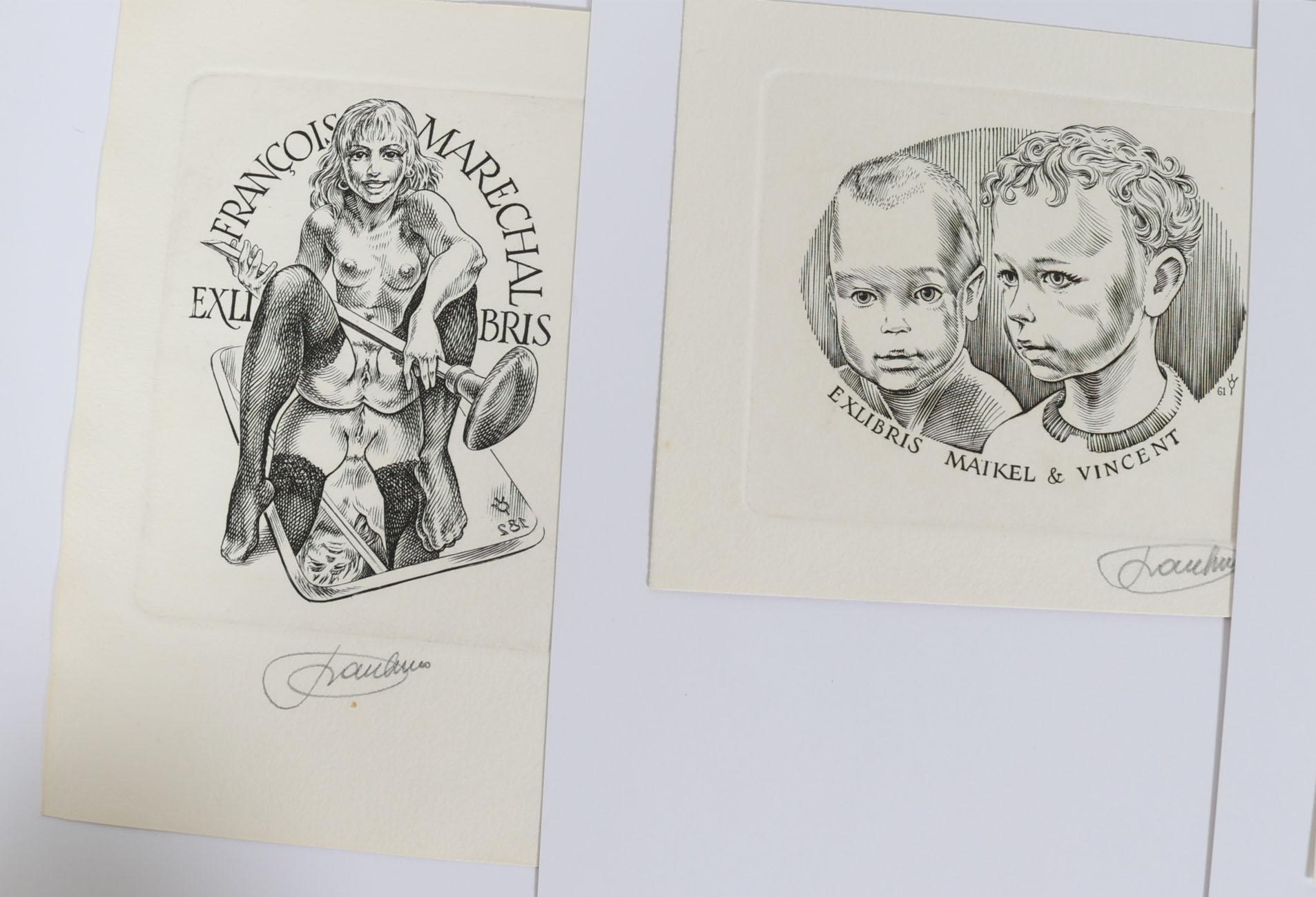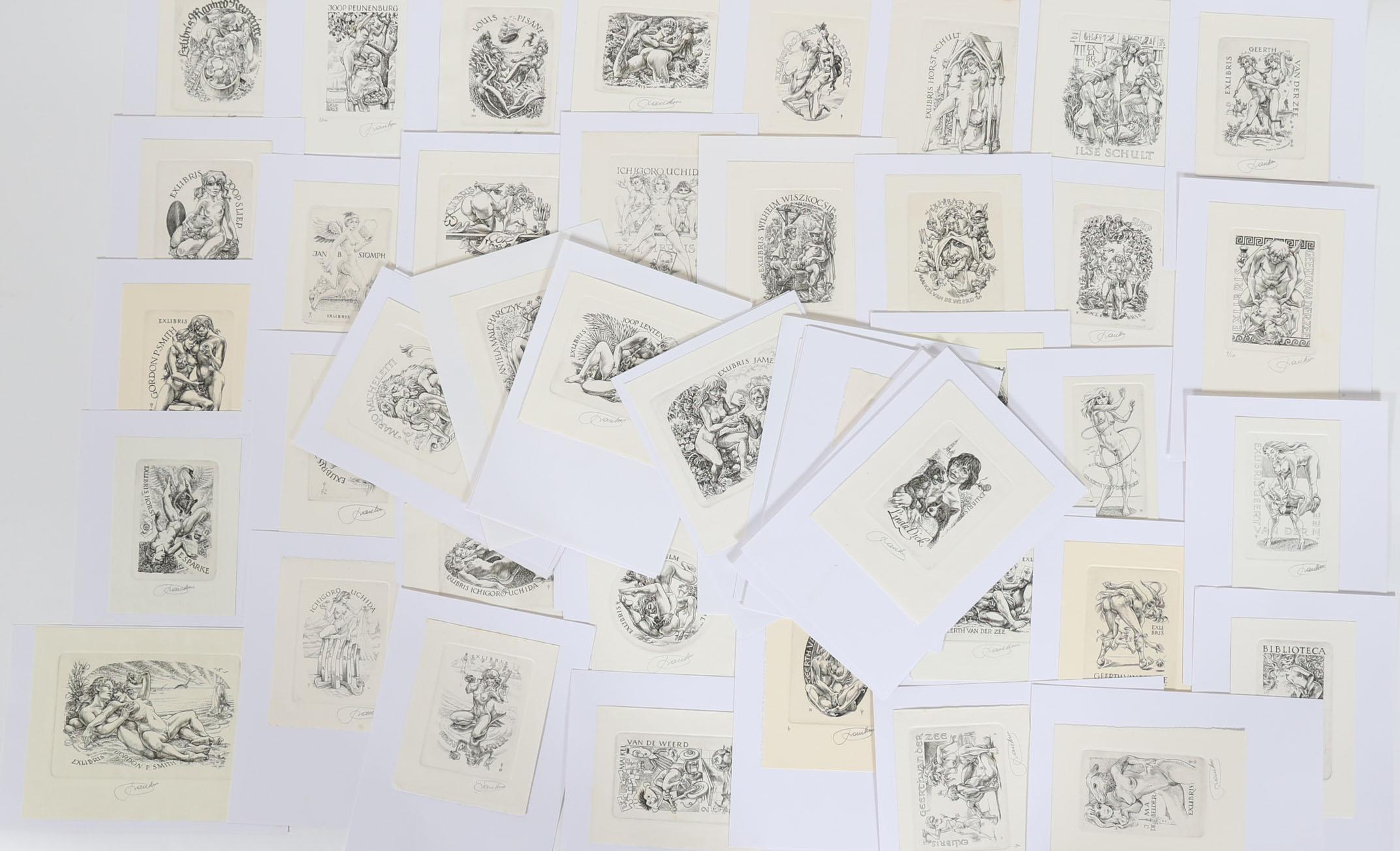 Damme, F.-I. van, 56 exlibris, C2, gesigneerd, opgeplakt. Deels erotisch / vrouwelijk naakt.