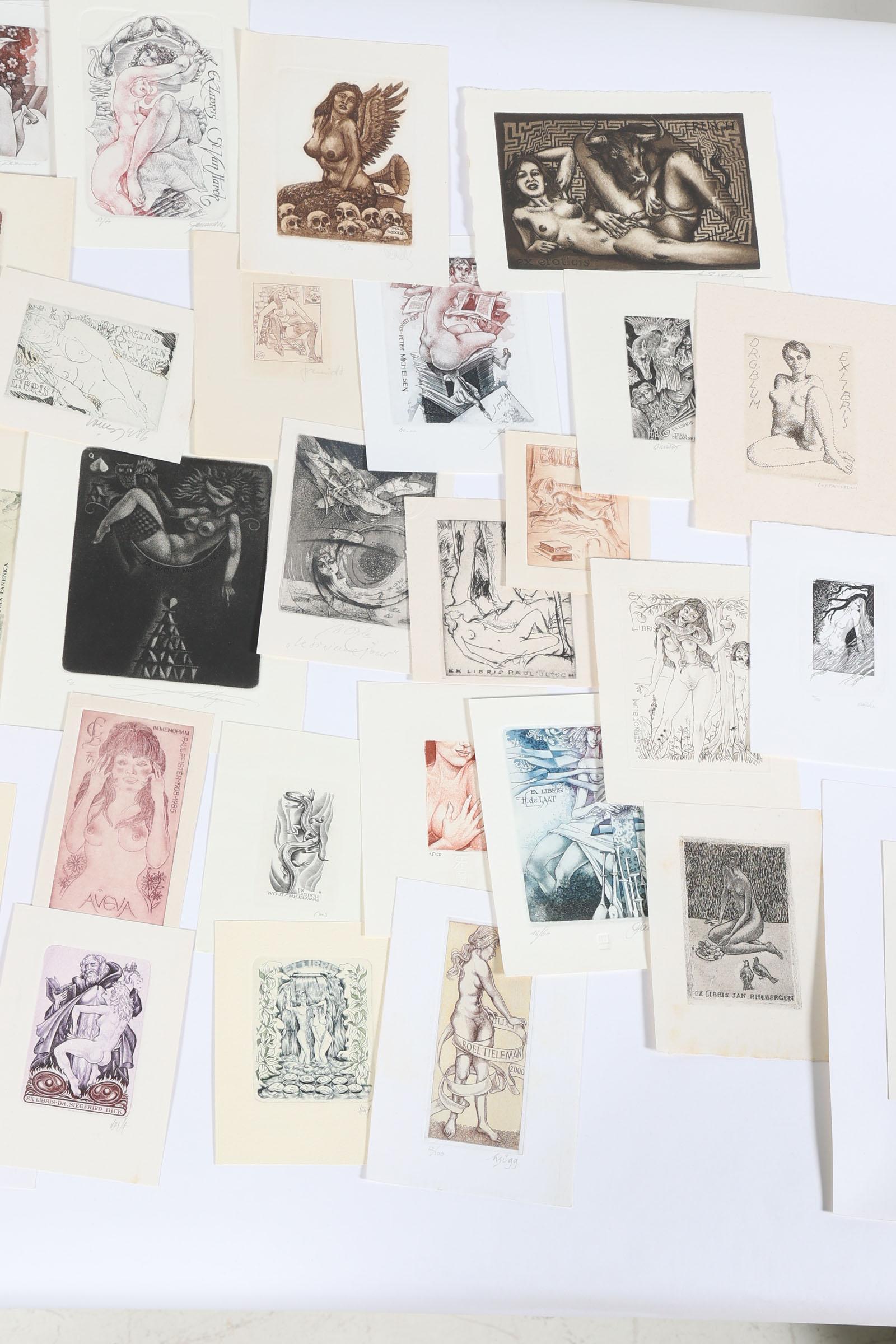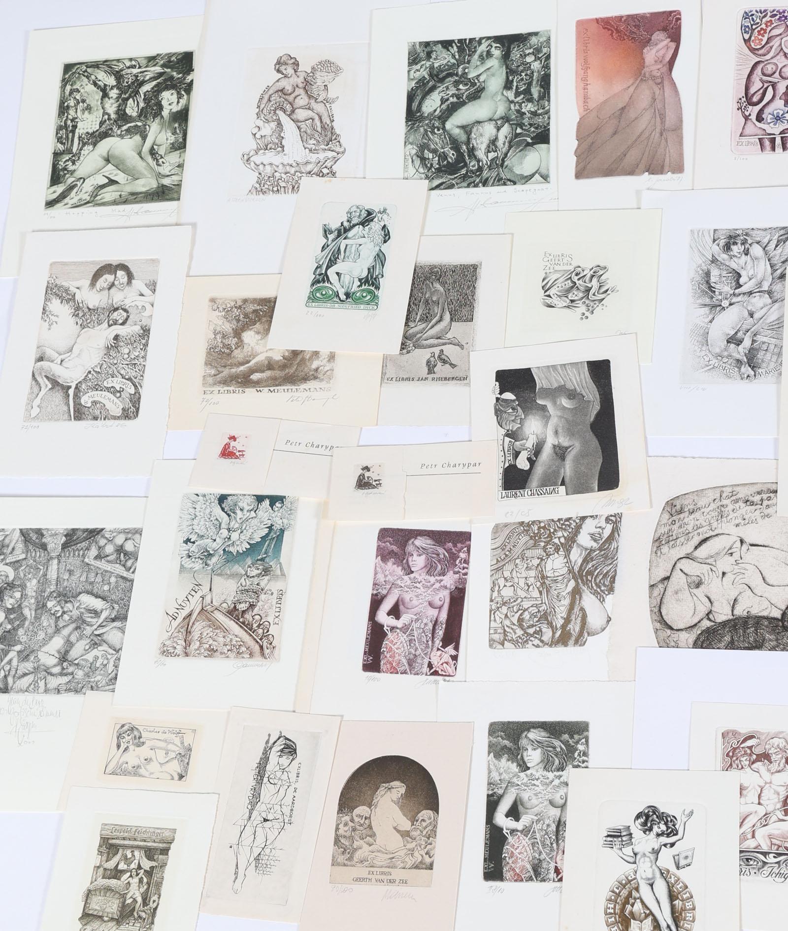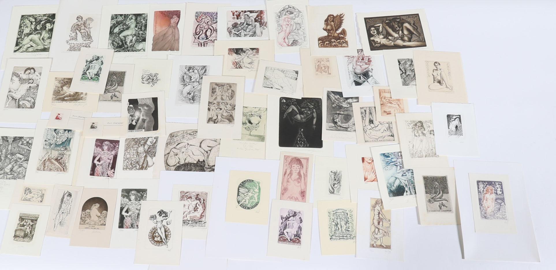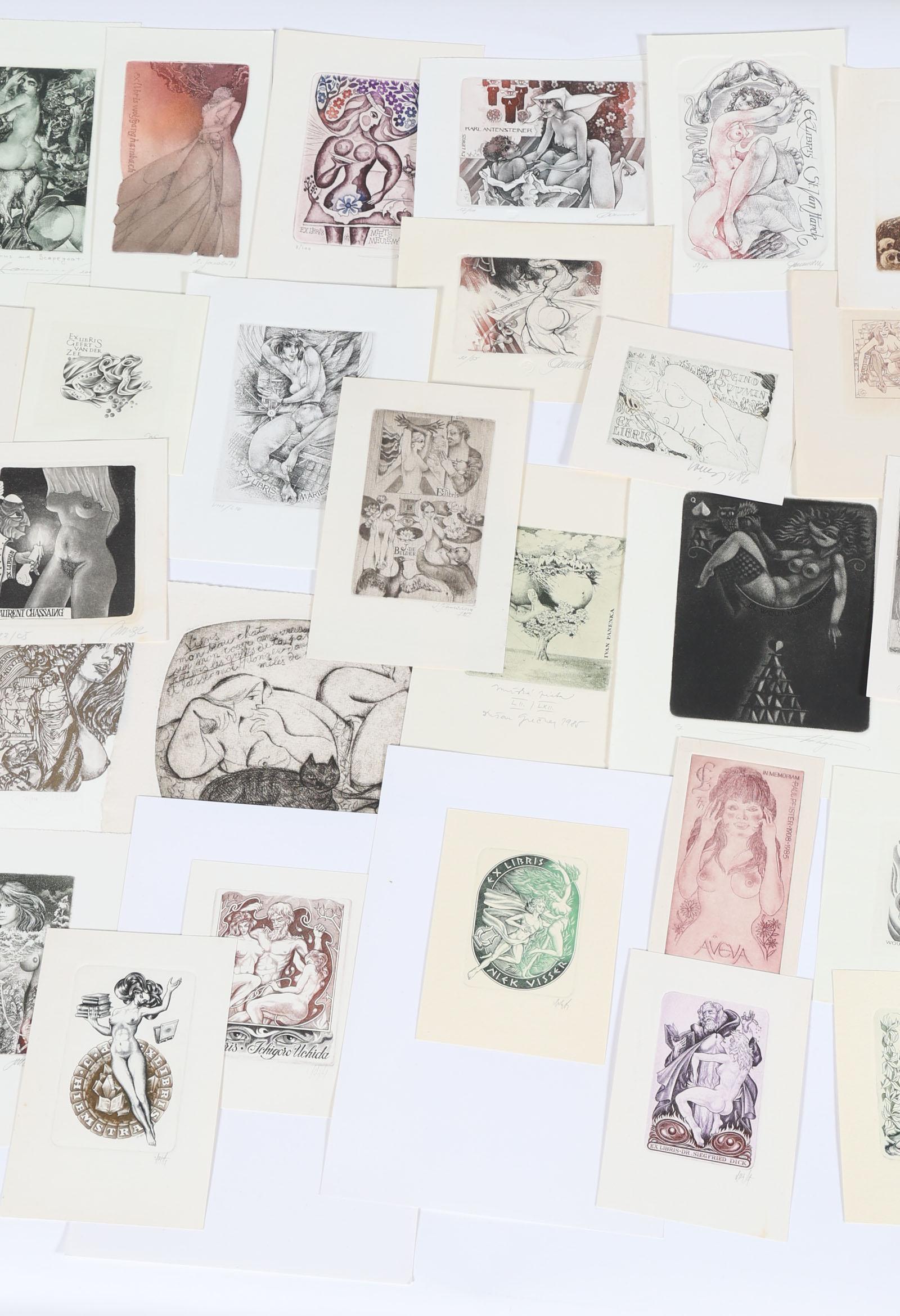 collectie van 50 exlibris / kleingrafiek, thema: vrouwelijk naakt / erotiek, diepdrukken (C2, C3 etc.). Deels genummerd en gesigneerd, deels opgeplakt (geweest). Gemaakt door o.a. Pauwels, Jakubowski, Stettner, Jacobs,Hampl, Kabrt, Ivanov, V. Vereschagin, Dudek, Jakstas, Okas, Schmidt, Balon, Juergens.