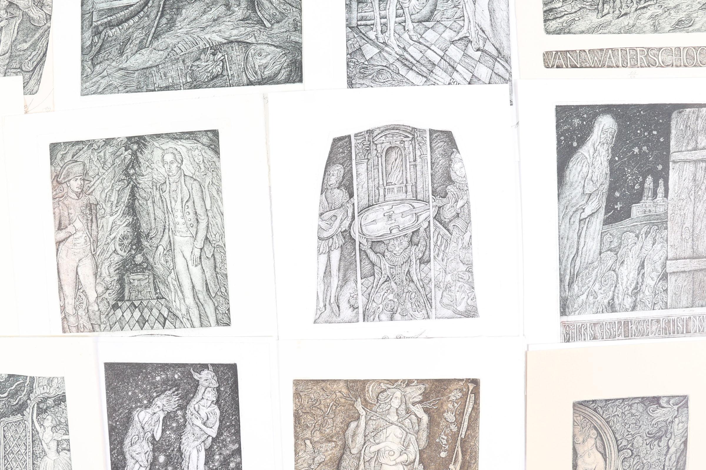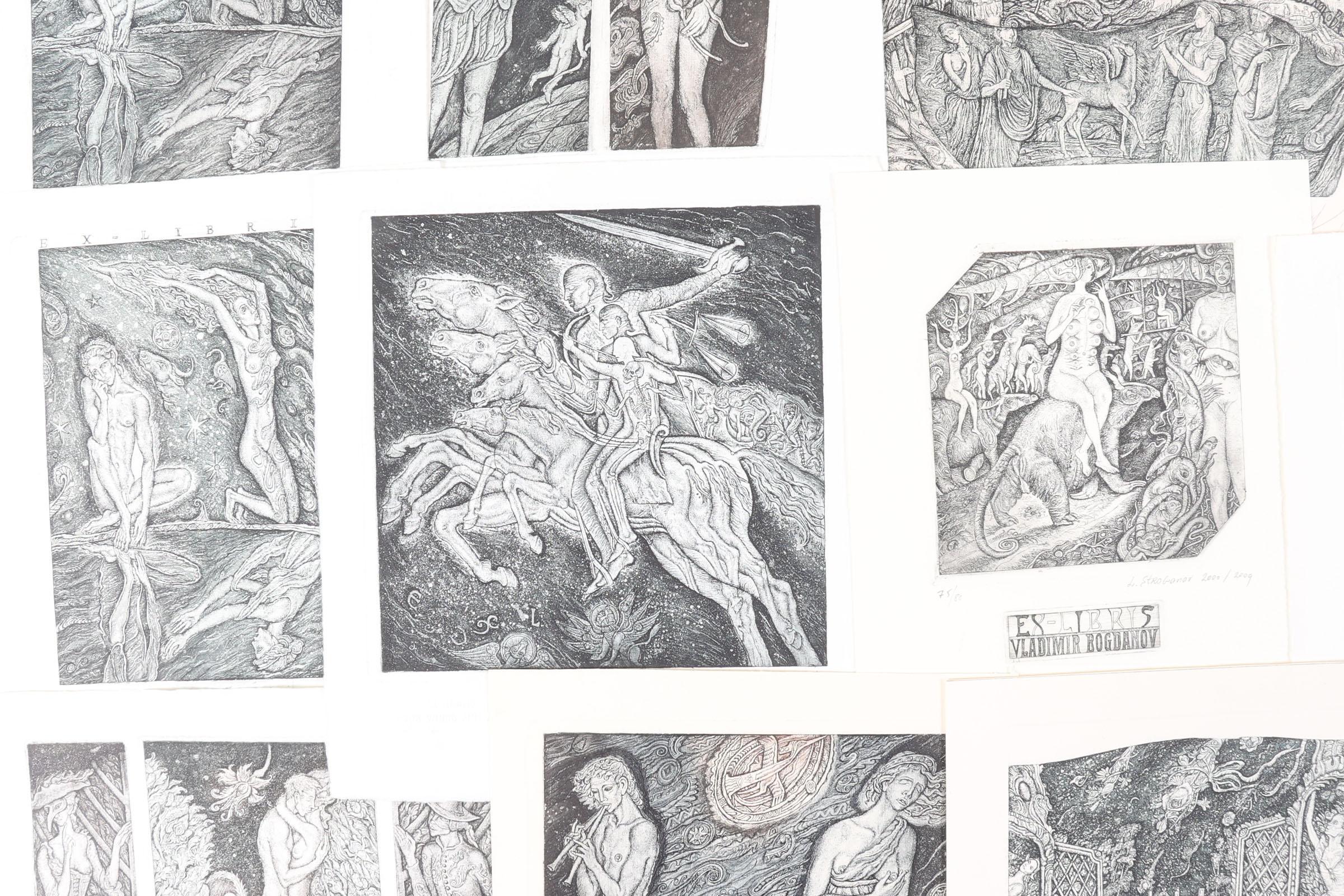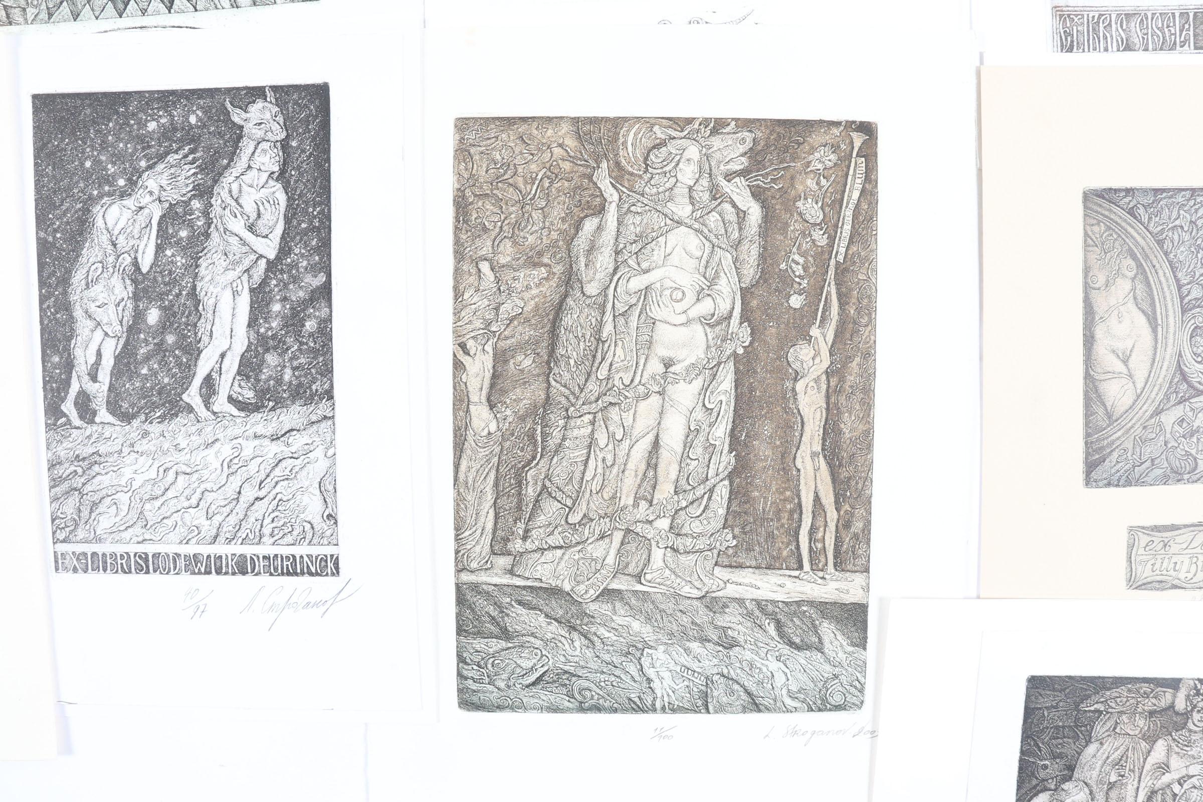 Stroganov, L., 21 exlibris, C3C5, genummerd en gesigneerd, deels opgeplakt. O.a. voor Deurinck, Viaene, Blum, Bogdanov, 4 winds, Van Waterschoot, Carlone, Vissers, Meulemans