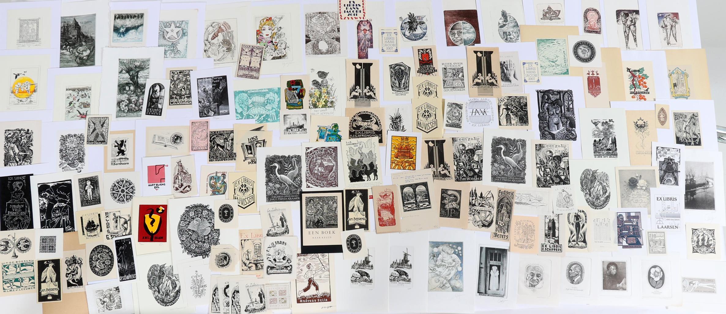 collectie van plm. 135 exlibris / kleingrafiek, gemaakt door Nederlandse kunstenaars. (100 x hoogdruk / vlakdruk, 35 x diepdruk). Deels gesigneerd, deels opgeplakt (geweest). Gemaakt door o.a. E. de Koster, Steenvoorden, Leeflang, Van Vlijmen, Lindeman, Wetselaar, Labots, Van Luyn, Rueter.