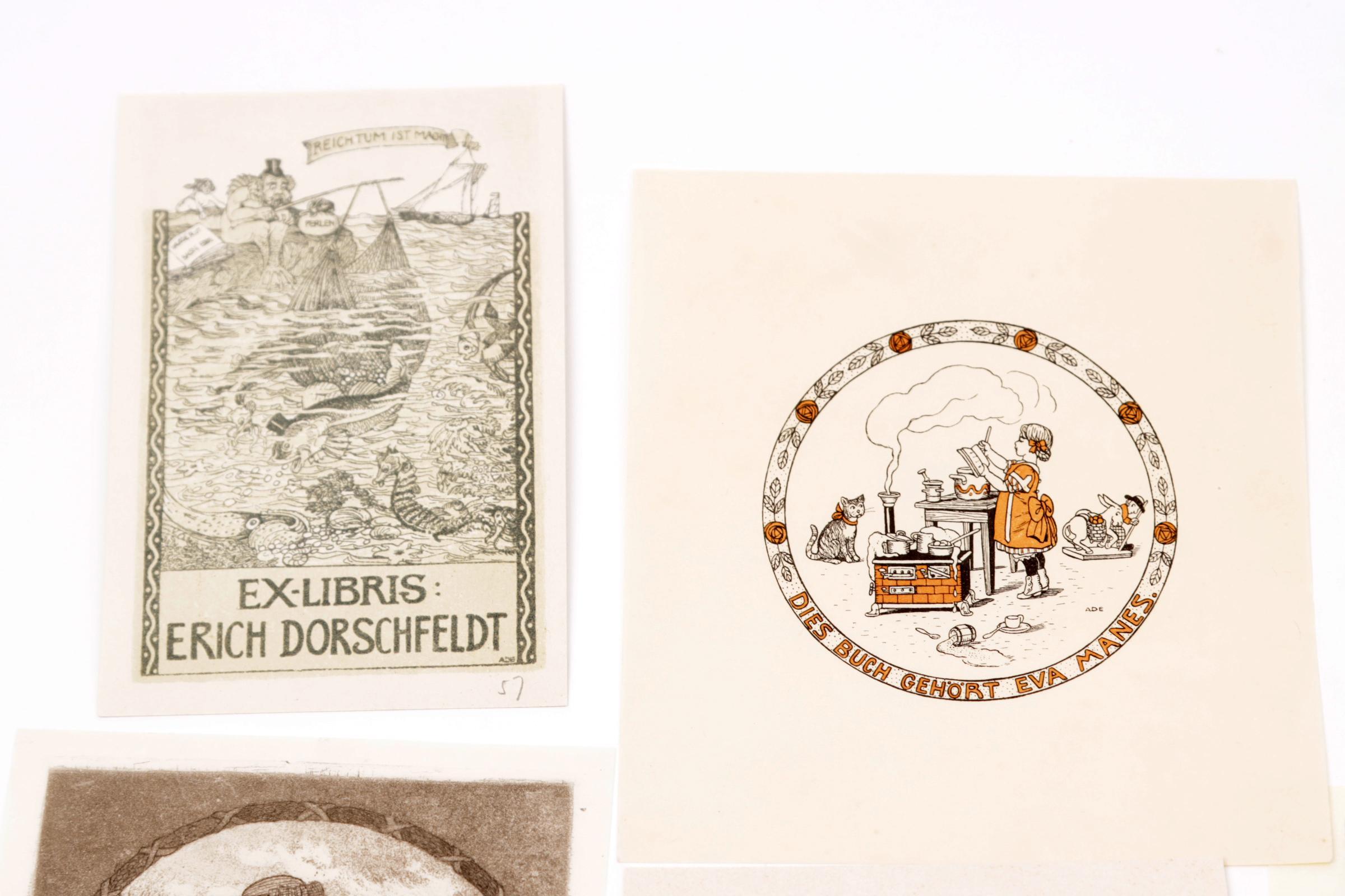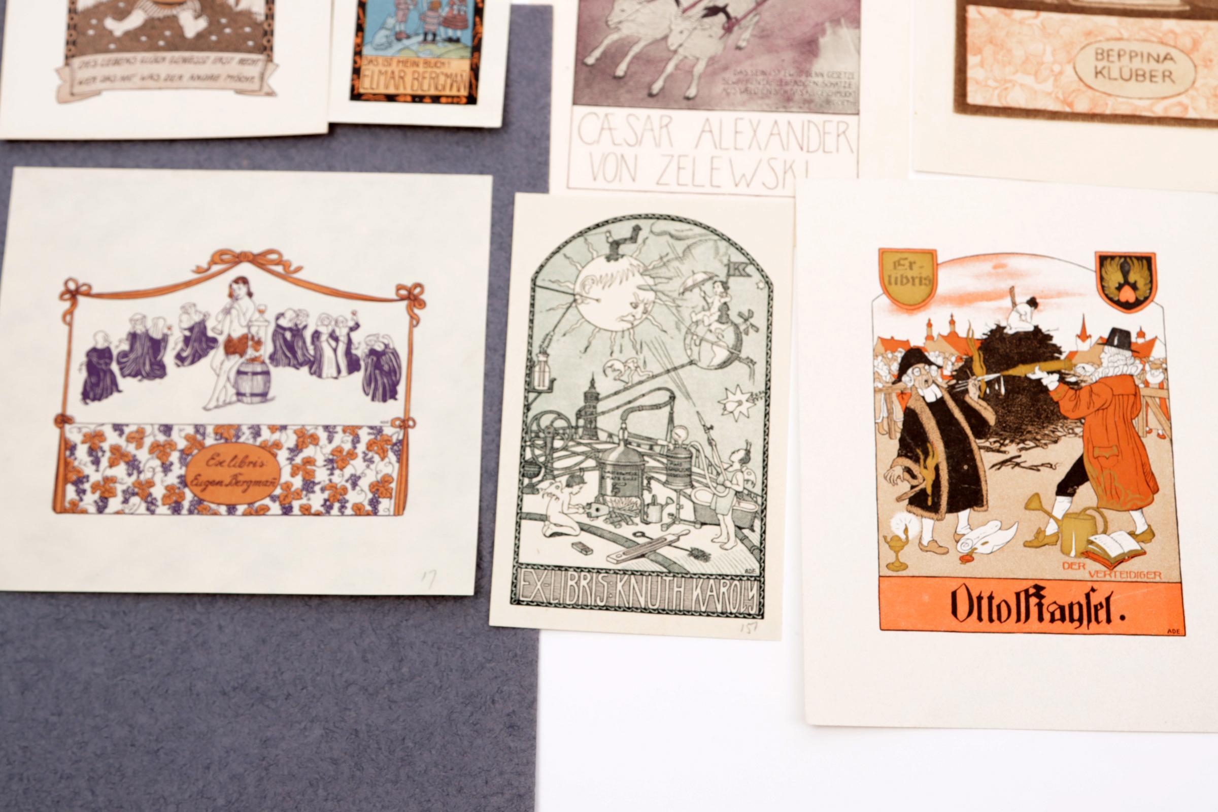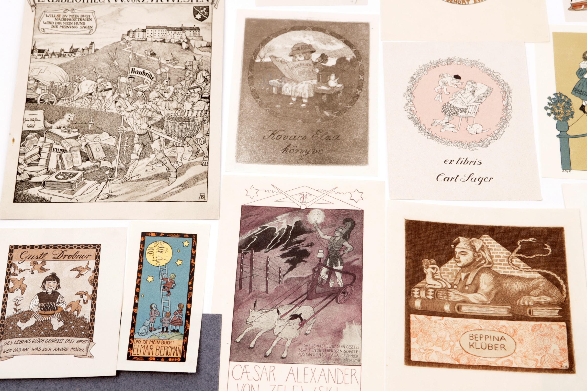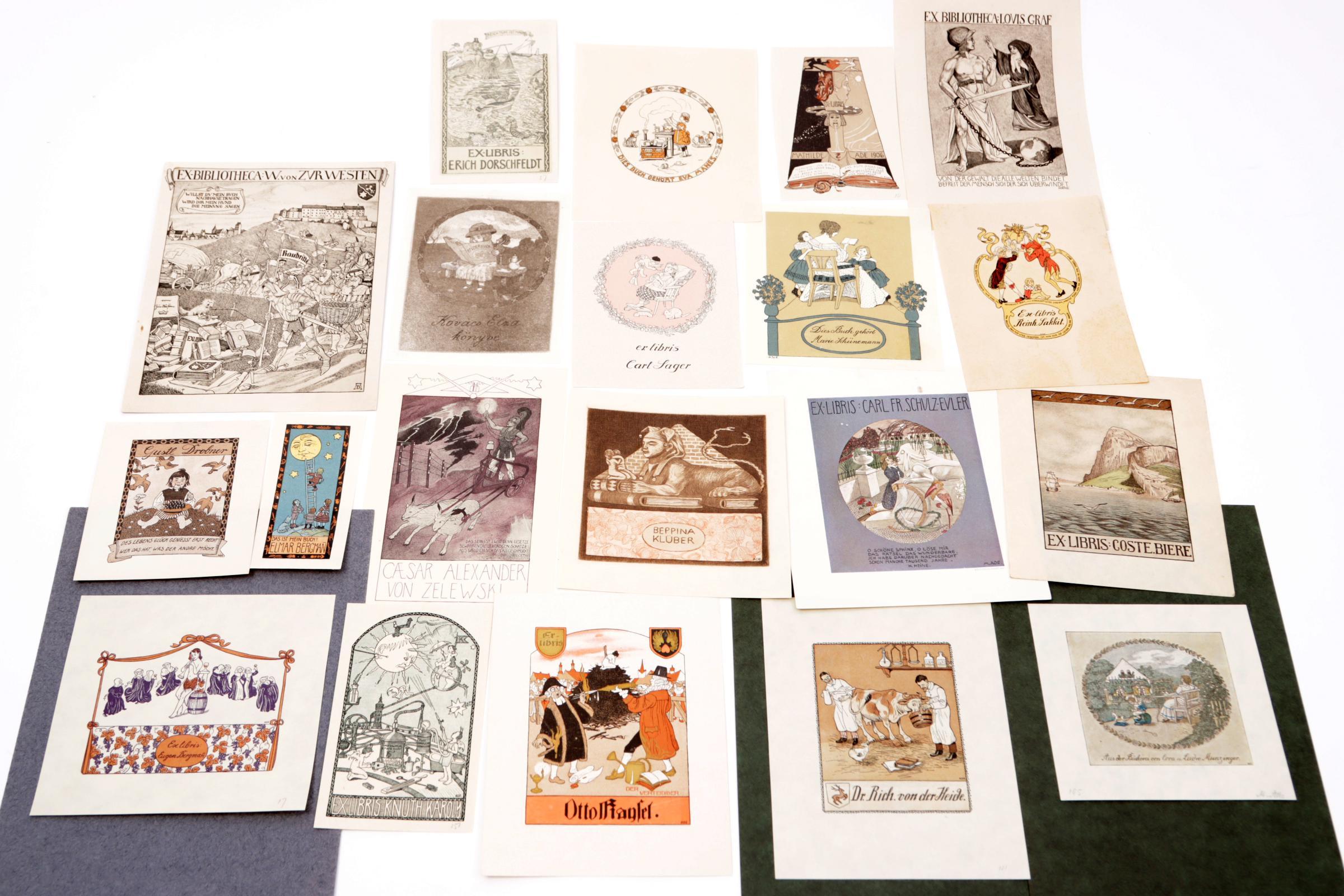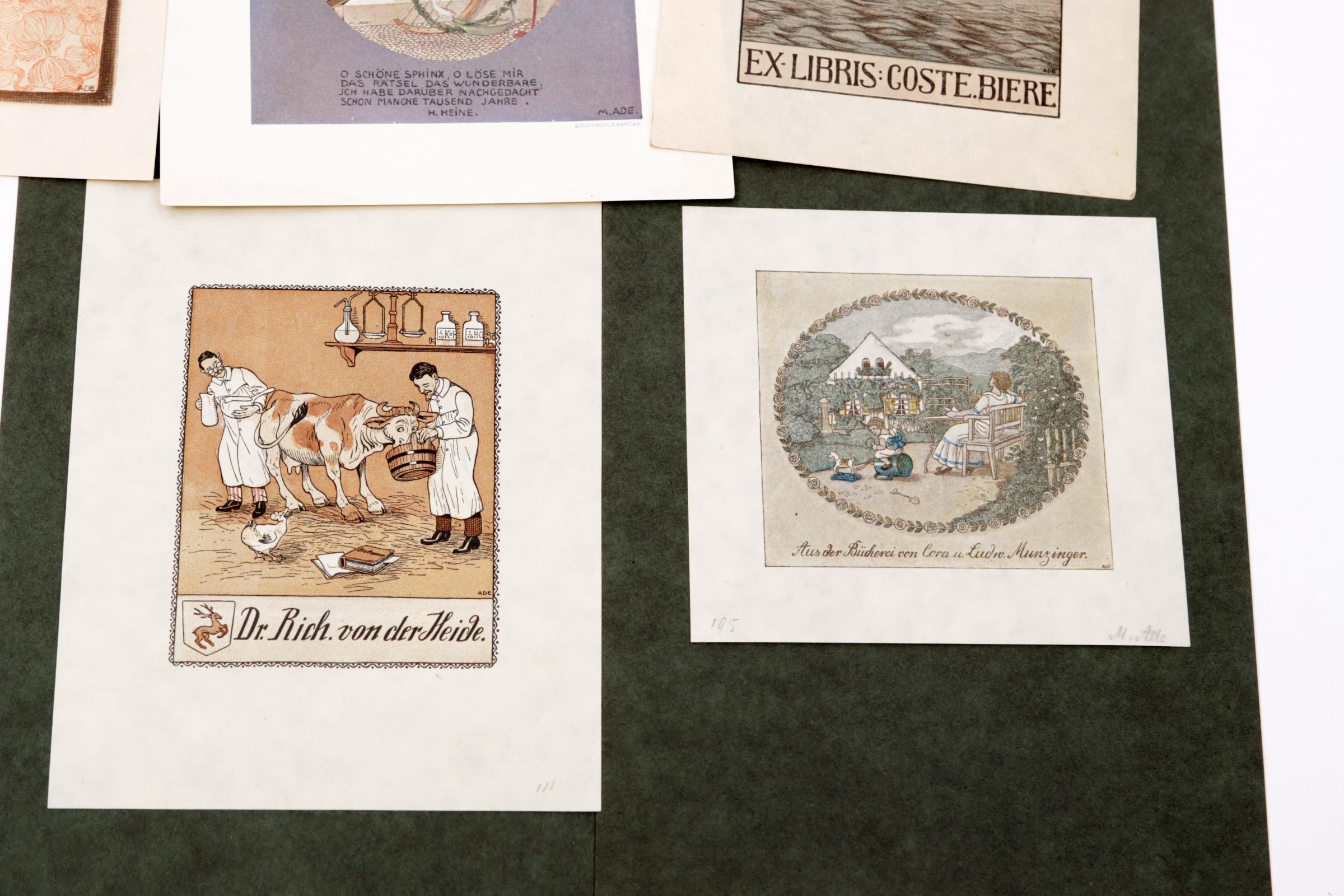 Ade, M., 20 exlibris, cliché (meer kleurig), niet gesigneerd, deels opgeplakt (geweest)