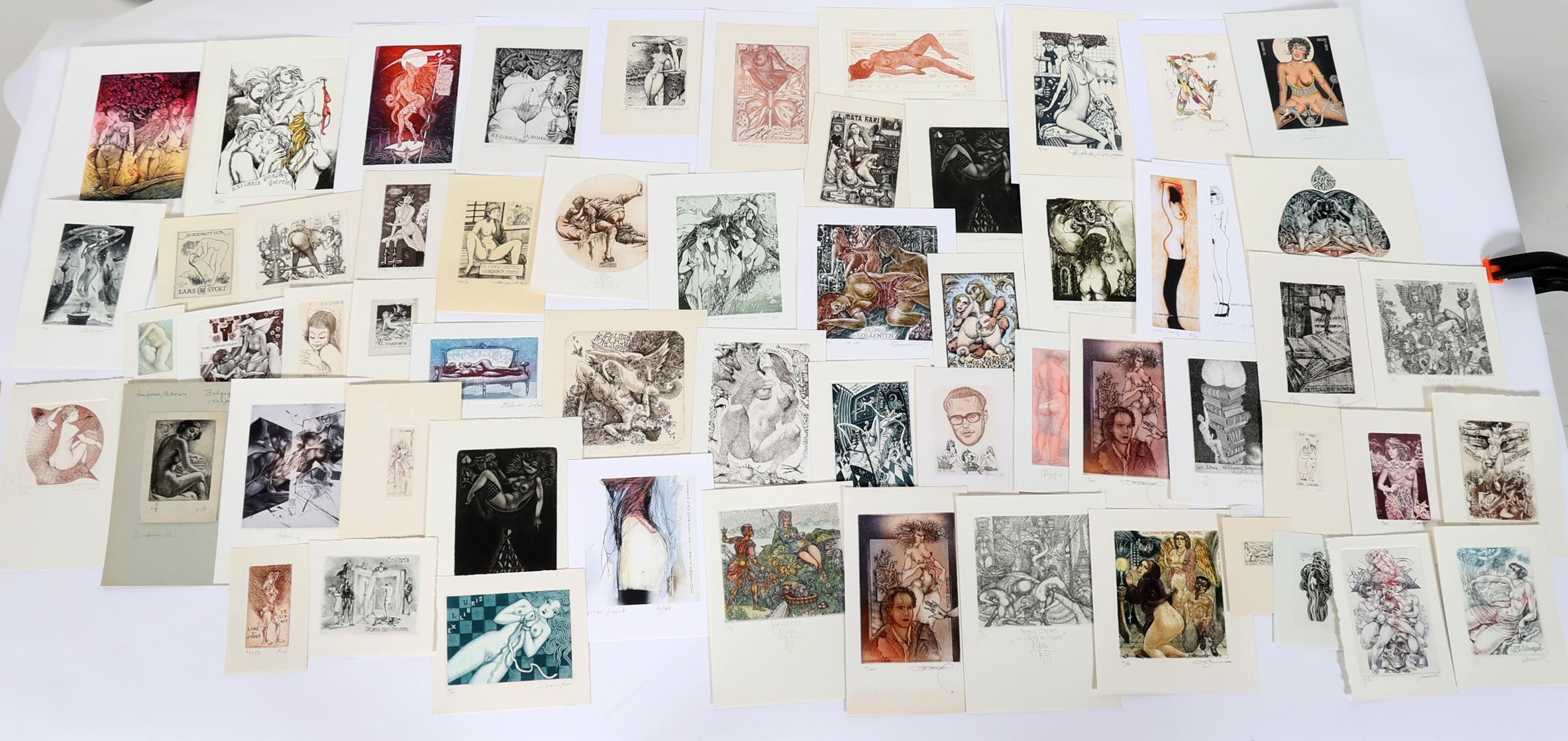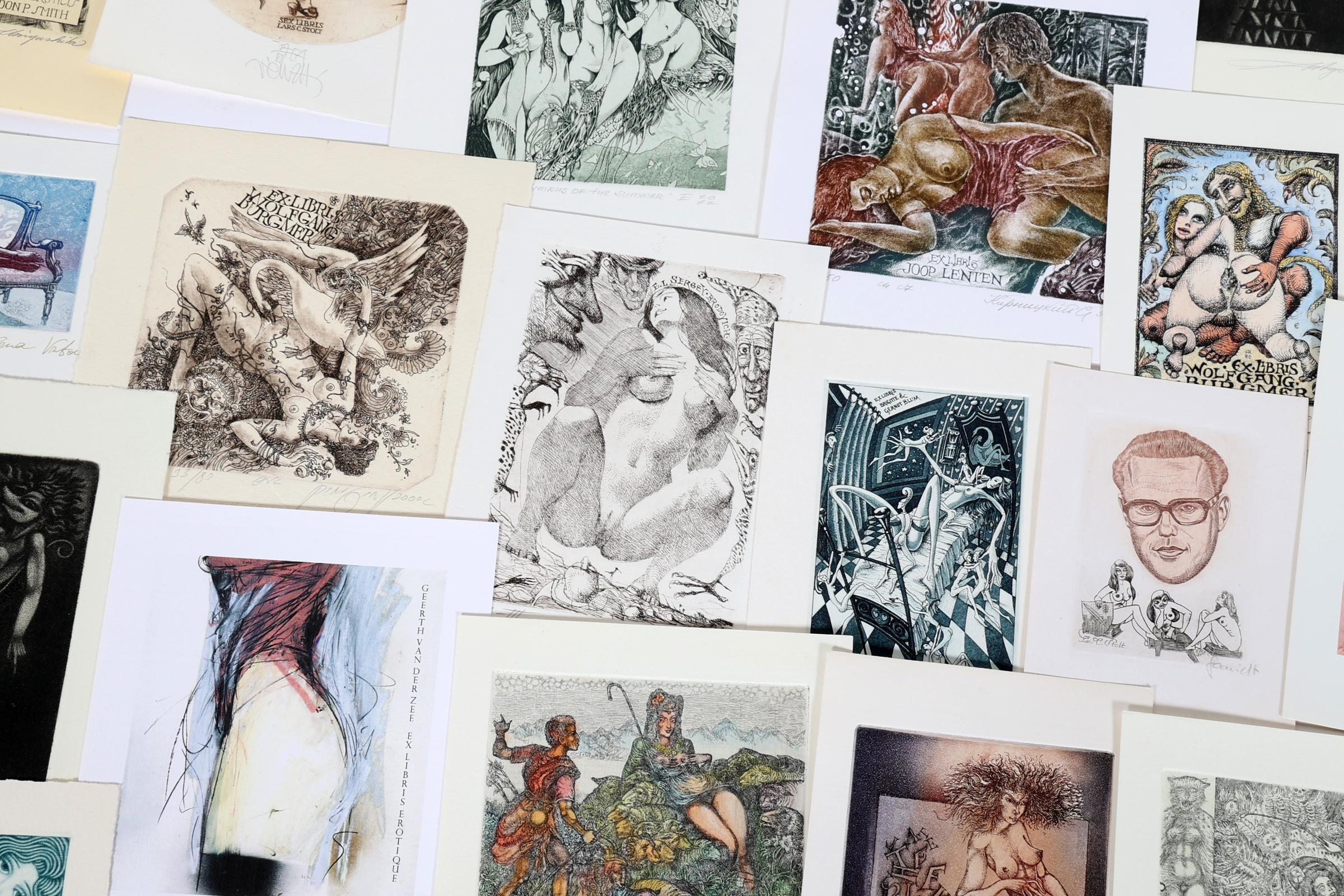 collectie van plm. 60 exlibris / kleingrafiek, thema: vrouwelijk naakt / erotiek. Diepdruk , vlakdruk. deels gesigneerd, deels opgeplakt. Gemaakt door o.a. Kvartelny, Nesterchuk, Ven, Vereschagin, Velikov, Schroth, Vutova, Polacovic, Dufour, De Vries, Rovegno, Nik Dad, Pauwels.