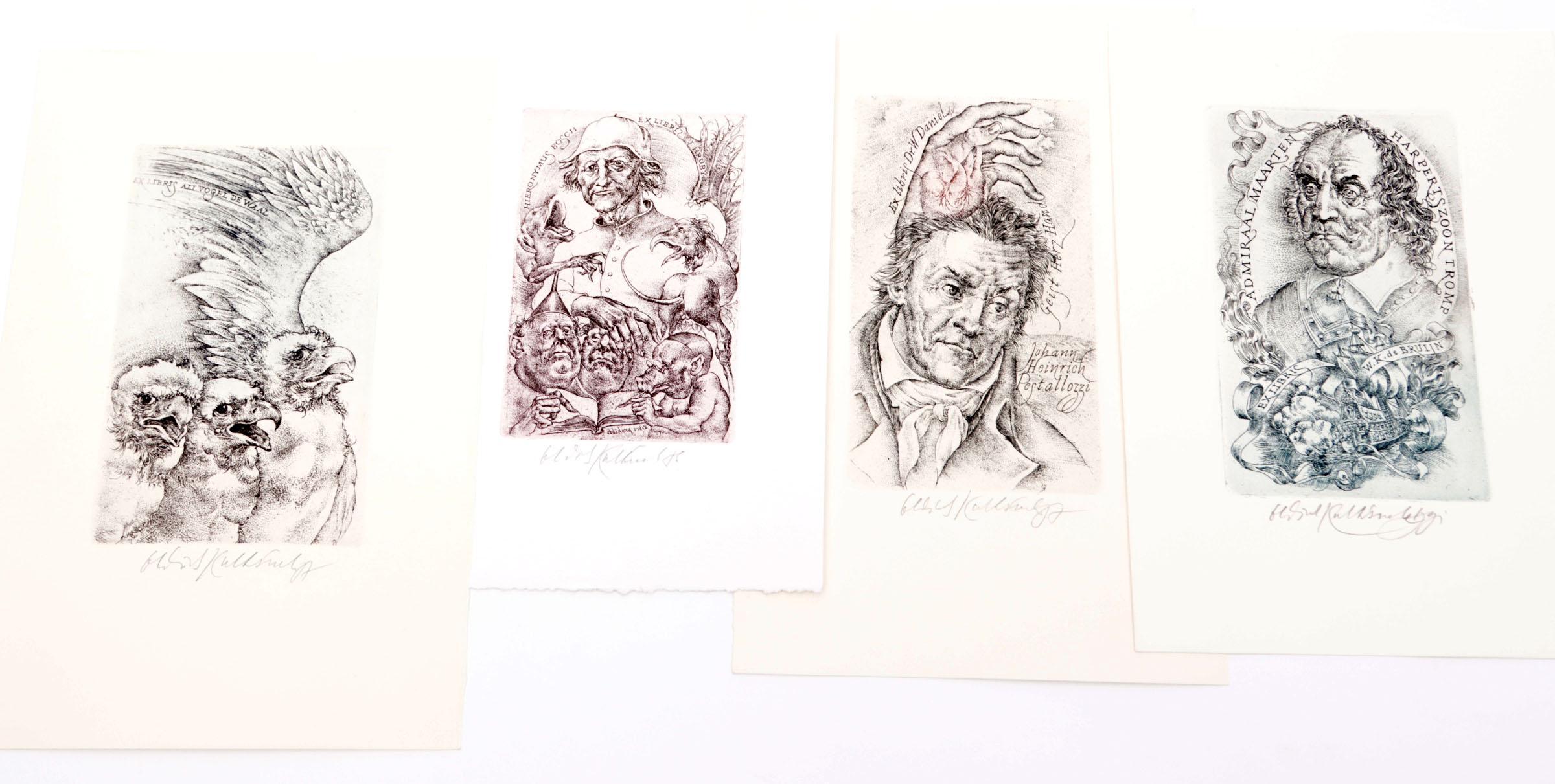 Kulhanek, Oldrich, 4 exlibris, C3, gesigneerd. Voor Vogel- de Waal, Hruby (Bosch), de Bruijn (Tromp), Daniel (Pestalozzi)