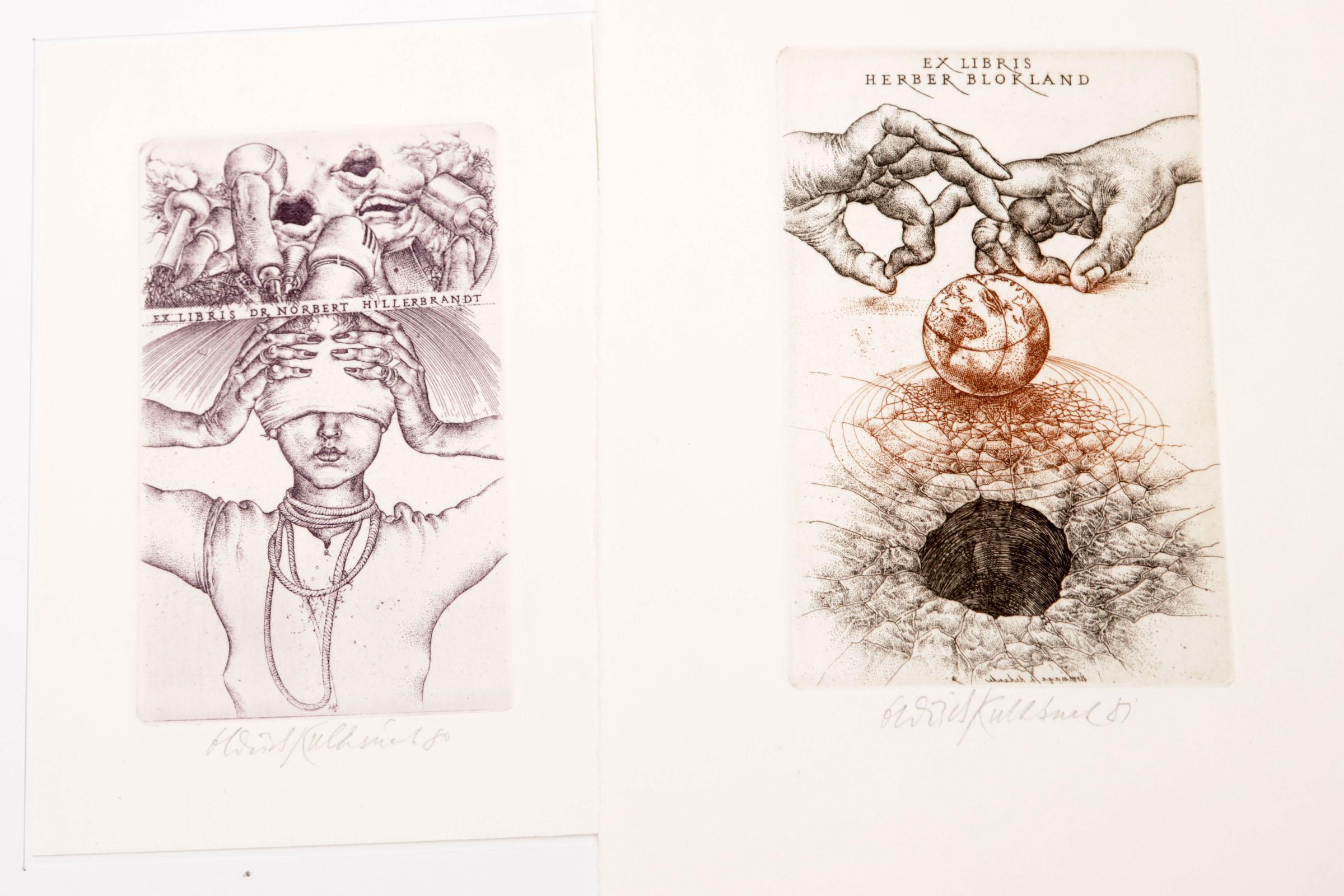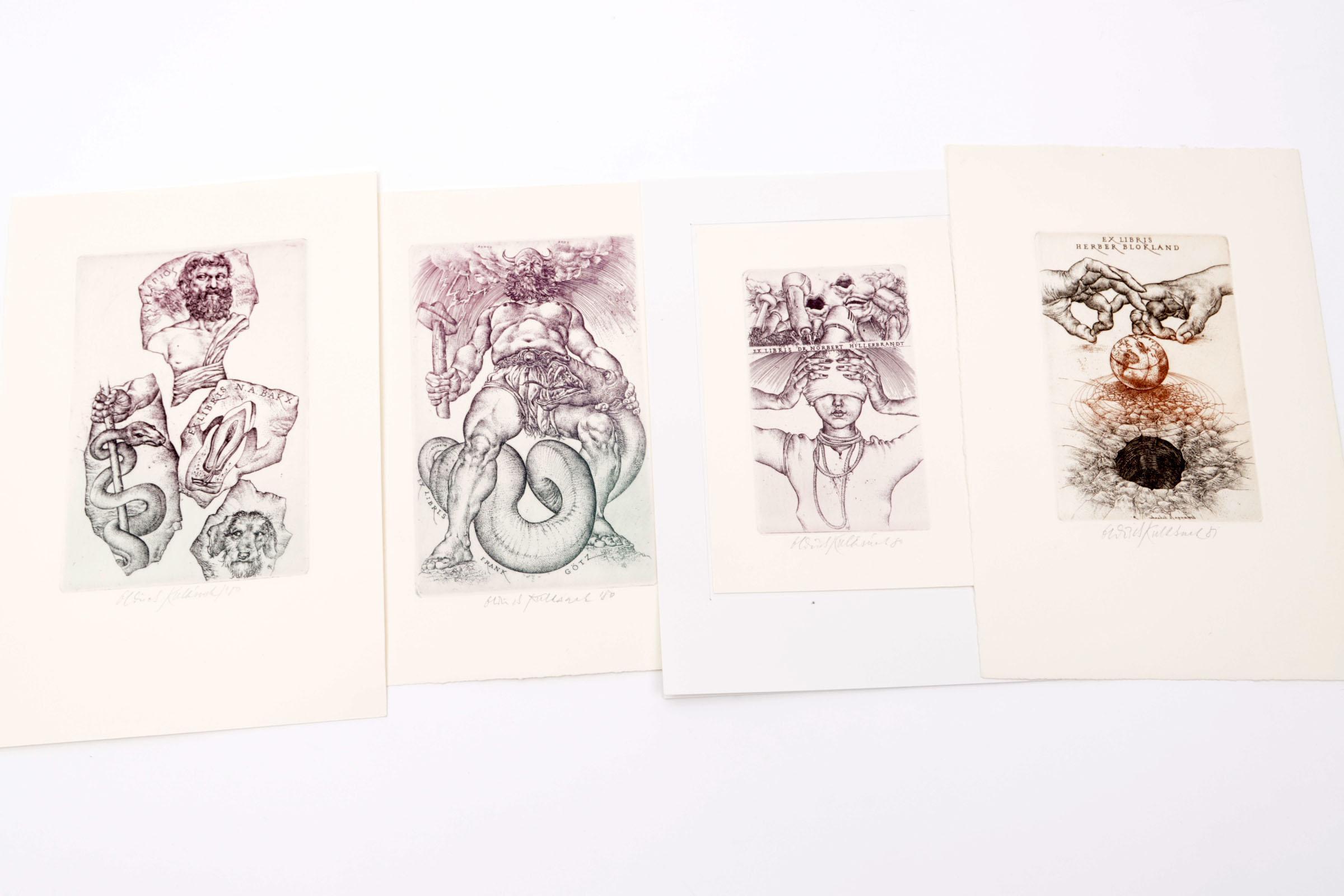 Kulhanek, Oldrich, 4 exlibris, C3, gesigneerd. Voor Hillerbrandt (opgeplakt), Gotz (Donar), Blokland, Bakx (medisch)