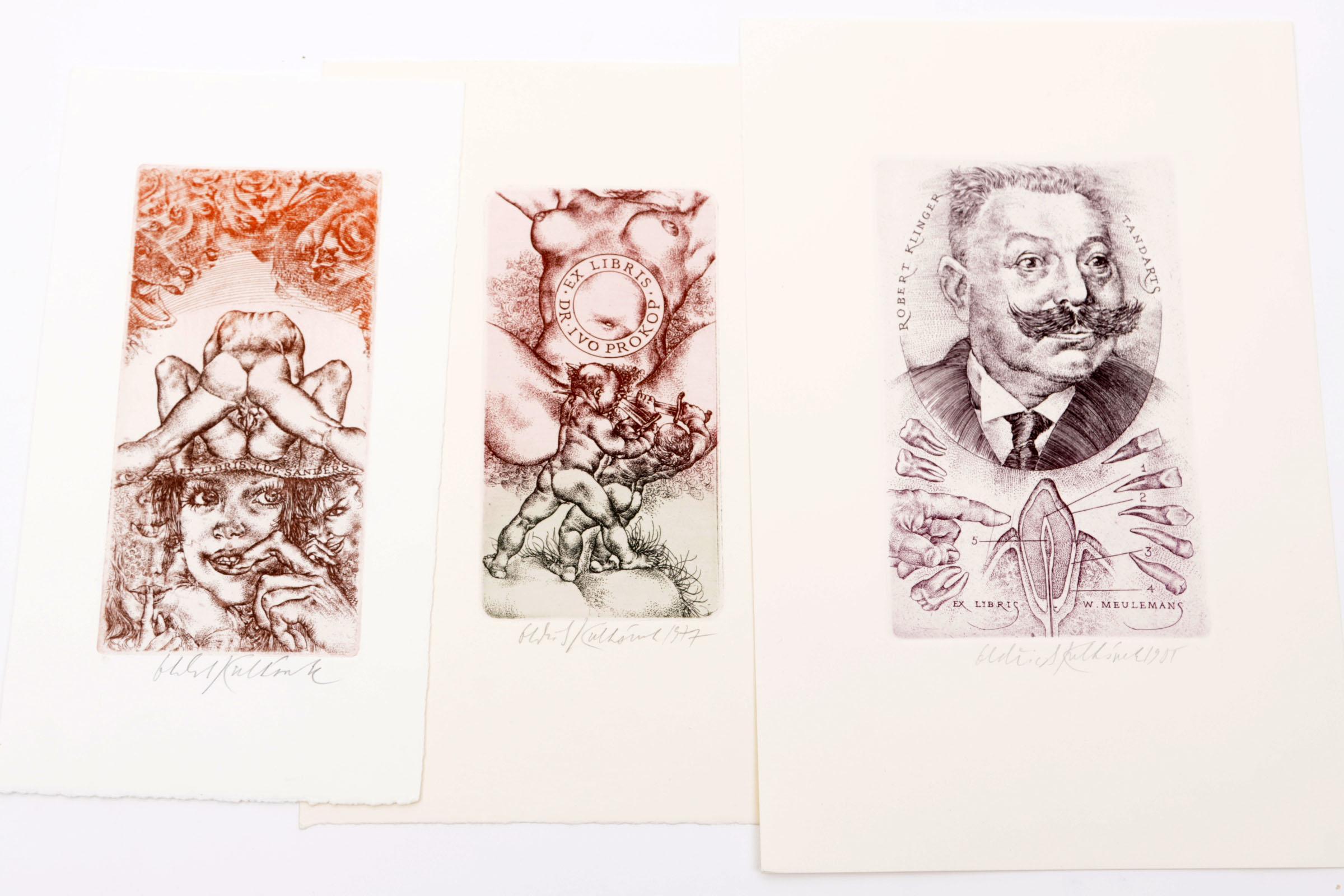 Kulhanek, Oldrich, 3 exlibris, C3, gesigneerd. Voor Sanders (erotisch), Prokop (erotisch), Meulemans (tandarts)