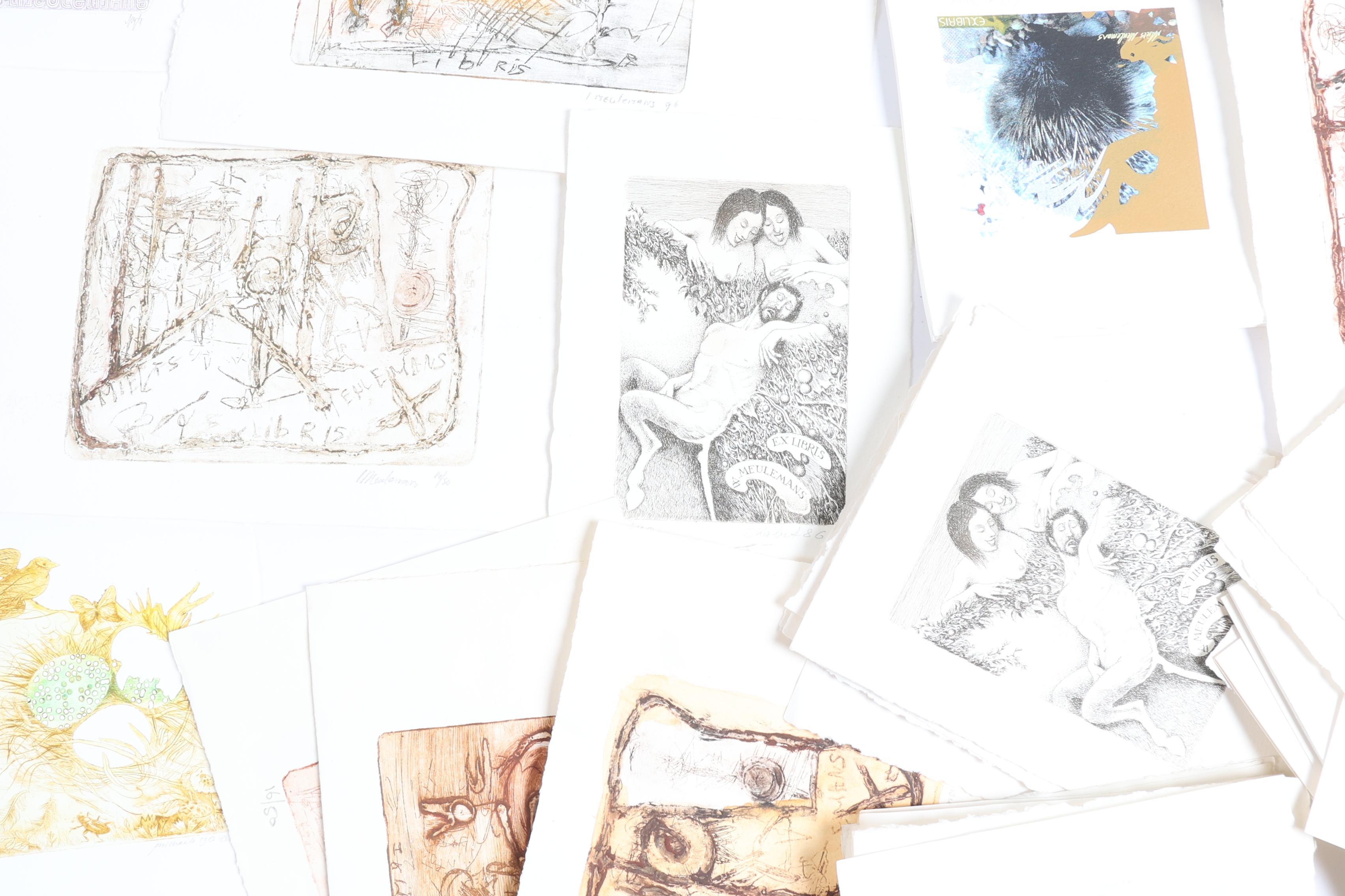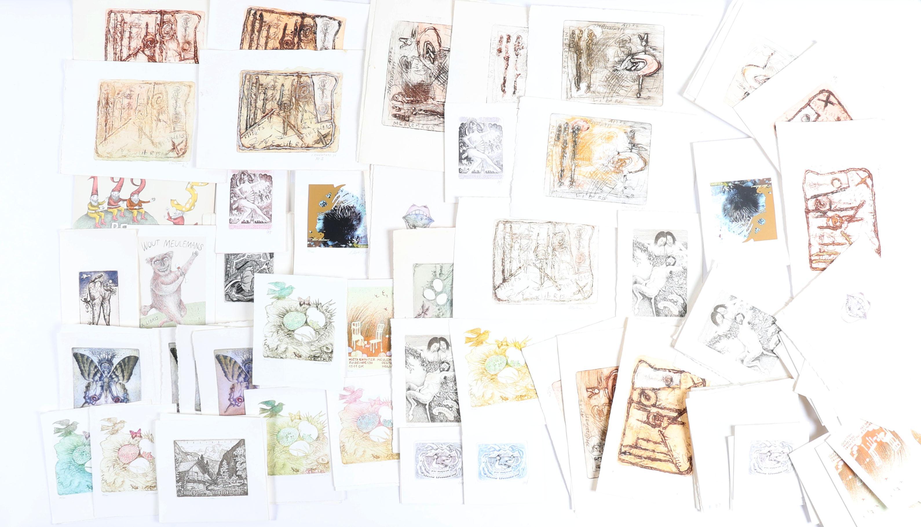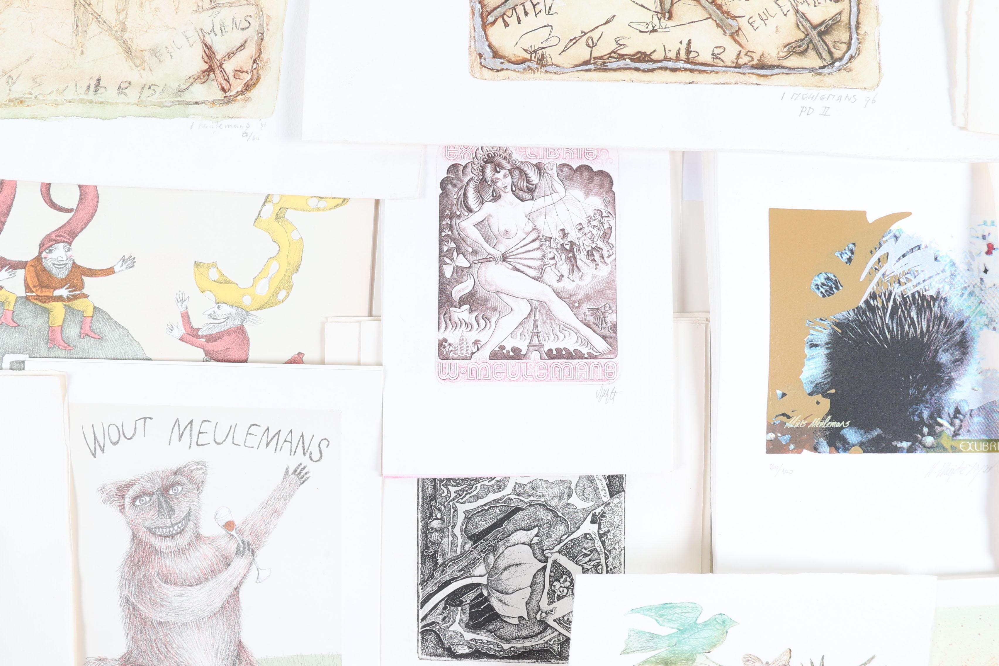 collectie van tientallen exlibris / kleingrafiek op naam van Meulemans, diverse restoplagen, o.a. gemaakt door M. Lesarova, Fr. Joh. Pilz, I. Meulemans. Diverse technieken (diepdruk, litho). Gesigneerd.