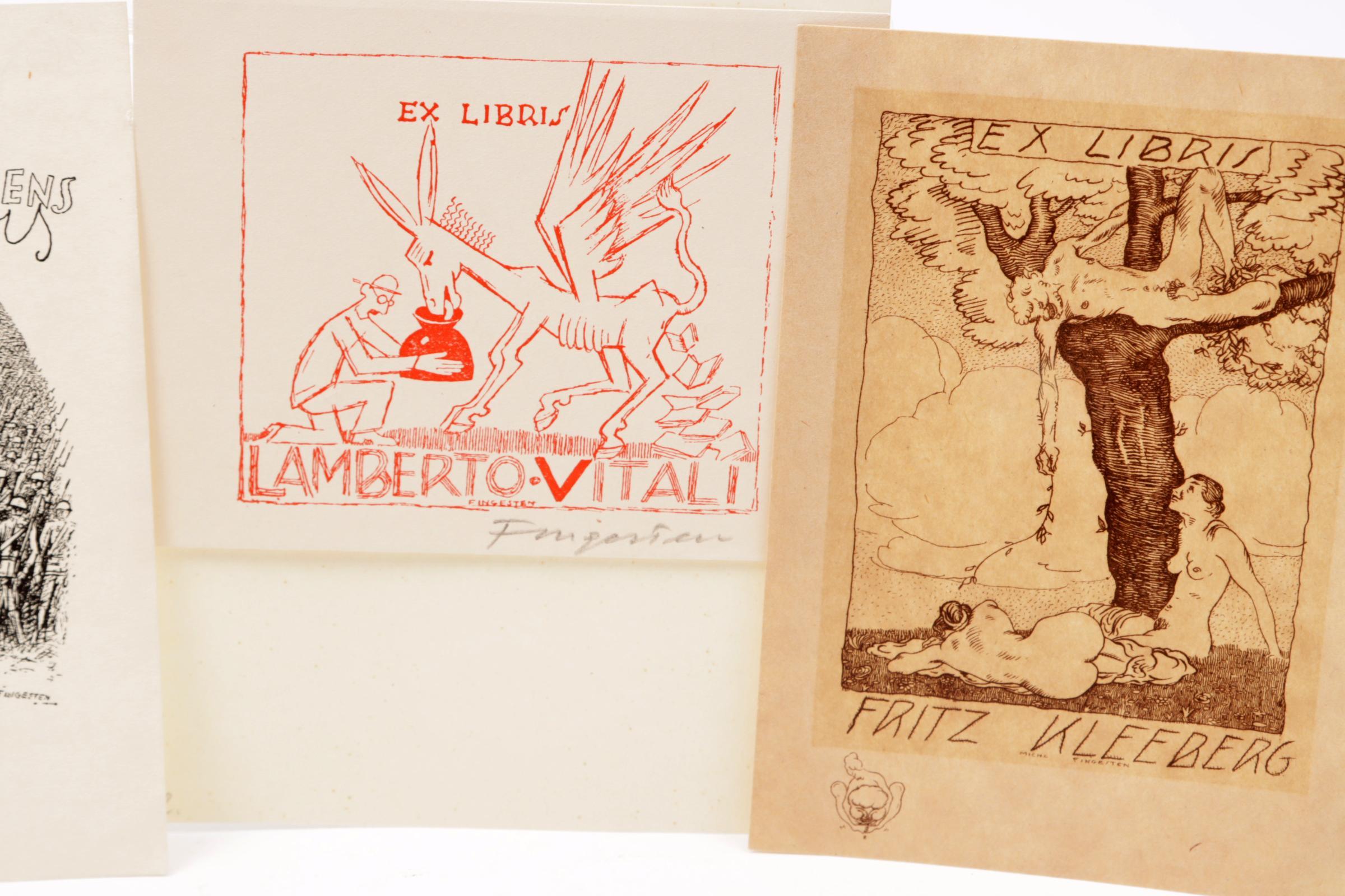 Fingesten, M., 6 exlibris / kleingrafiek, litho / cliché, deels opgeplakt (geweest), 3 x gesigneerd. Gemaakt voor: Fingesten, Lustig, Vitali, Kleeberg (met remarque), Strens