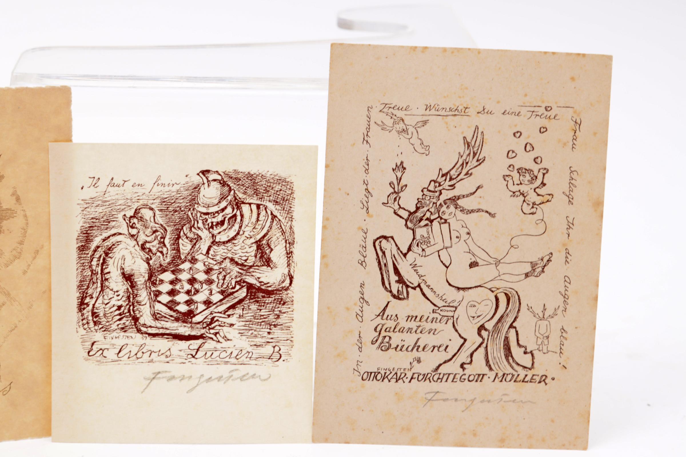 Fingesten, M., 6 exlibris / kleingrafiek, litho / cliché, deels opgeplakt (geweest), 3 x gesigneerd. Gemaakt voor: Margules, Malz, Lucien B., Florinde, Furchtegott-Mueller, Schanzer.