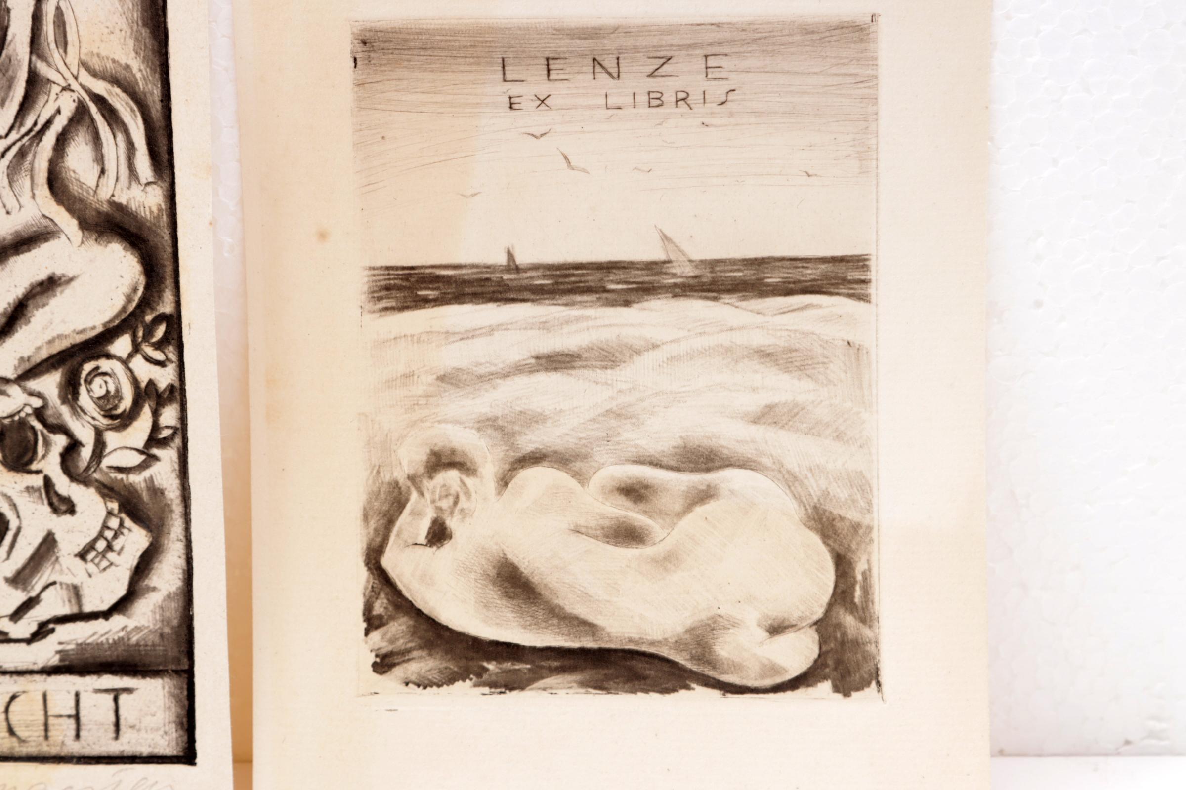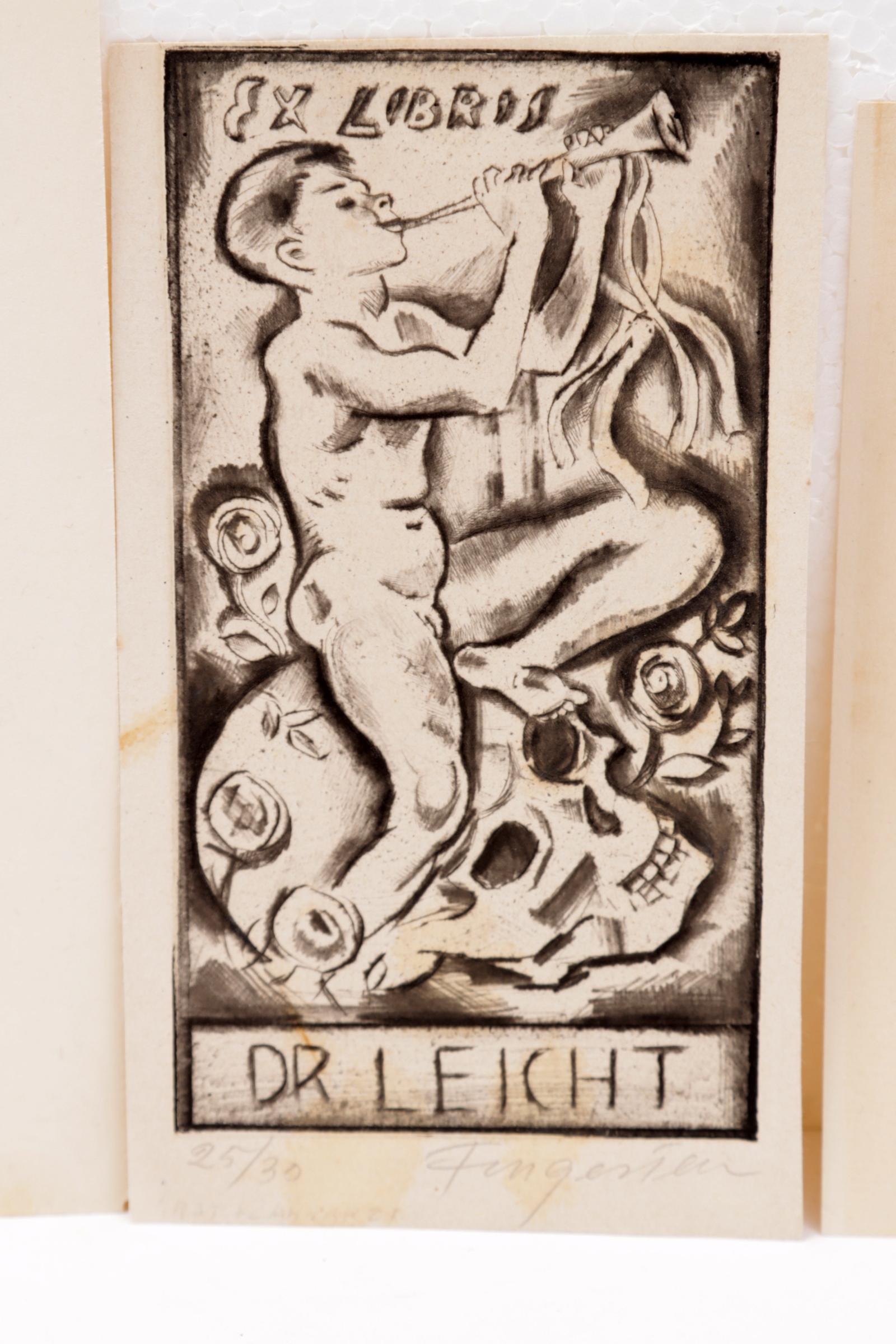 Fingesten, M., 4 exlibris / kleingrafiek, C3, 3 x gesigneerd, deels opgeplakt (geweest). Gemaakt voor: Dr Leicht (papier wat gevlekt), Mantero, Botta, Lenze