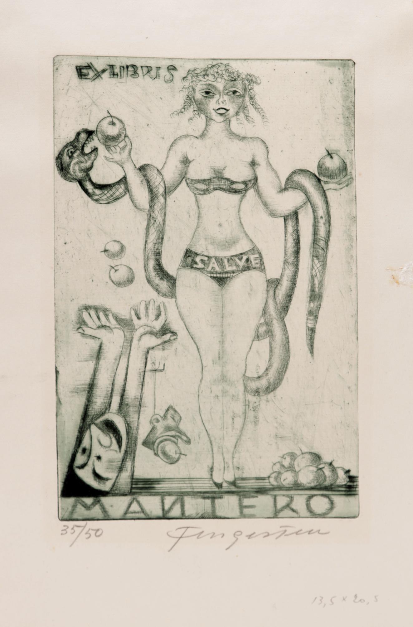 Fingesten, M., 1 exlibris, C3, genummerd en gesigneerd. Opgeplakt. Gemaakt voor: Mantero (groot formaat, 190 x 123 mm). Eva en de slang.