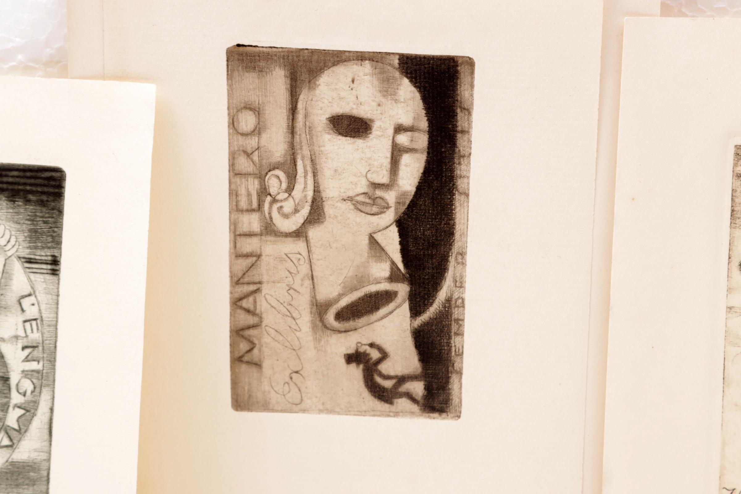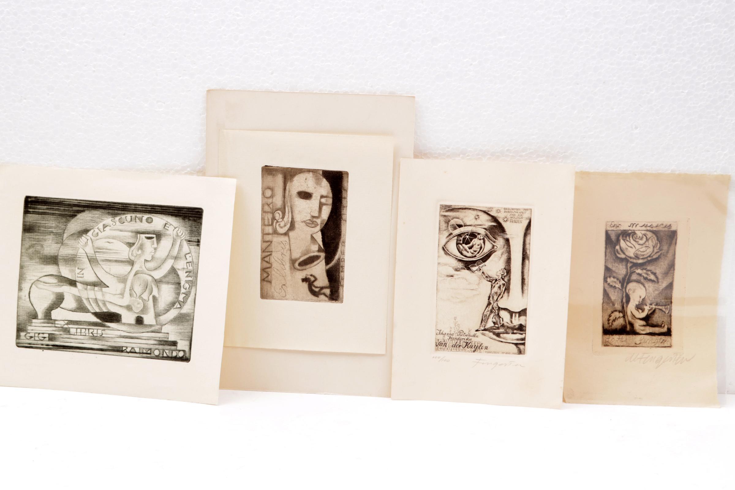 Fingesten, M., 4 exlibris, C3, 2 x gesigneerd. Deels opgeplakt geweest. Gemaakt voor: Senger, Van der Kuylen, Raimondo, Mantero