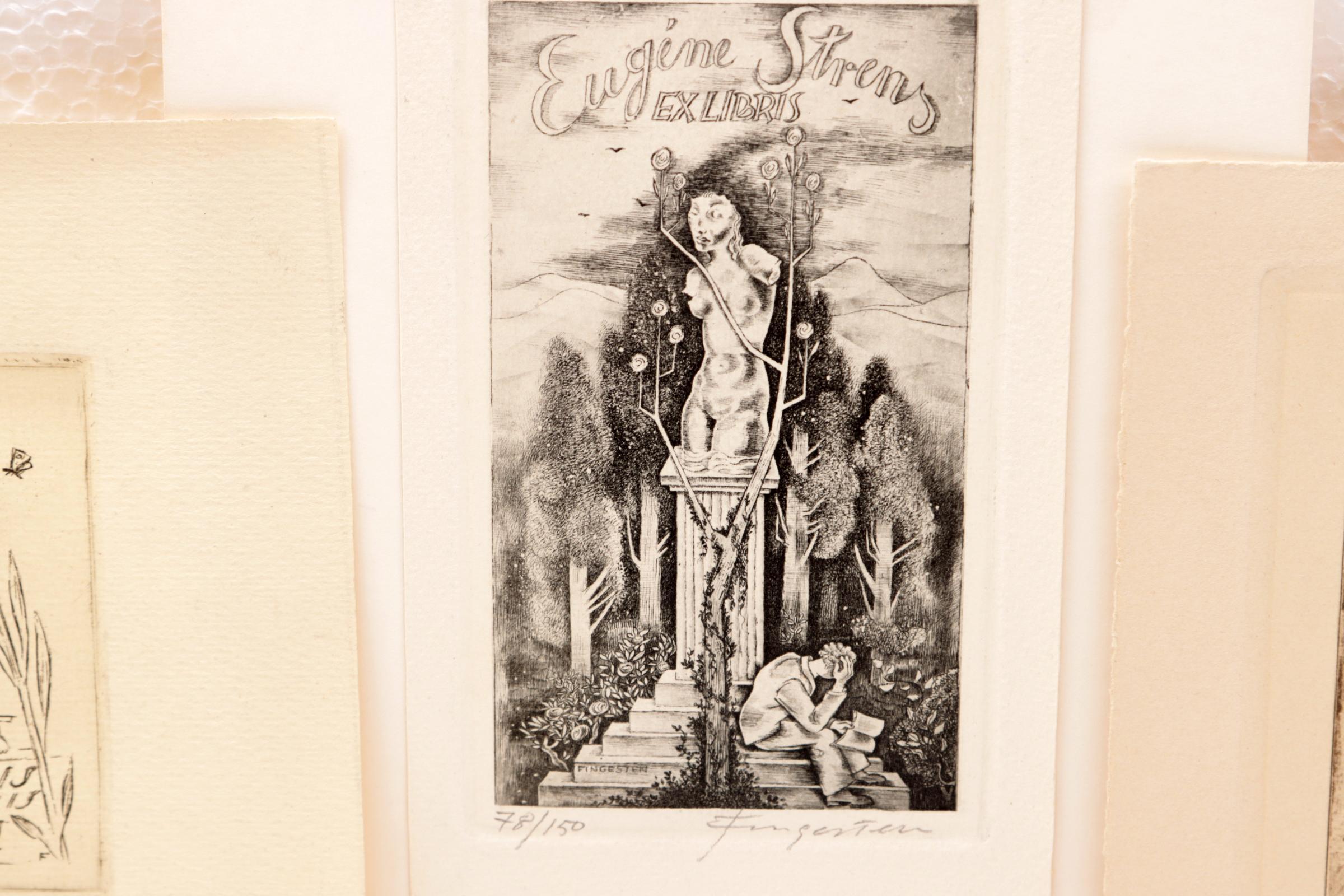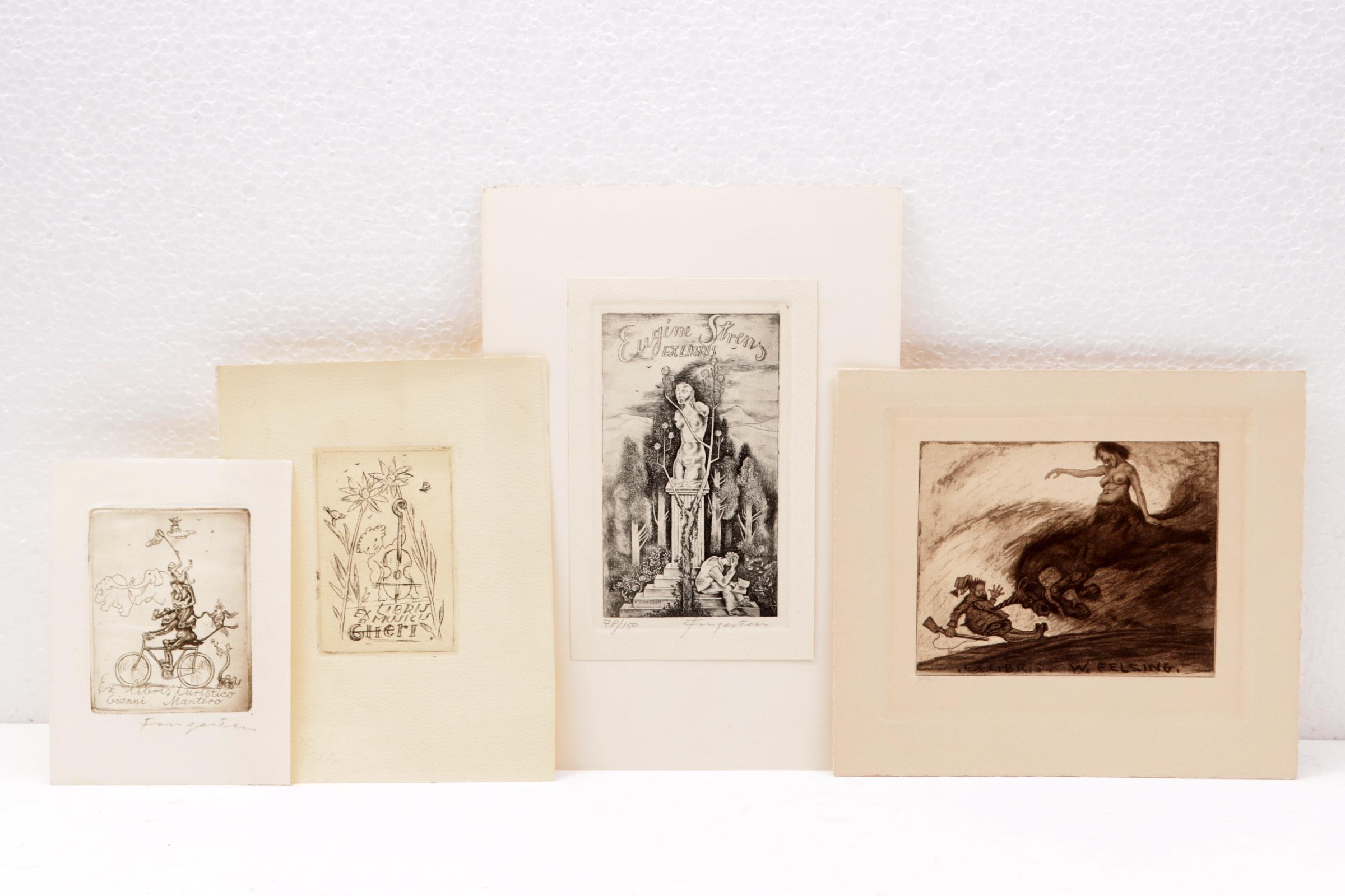Fingesten, M., 4 exlibris, C3, 2 x gesigneerd. Deels opgeplakt geweest. Gemaakt voor: Gheri, Mantero, Strens, Felsing