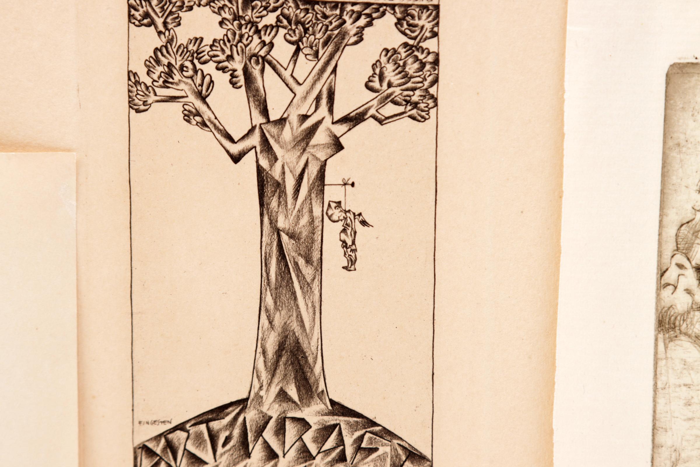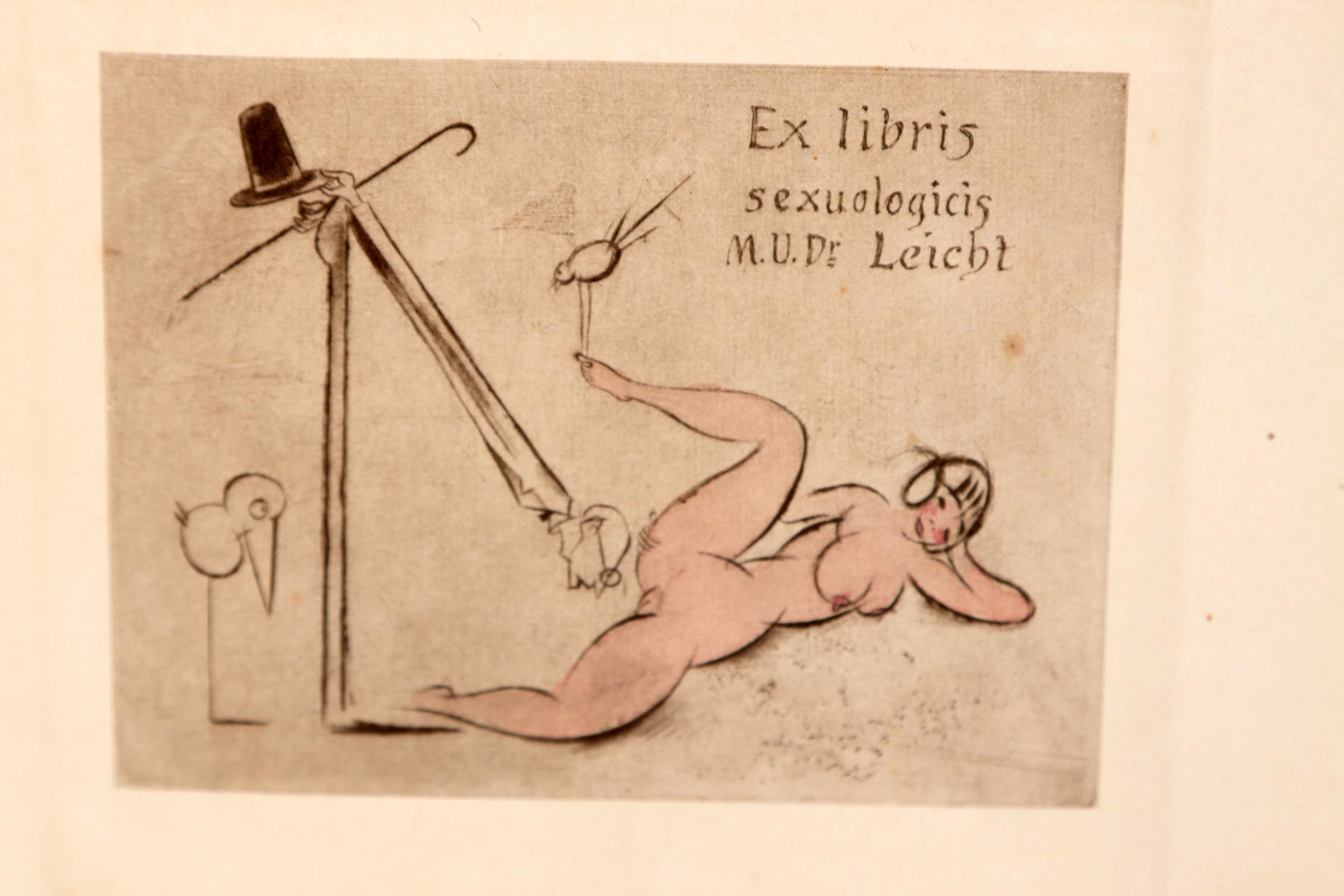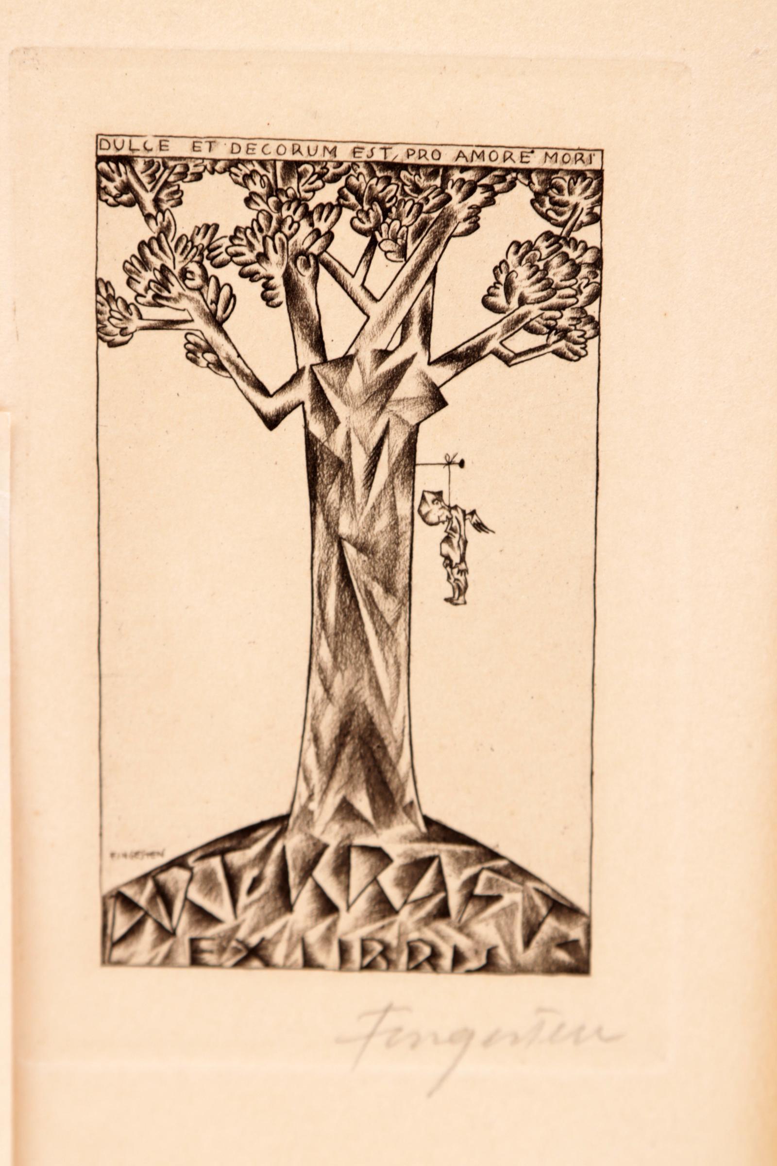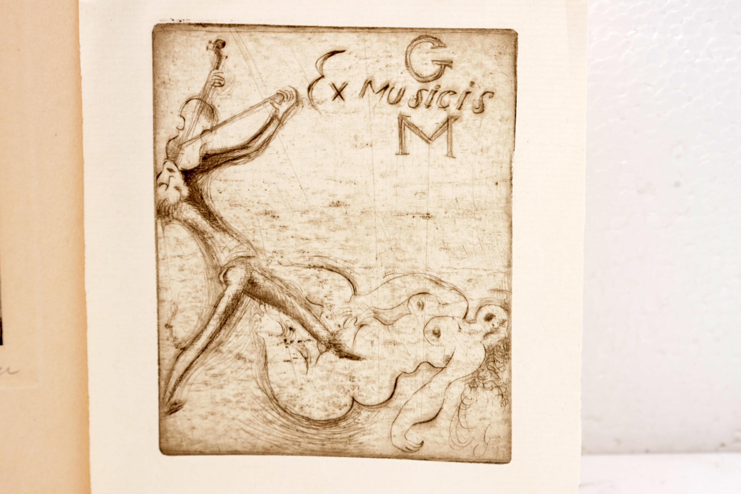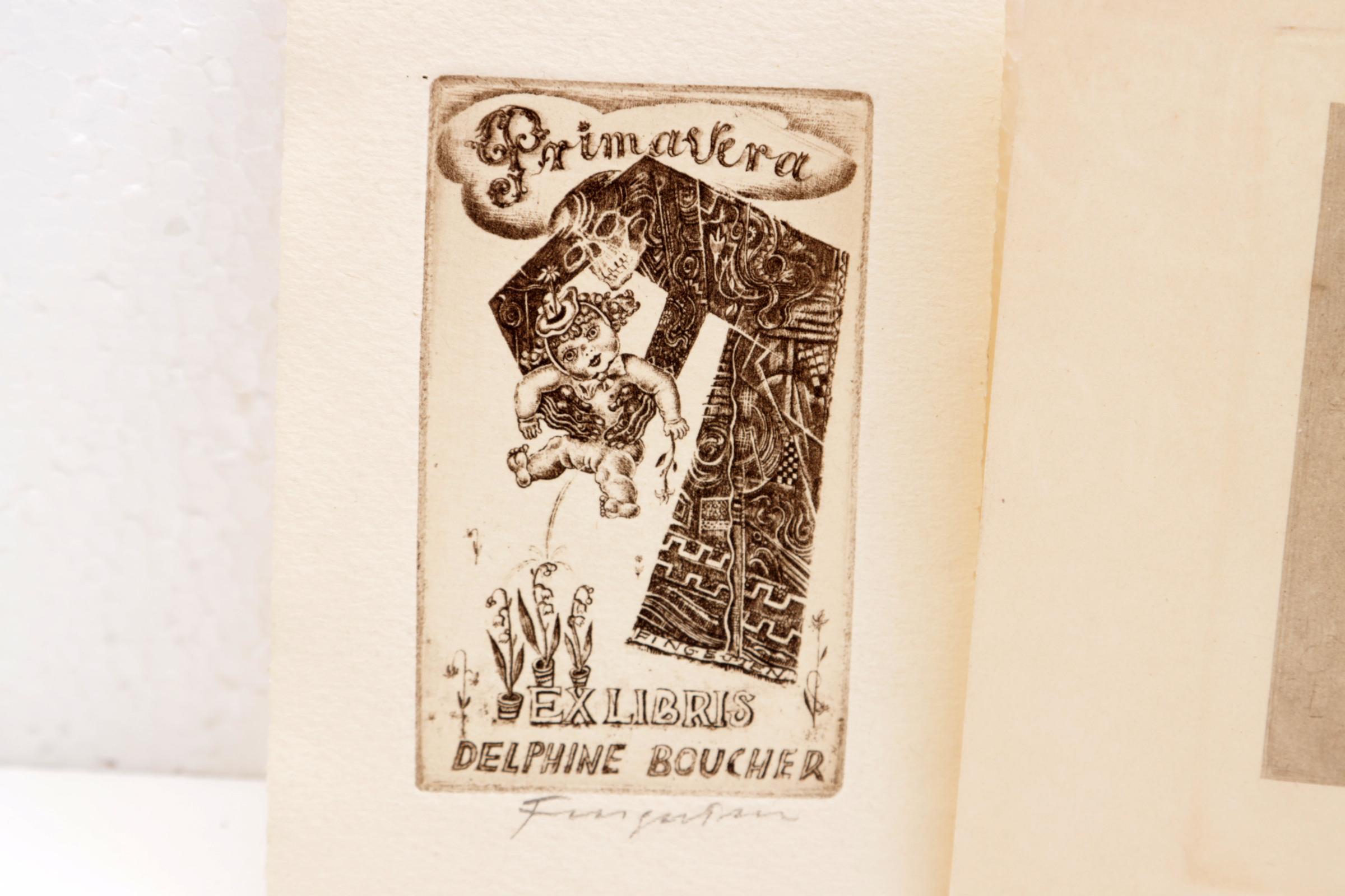 Fingesten, M., 4 exlibris, C3, 2 x gesigneerd. Deels opgeplakt geweest. Gemaakt voor: G.M., Leicht, Boucher, Art-Kraft