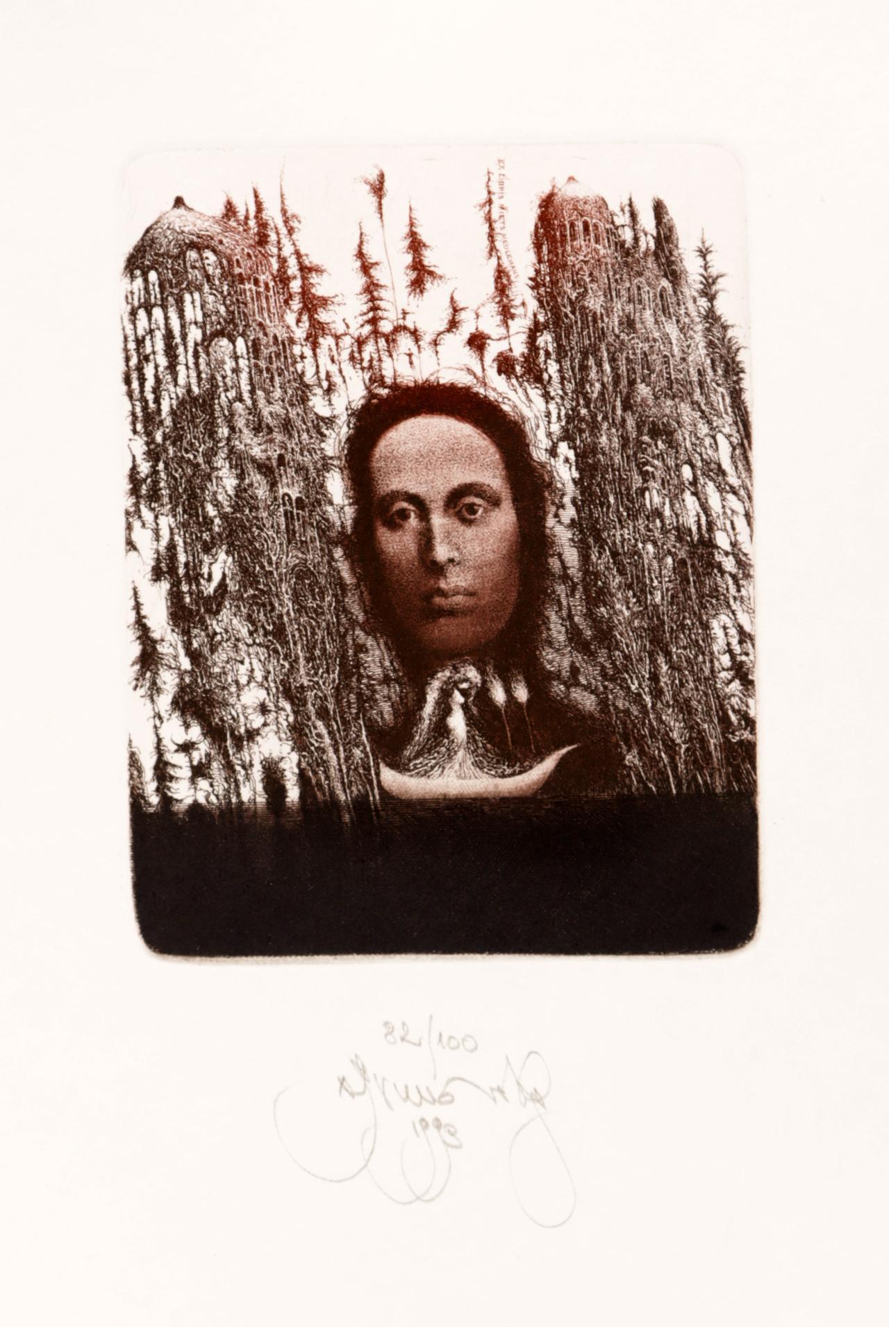Brunovsky, A., exlibris voor Miets Meulemans, C3, genummerd en gesigneerd, 1993, 130 x 100 mm, (o.a. vrouwenhoofd, boot)