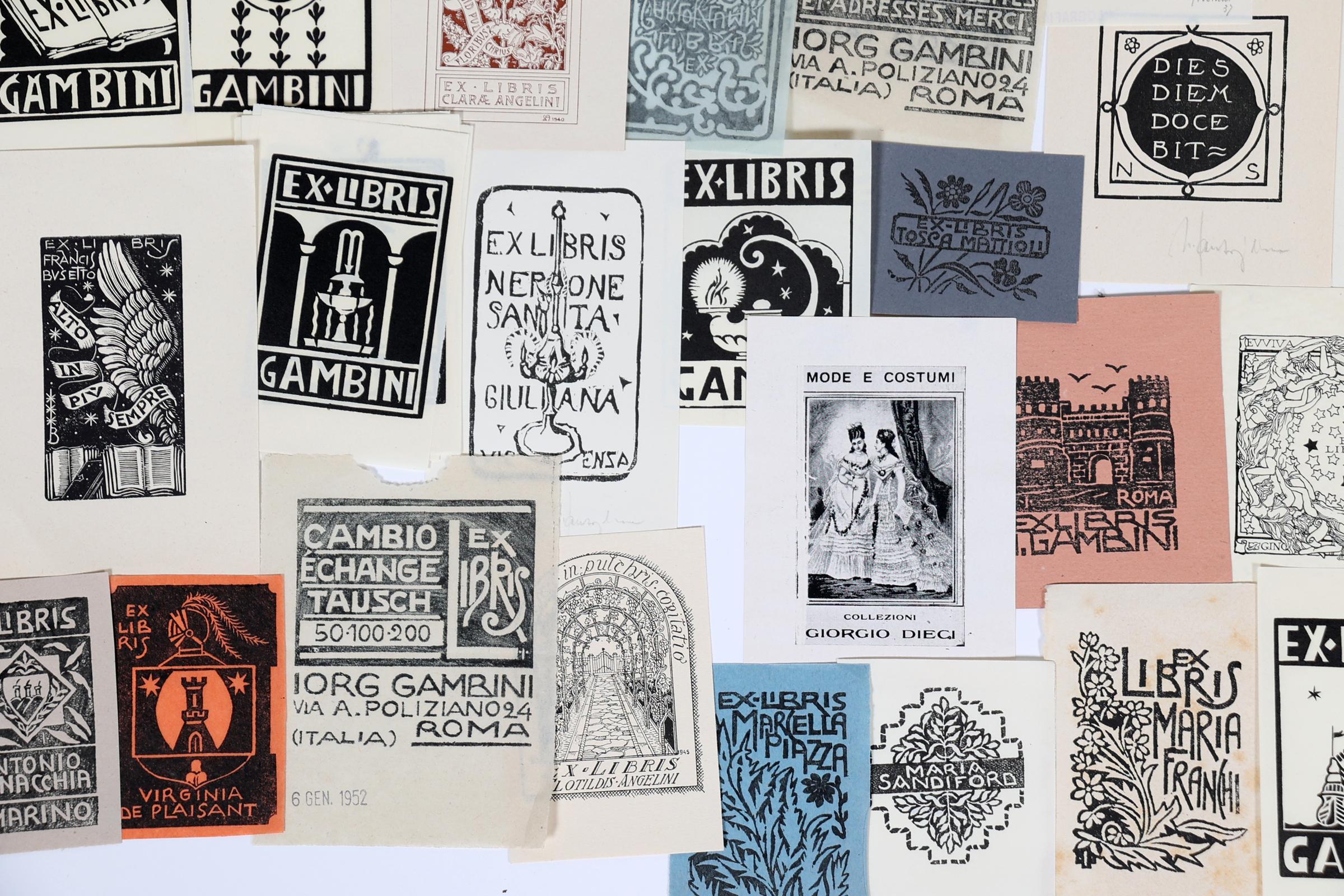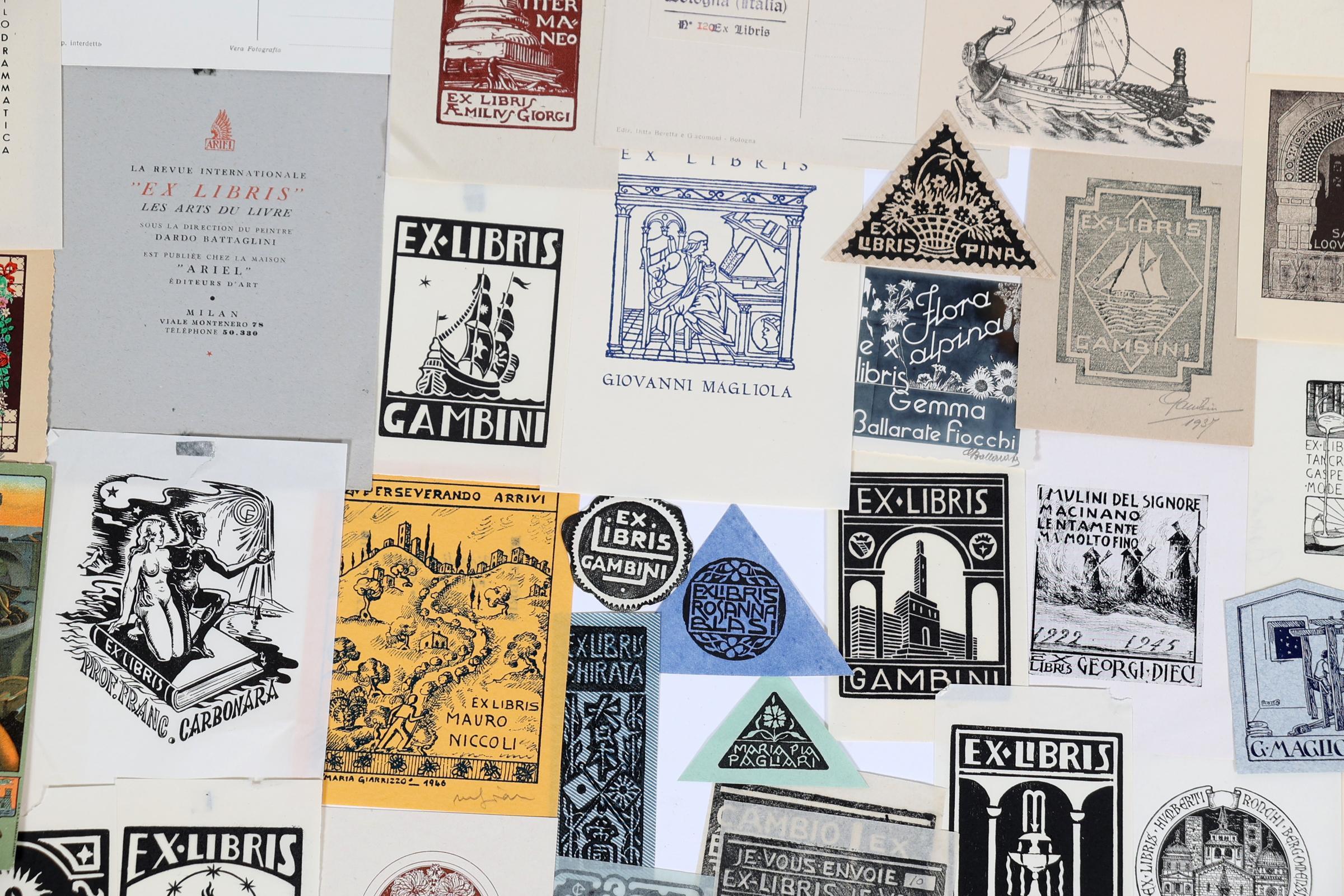 collectie van plm. 110 Italiaanse exlibris, voornamelijk uit de eerste helft van de 20-ste eeuw, voornamelijk hoogdruk / vlakdruk, niet gesigneerd, deels opgeplakt (geweest).