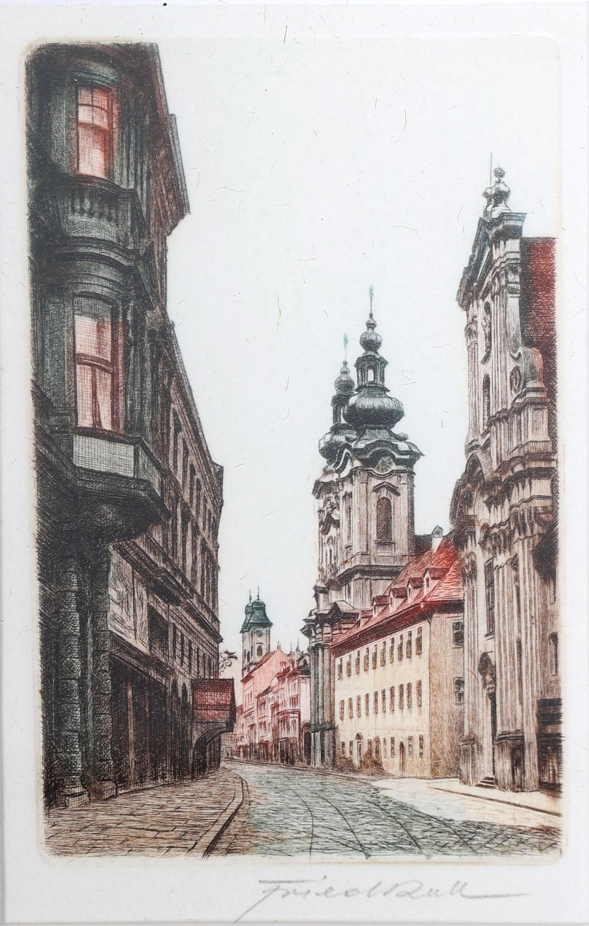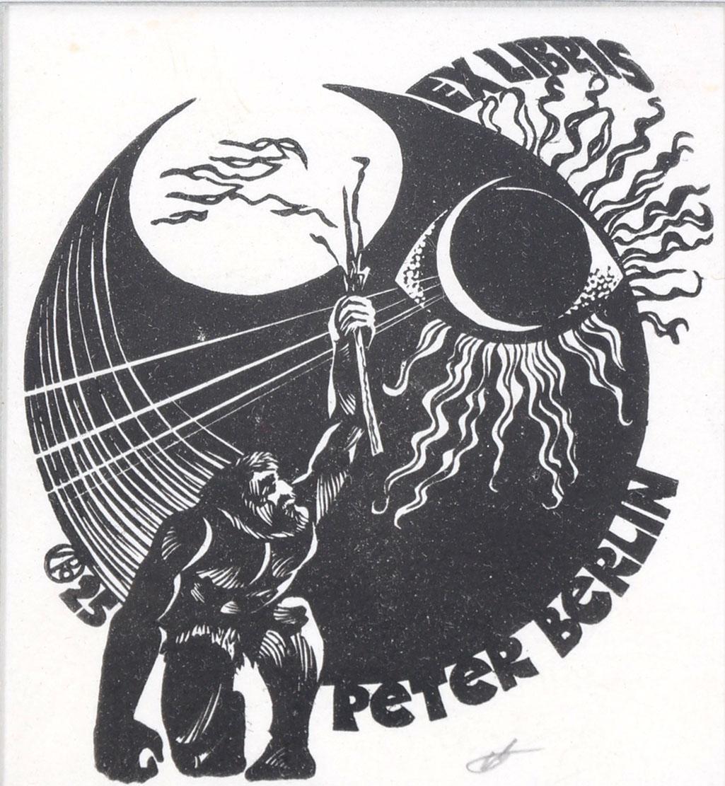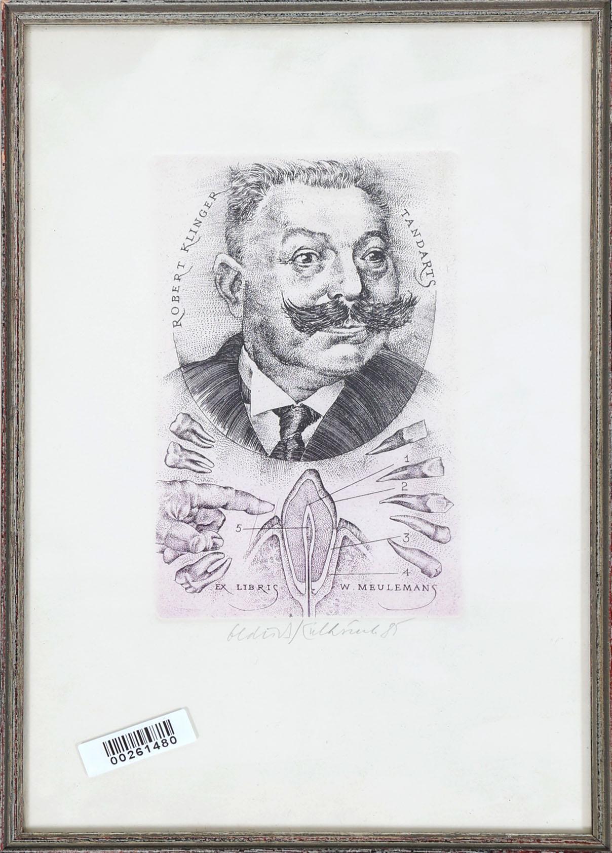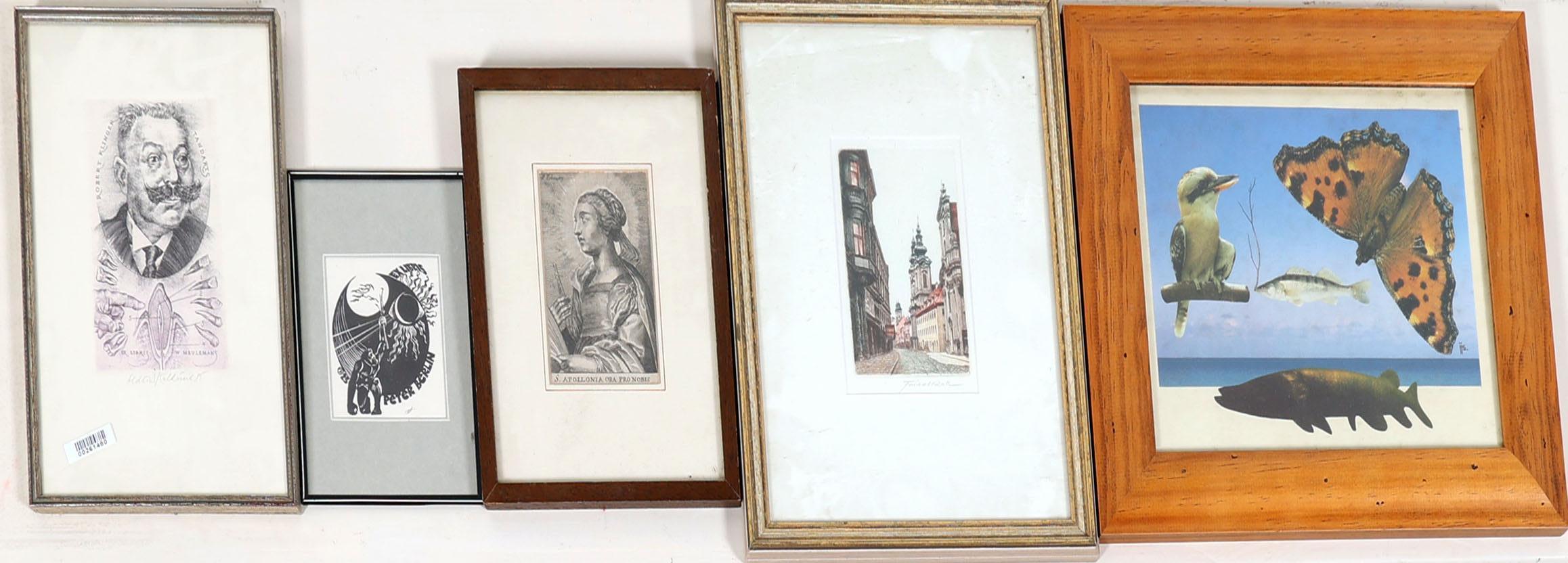 Koop van 5 ingelijste prenten, onder andere ets van O. Kulhanek, ex-libris voor Meulemans, gesigneerd