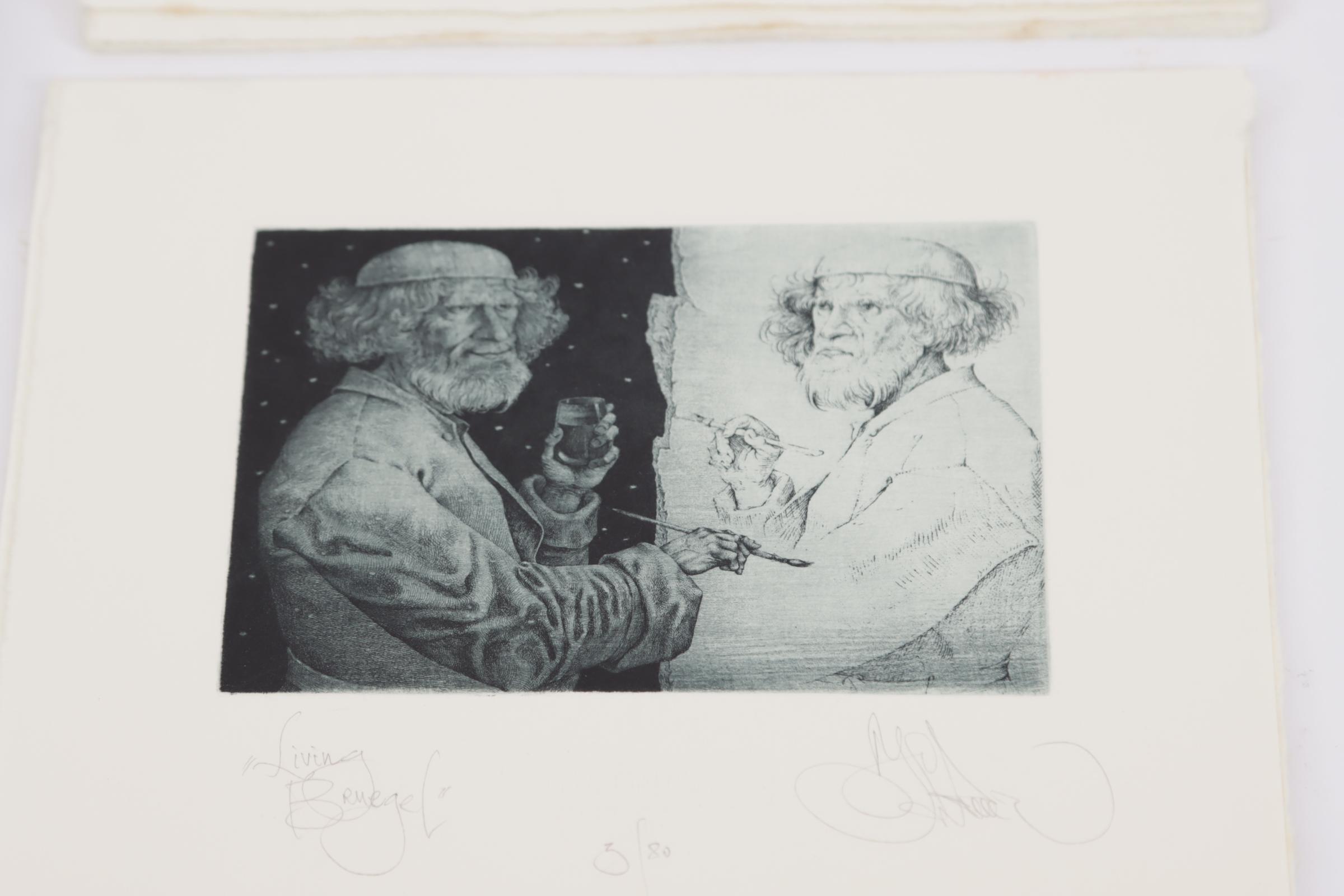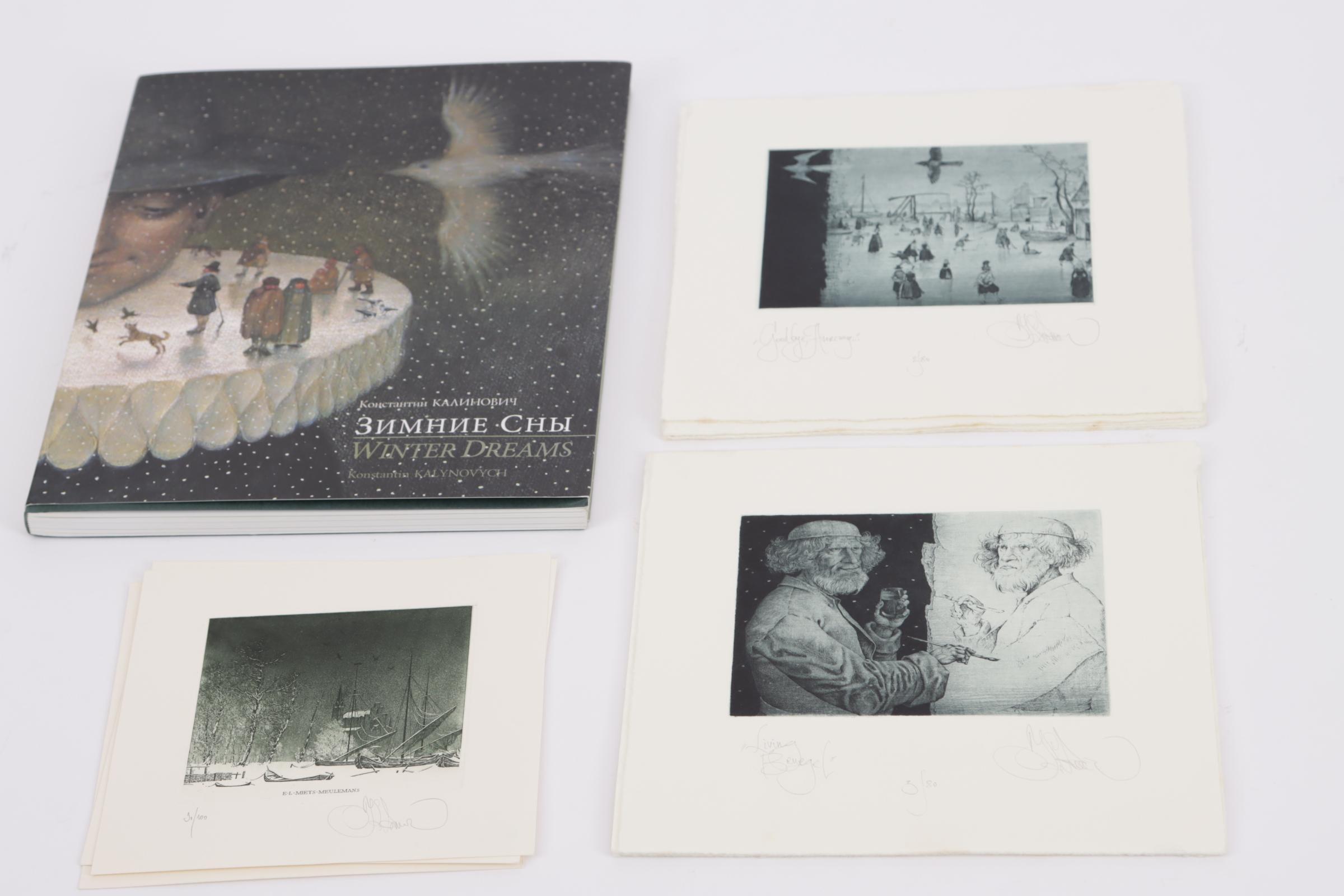 Kalynovych, K., exlibris voor Meulemans, ('Goodbeye Avercamp'), C3C5, genummerd en gesigneerd, 15 stuks (restoplage), plus exlibris Miets Meulemans, ('Winter'), C3, genummerd en gesigneerd, 3 stuks (restoplage), plus: 'Winterdreams', over het werk van Kalynovych, 2007, met gesigneerde opdracht van Kalynovych aan Meulemans.