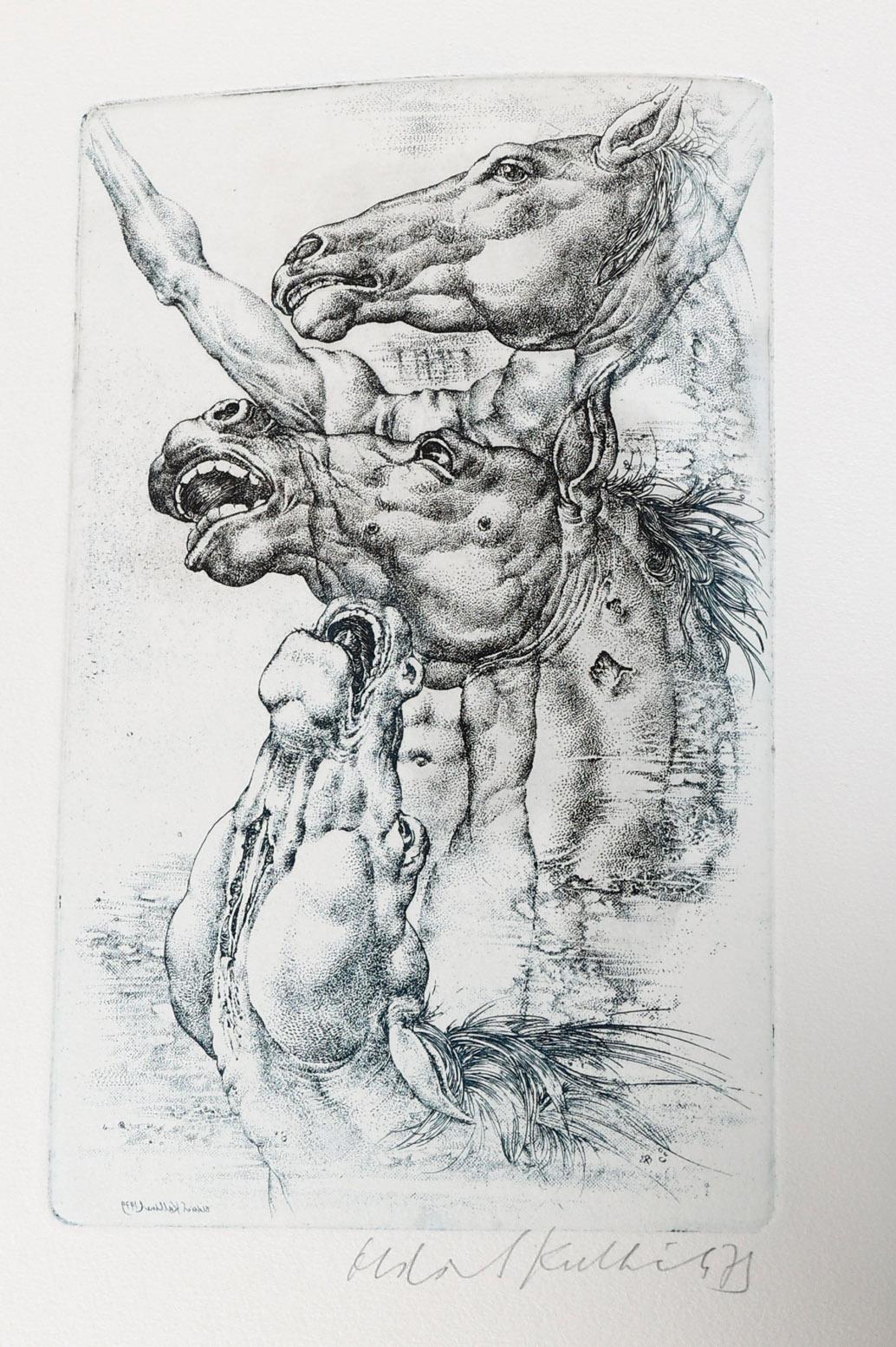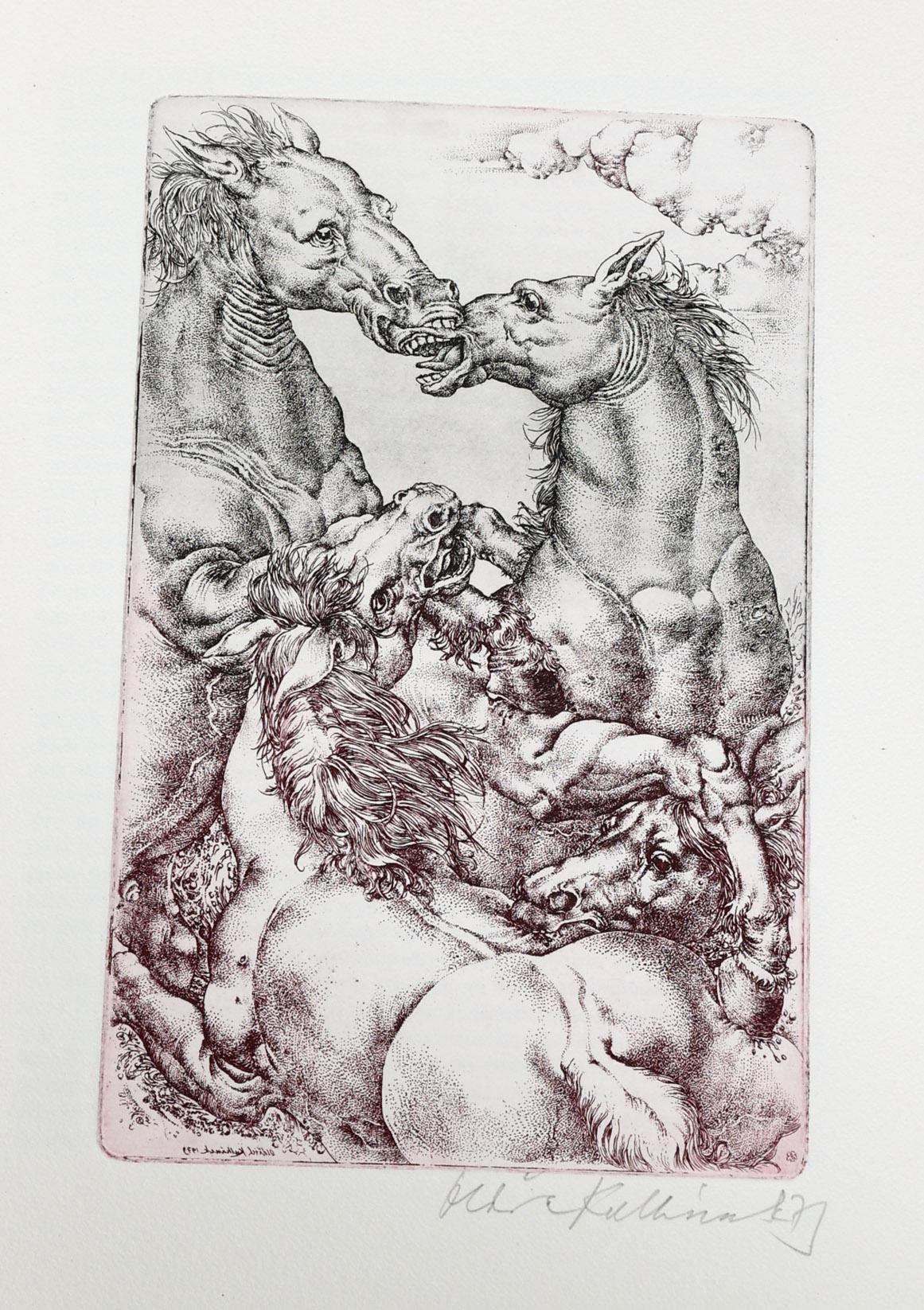 Kulhanek, O., in: Curzio Malaparte, 'De IJspaarden', Arethusa Pers 1980, twee etsen van Kulhanek, gesigneerd, nr. 67 / 125, band iets vervuild