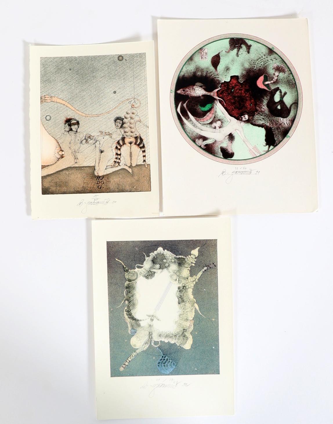 Gazovich, Vl., 3 exlibris, meerkleurenlitho's, genummerd en gesigneerd, (Vlado G, Bergomi, Ina)