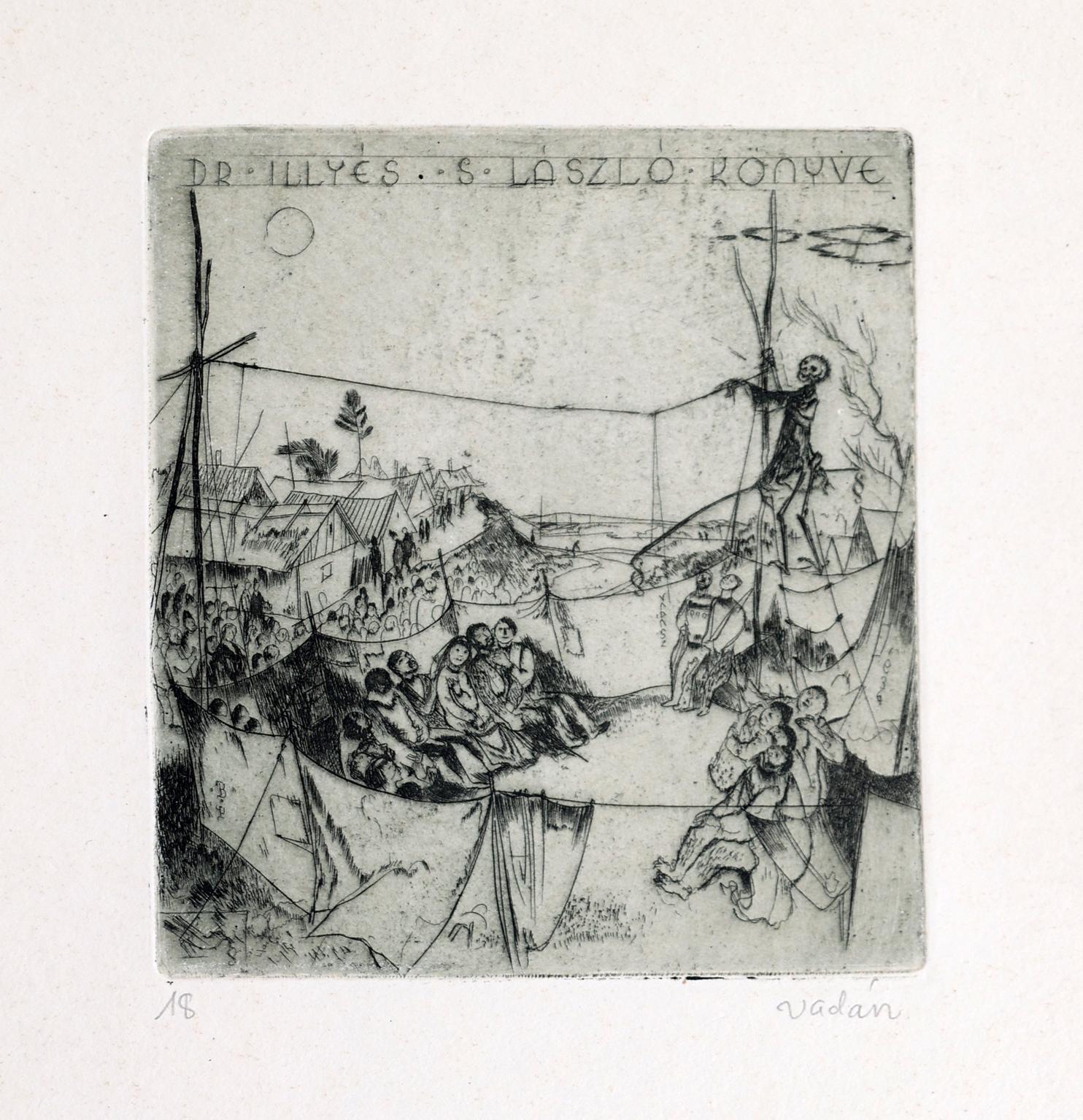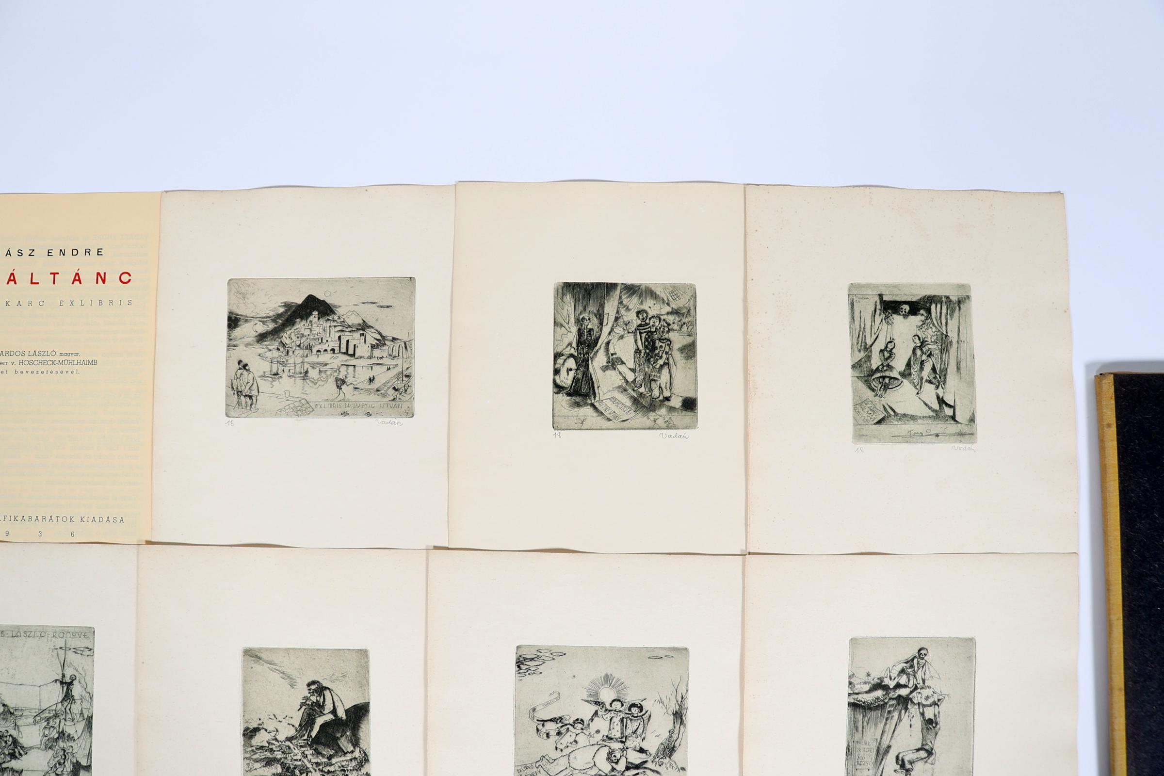 Vadasz, E.,'Halaltanc', 1936, A Szegedi Grafikabaratok Kiadasa, map met 10 etsen (dodendans), alle genummerd en gesigneerd, tekst o.a. in Duits. Etiket gevouwen geweest.