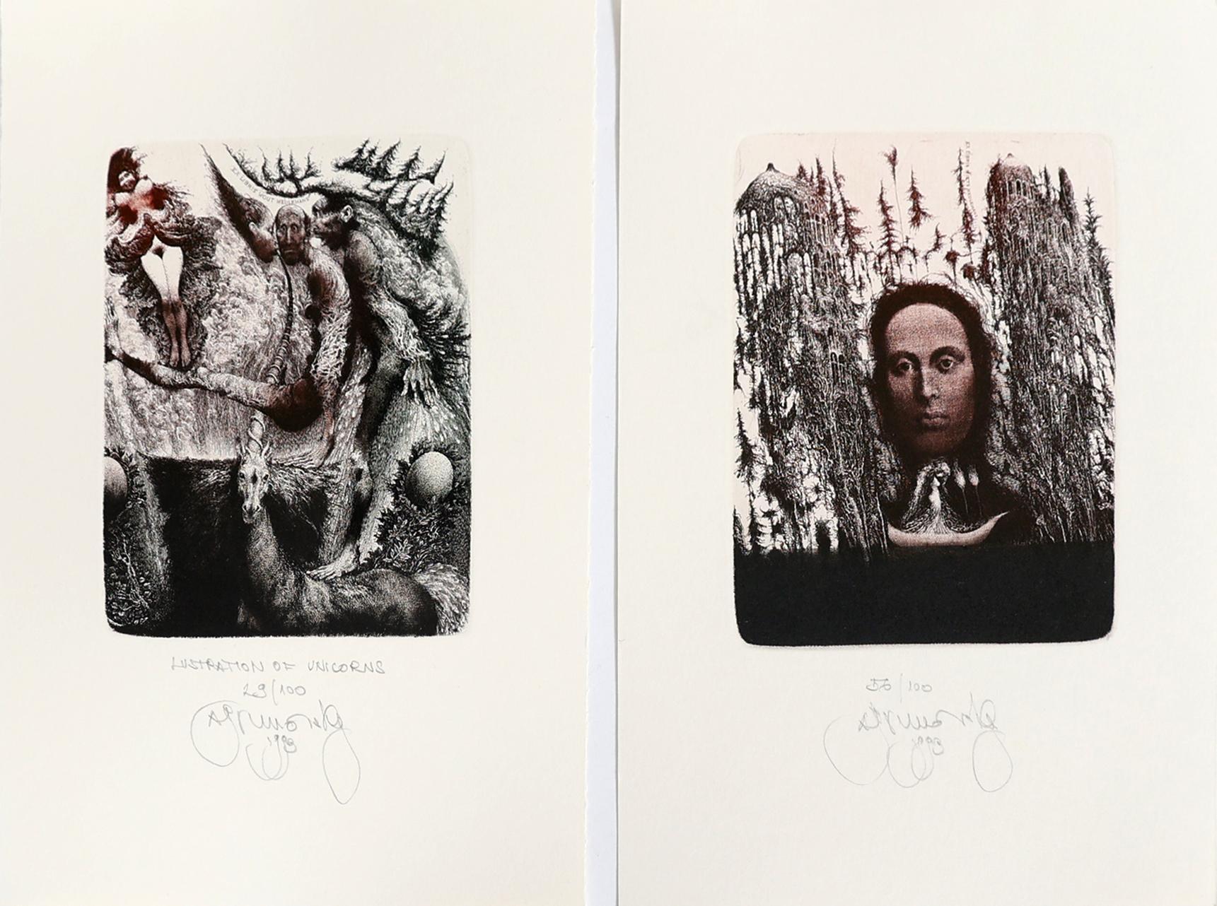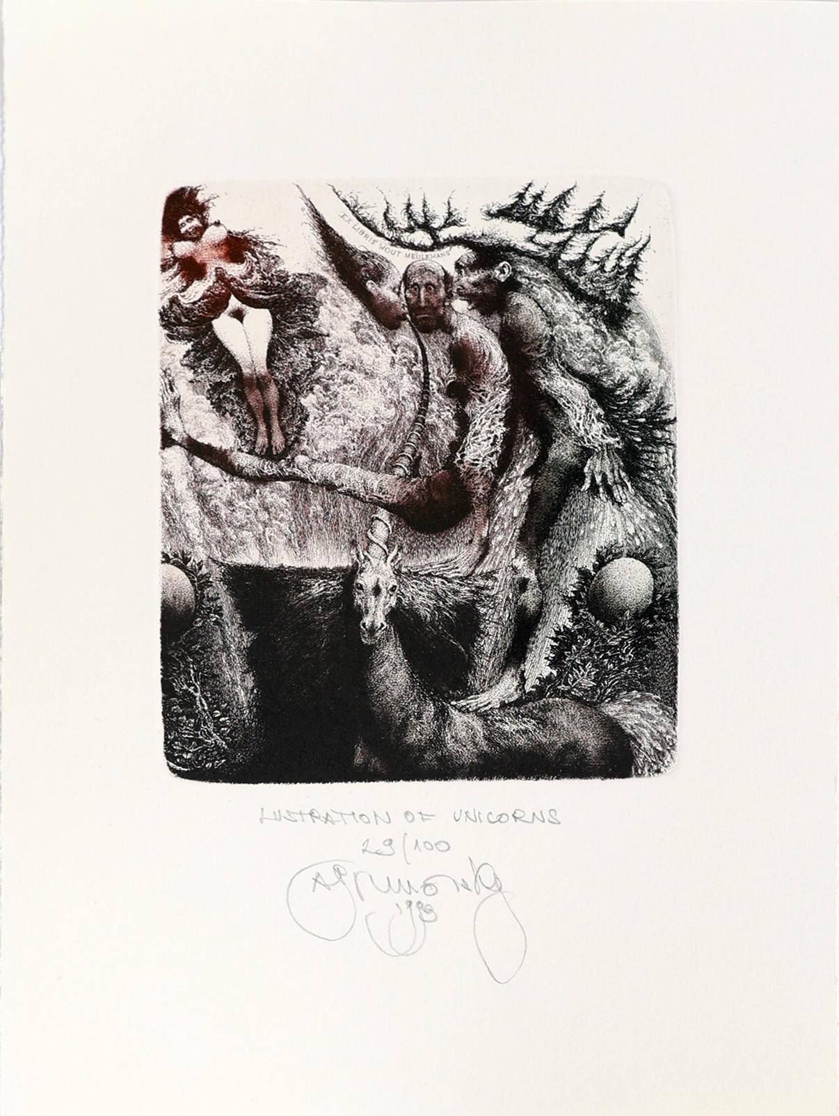 Brunovsky, A., 2 exlibris (Wout Meulemans, 1993, genummerd en gesigneerd, 1993, 'unicorn', 130x100 mm, plus: Miets Meulemans, 1993, genummerd en gesigneerd.