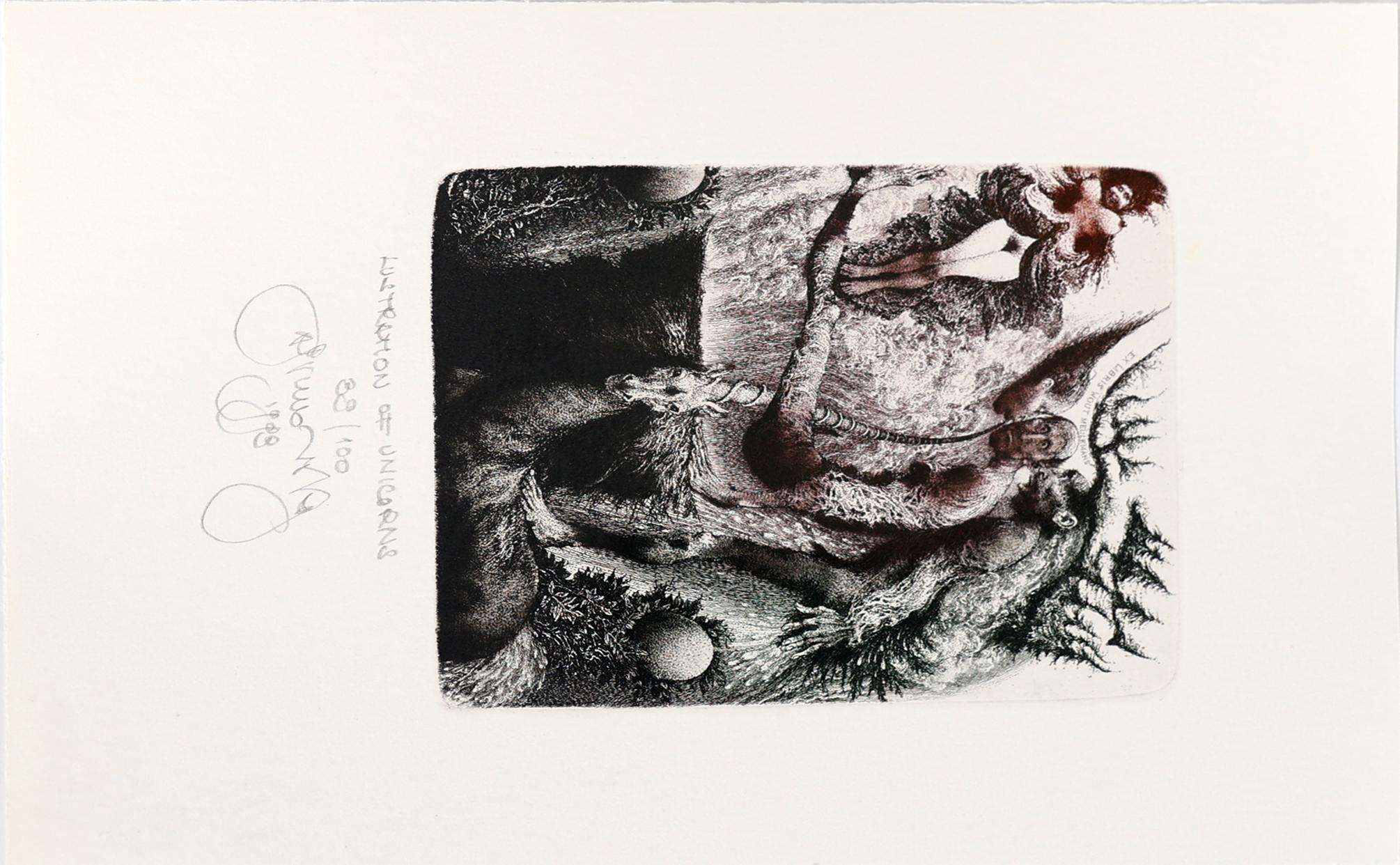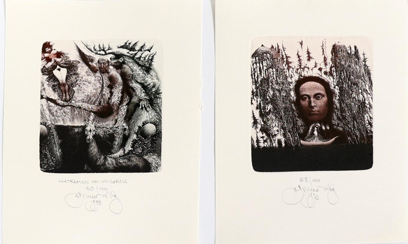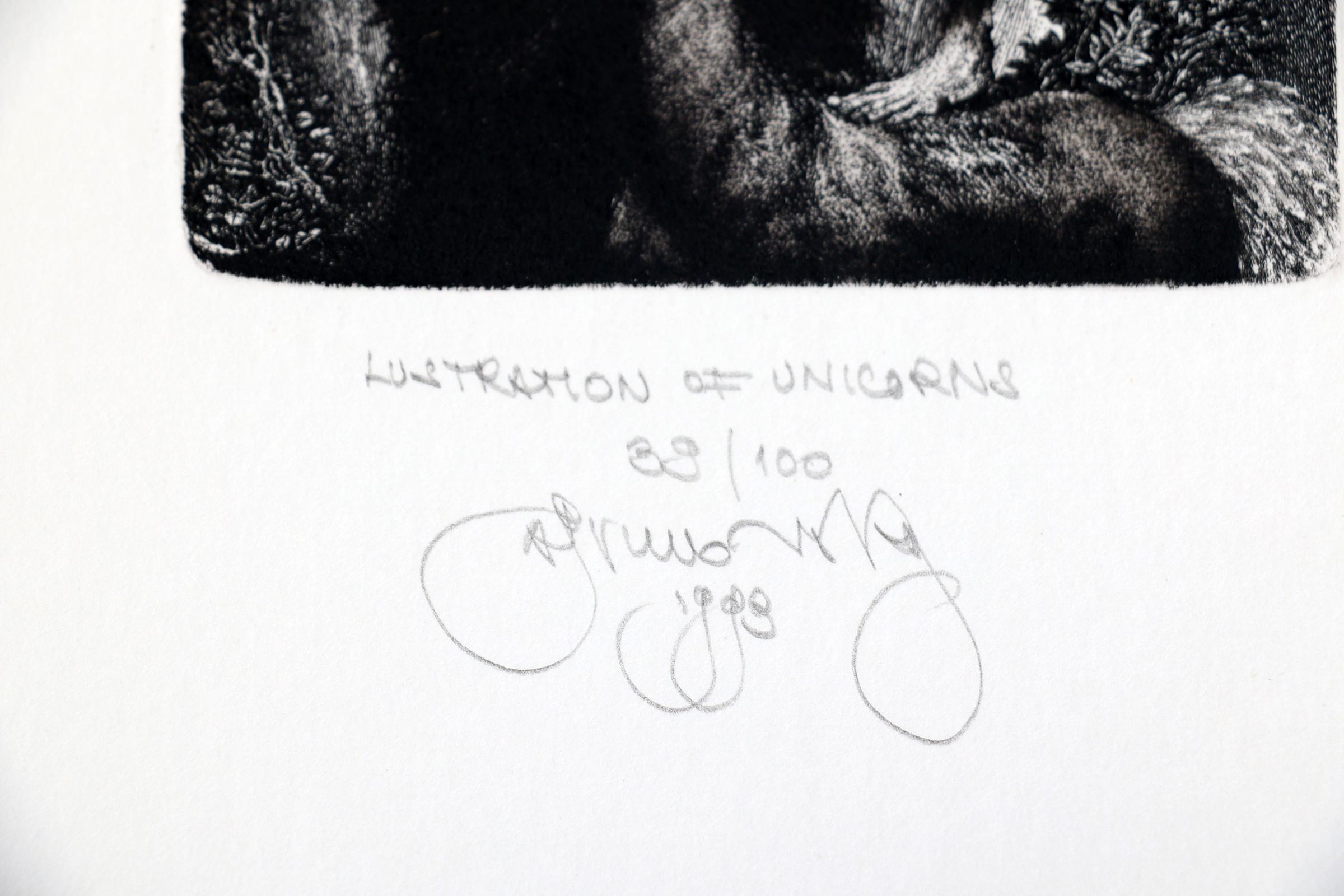 Brunovsky, A., 2 exlibris (Wout Meulemans, 1993, genummerd en gesigneerd, 1993, 'unicorn', 130x100 mm, plus: Miets Meulemans, 1993, genummerd en gesigneerd.