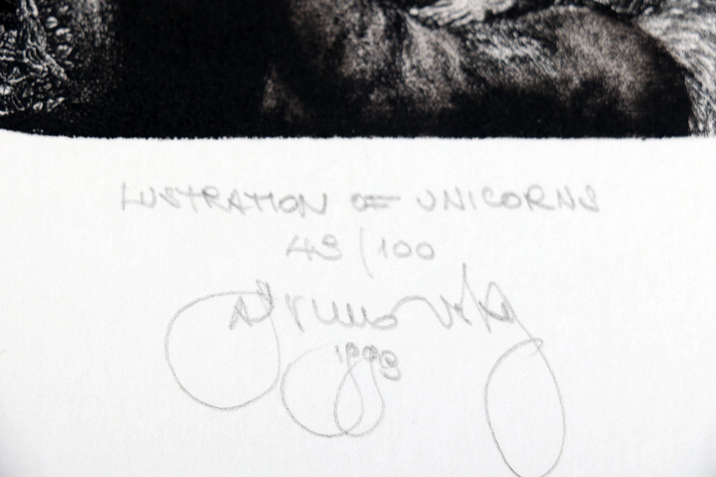 Brunovsky, A., 2 exlibris (Wout Meulemans, 1993, genummerd en gesigneerd, 1993, 'unicorn', 130x100 mm, plus: Miets Meulemans, 1993, genummerd en gesigneerd.