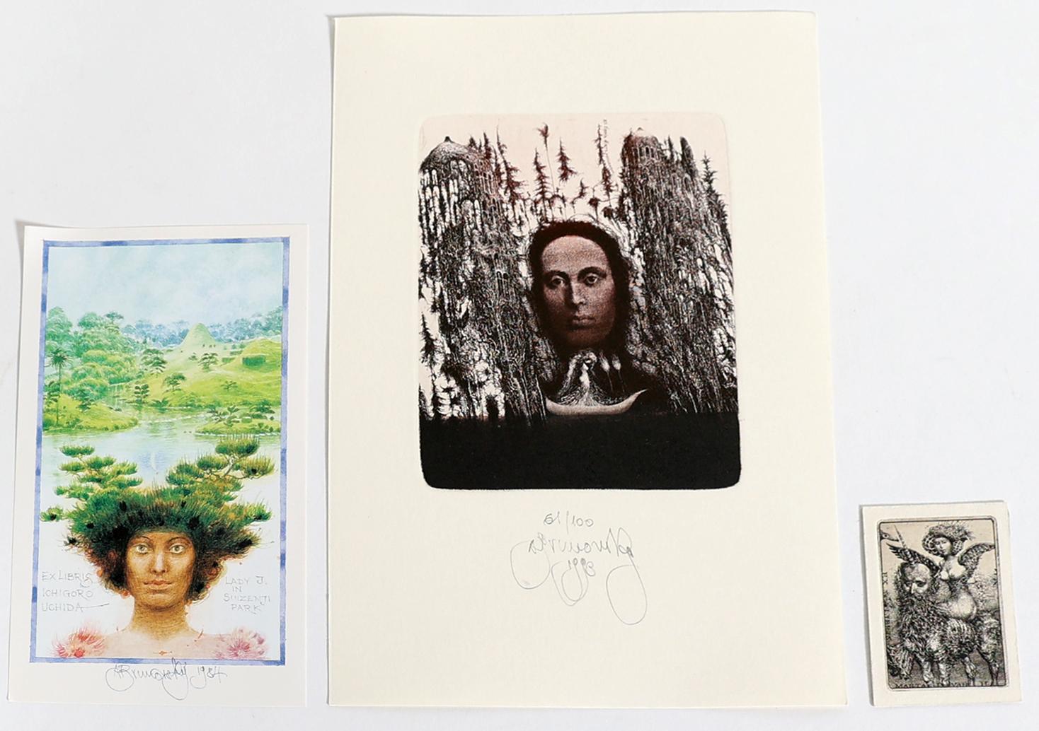 Brunovsky, A., 3 exlibris (Miets Meulemans, 1993, genummerd en gesigneerd, plus: exlibris Marta T. van H - opus 19 - , niet gesigneerd, C3, plus: exlibris Ichigoro Uchida, litho - kleur-, gesigneerd.