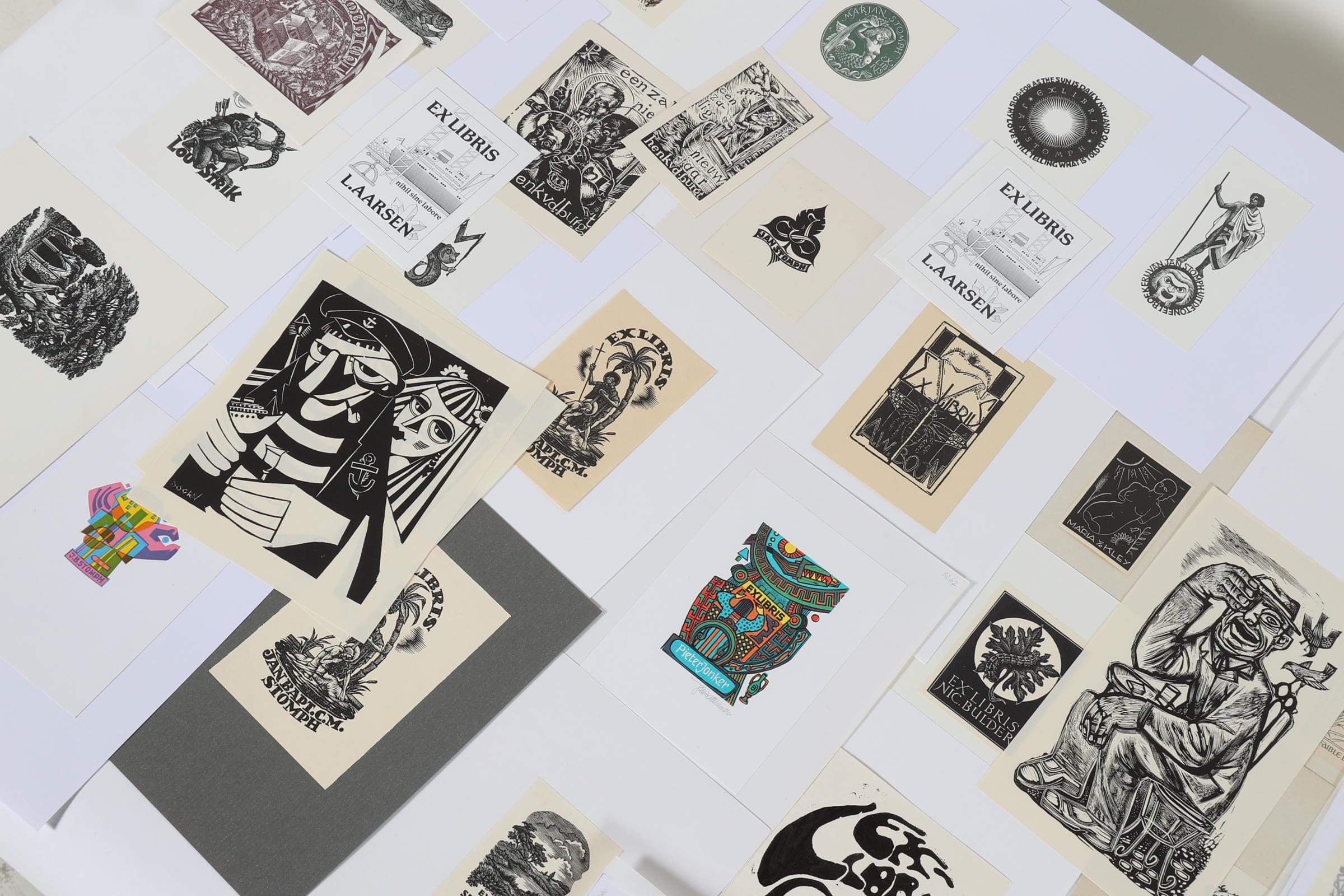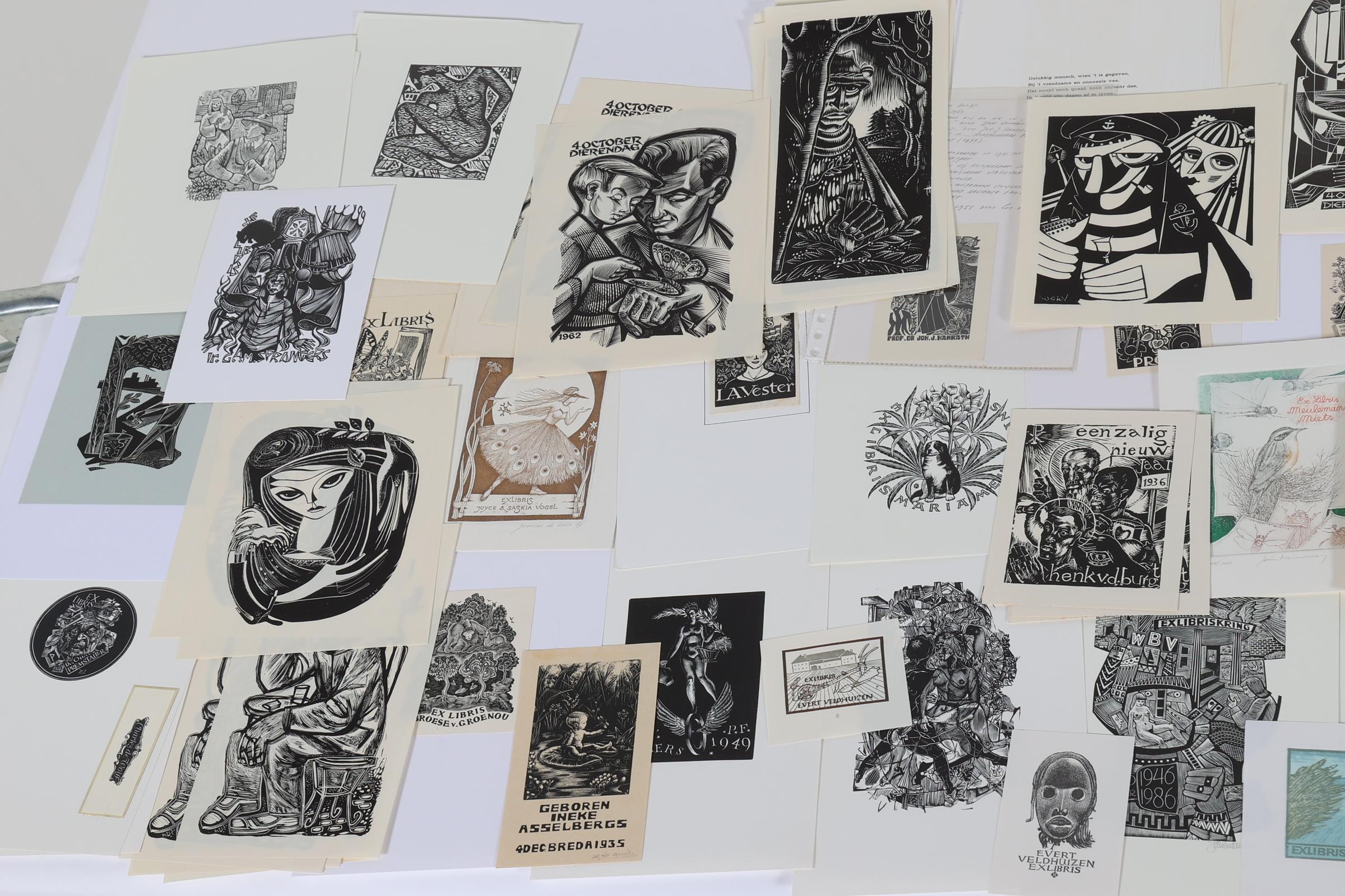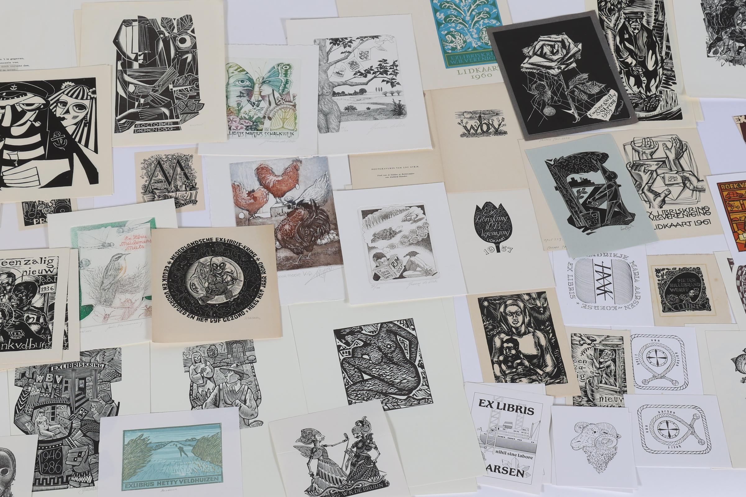 collectie 150 Nederlandse exlibris, voornamelijk hoogdrukken, deels gesigneerd, deels opgeplakt (geweest). Bevat een aantal doubletten. O.a. werk van Zwiers, Rueter, Lazarov, De Vries, Schmuell, Van Doorn, Van Hell, Strik, Battermann, etc.