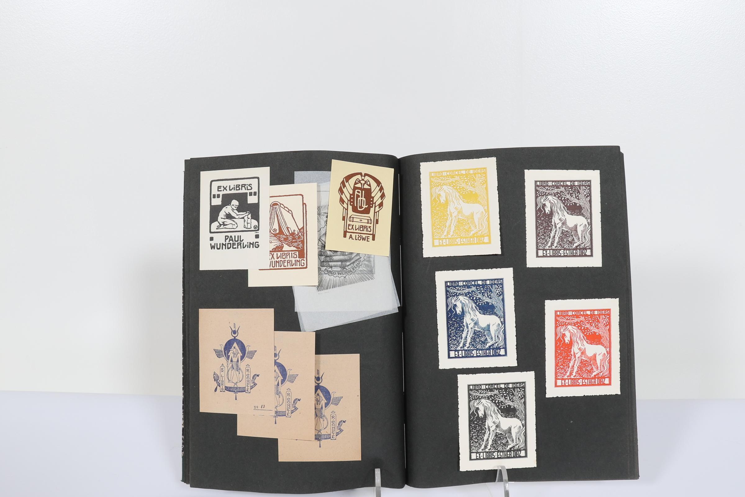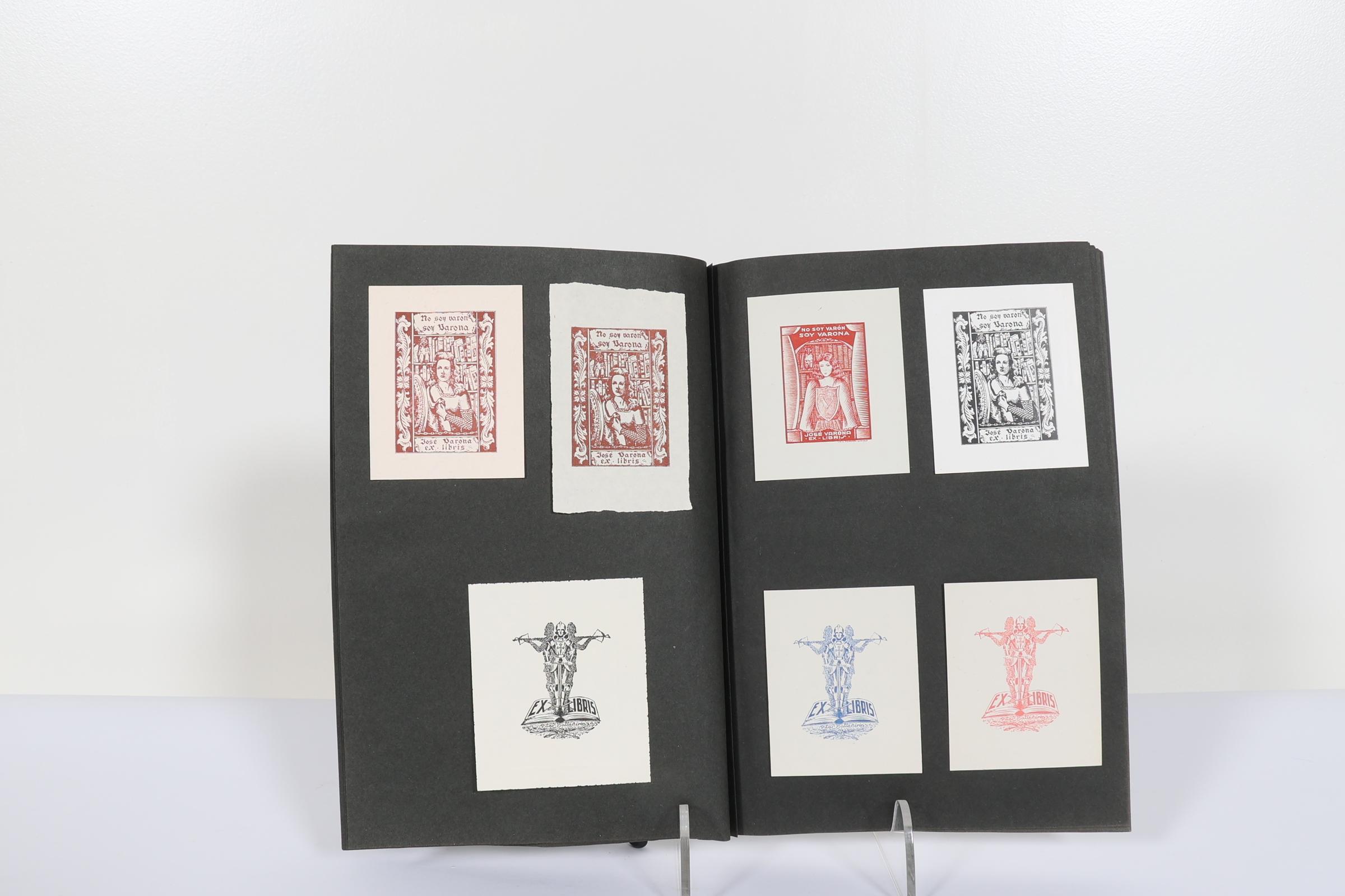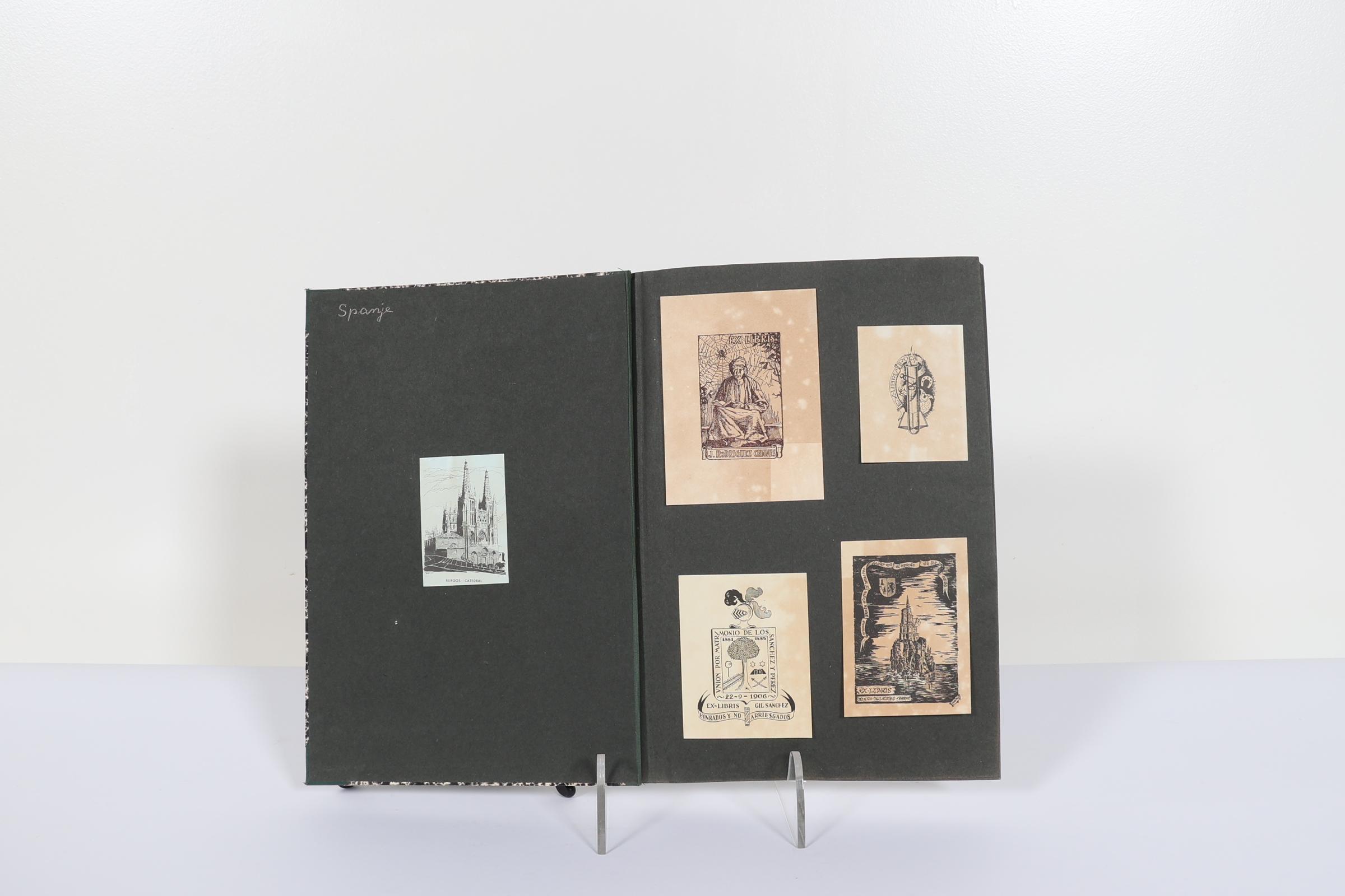 collectie plm, 400 Spaanse exlibris, voornamelijk eerste helft vorige eeuw, voornamelijk hoogdruk, ingeplakt in boek, bevat doubletten en kleurvarianten, niet gesigneerd.