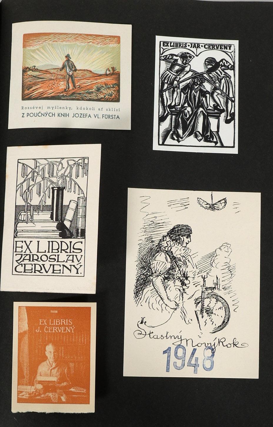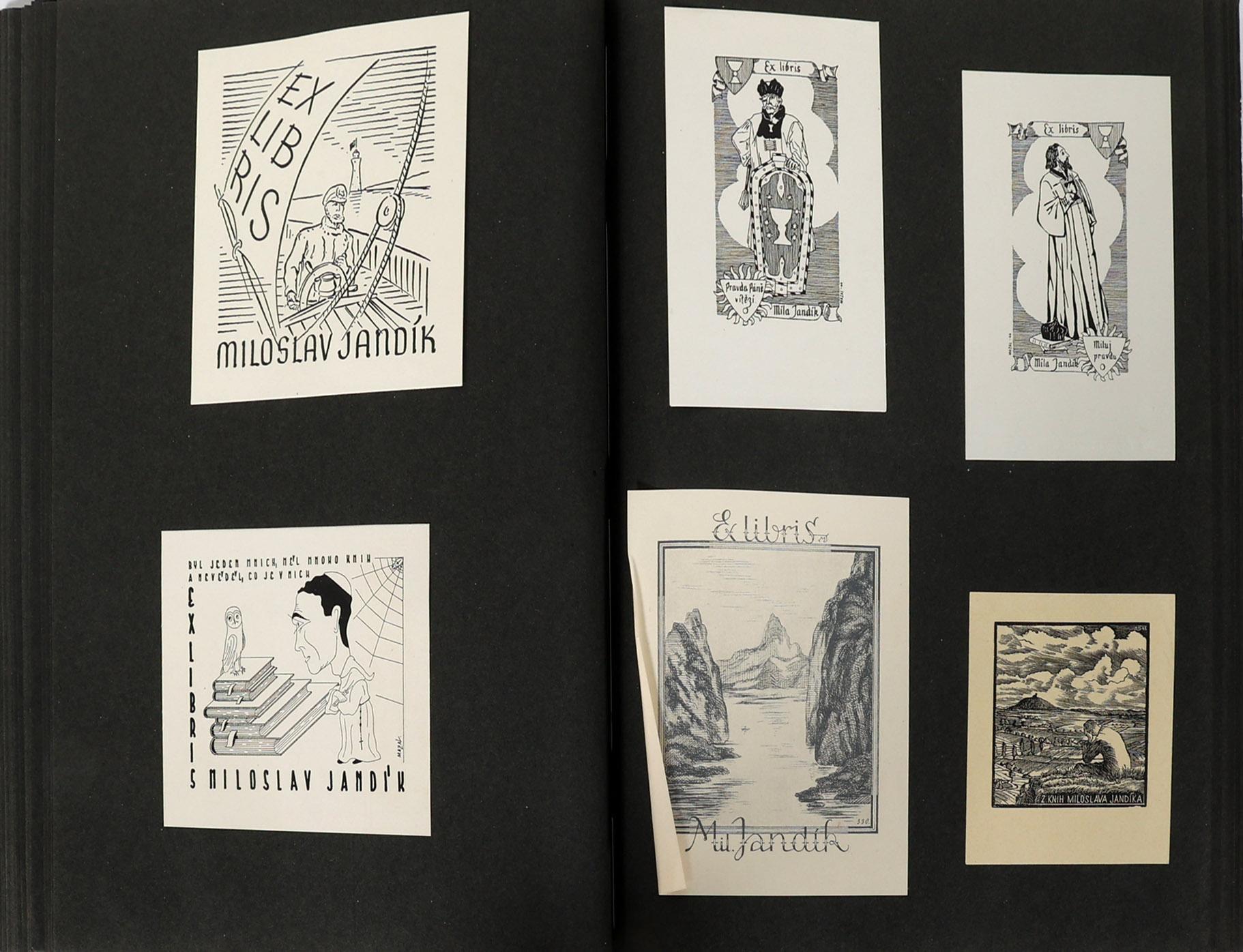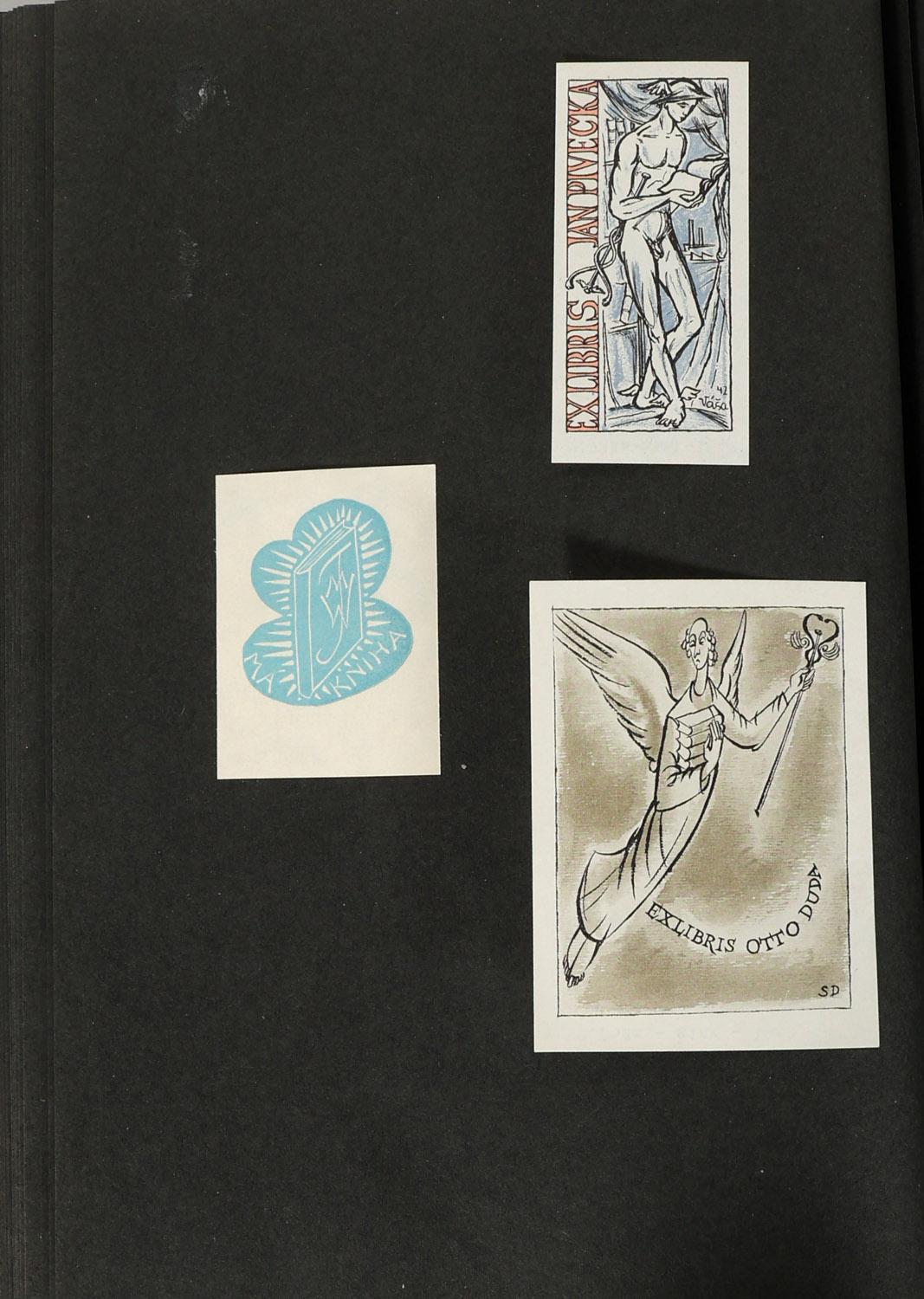 collectie van plm. 225 exlibris en kleingrafiek uit Tsjecho-Slowakije, voornamelijk eerste helft vorige eeuw, opgeplakt in boek, voornamelijk hoogdruk / vlakdruk, niet gesigneerd. O.a. werk van Dolezal, Danihelka, Oldrich Karel, Vodraszka, Hodek, Marik, Beranek, Stastny, Kobliha.