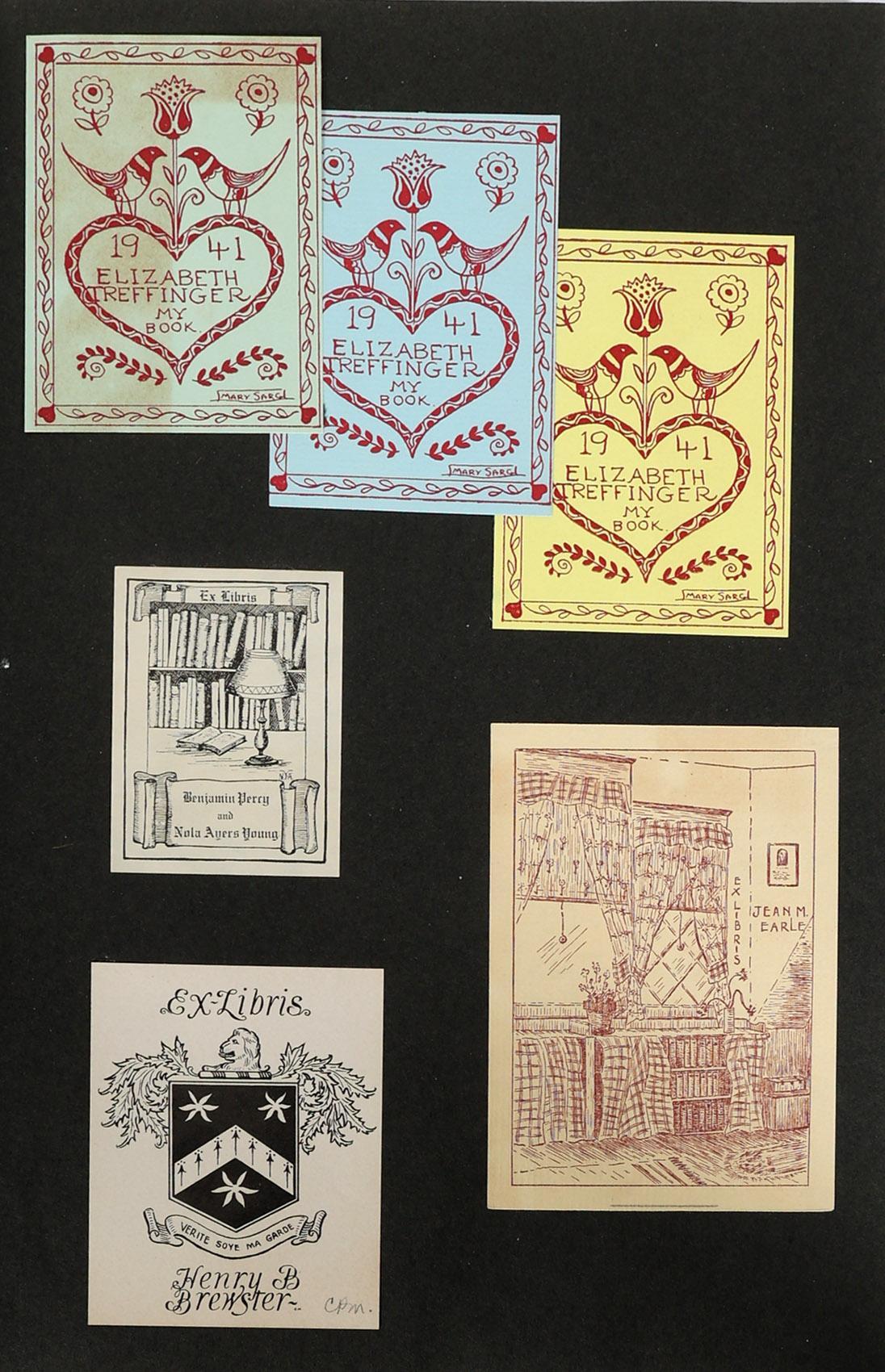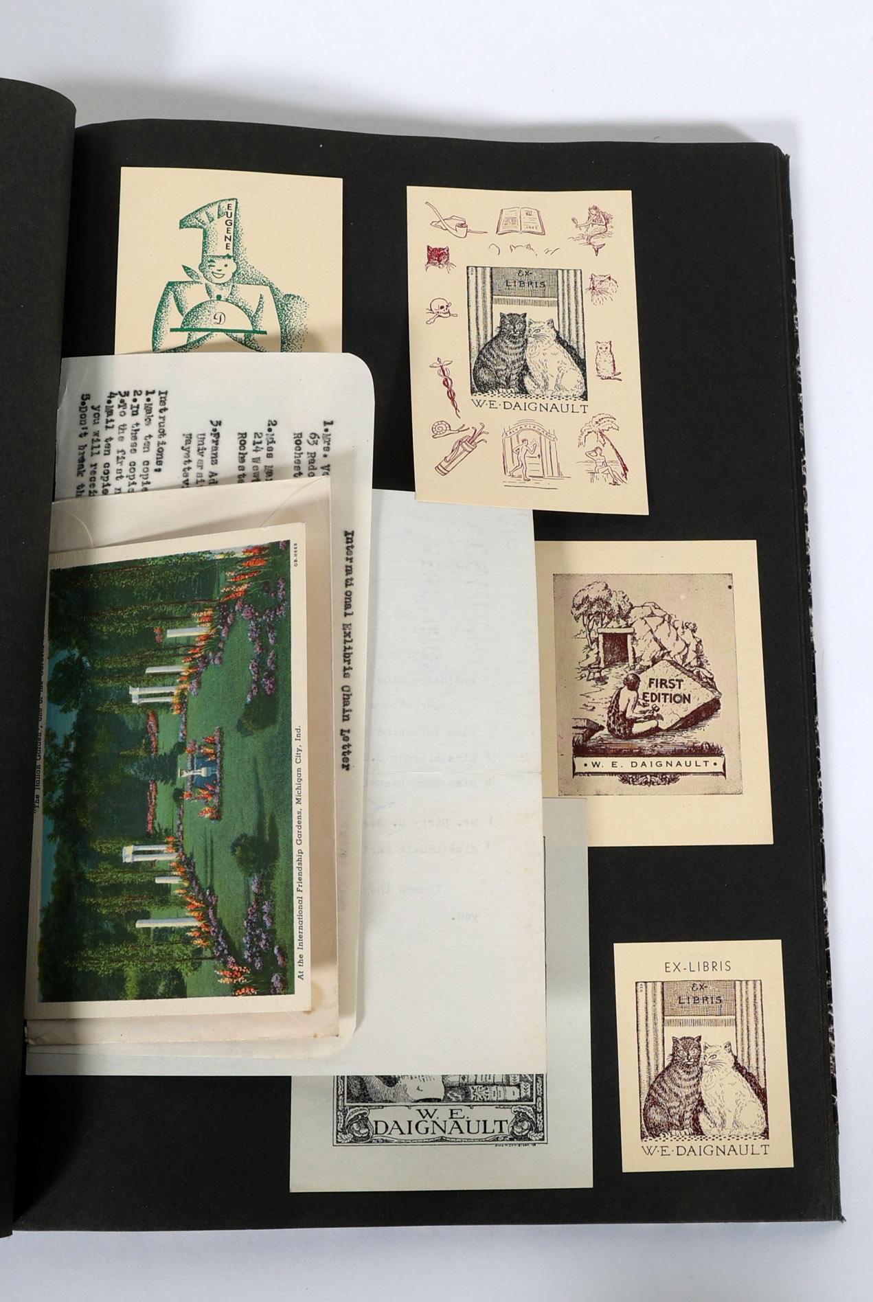 collectie Amerikaanse exlibris, plm. 50 stuks, voornamelijk hoogdruk, eerste helft vorige eeuw, opgeplakt in boek, niet gesigneerd