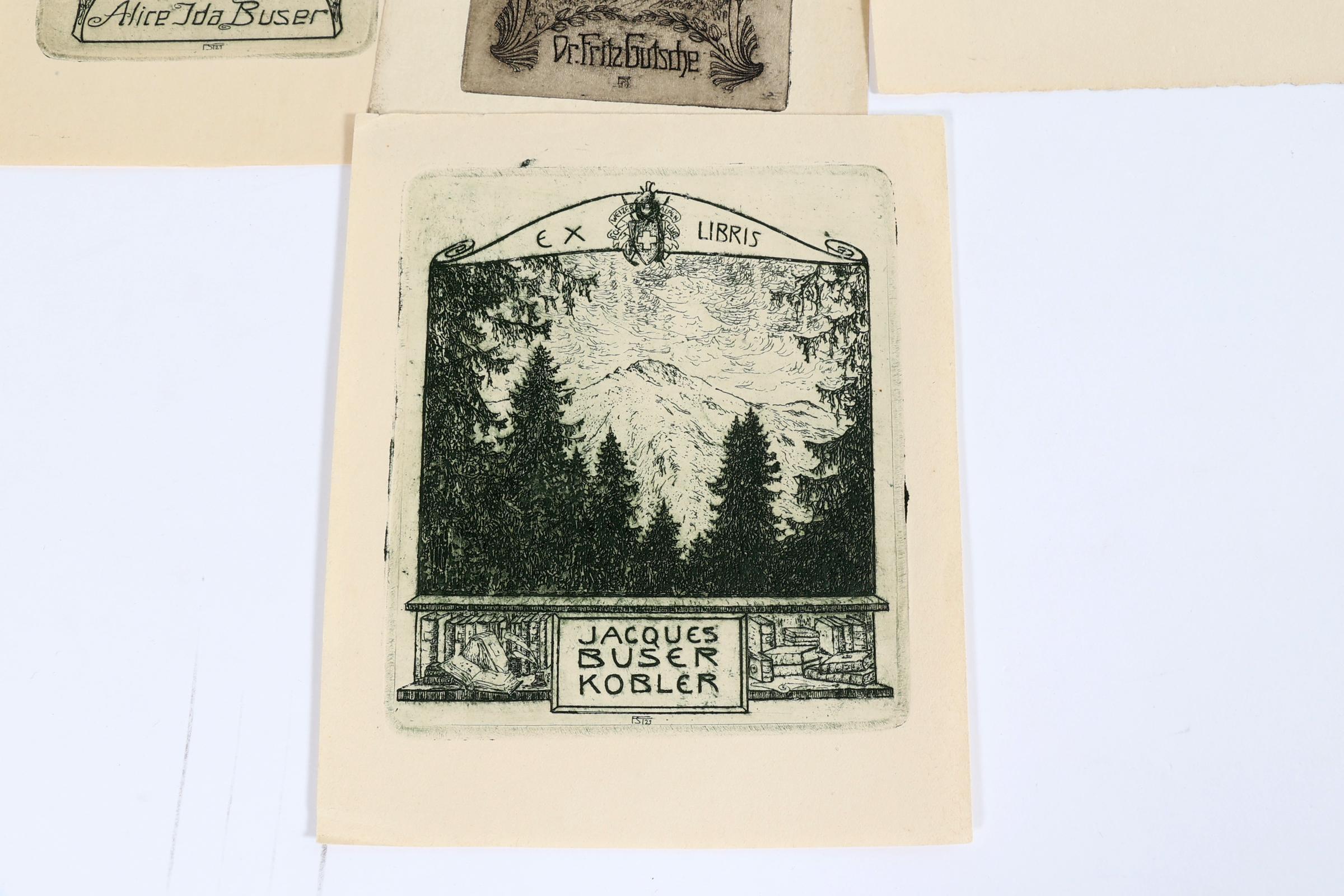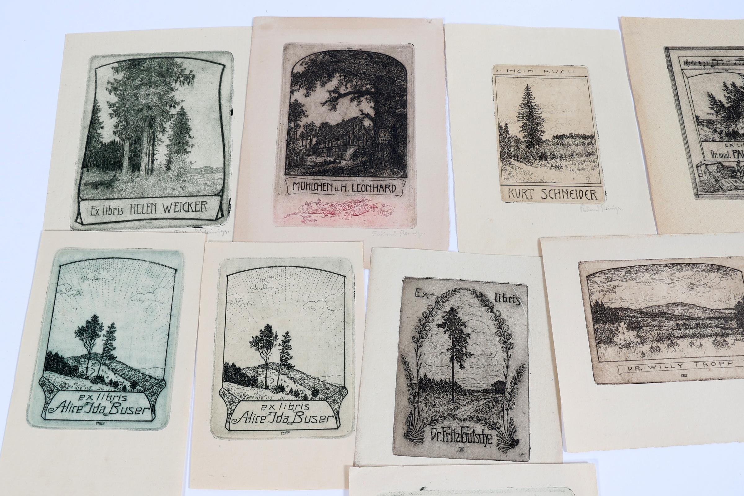 Steiniger, Ferd.,10 exlibris, C3. 6 x niet gesigneerd, 4 x gesigneerd, 1 x met remarque. Bevat 1 doublet. Voor o.a. Buser, Schneider, Weicker, Leonhard.