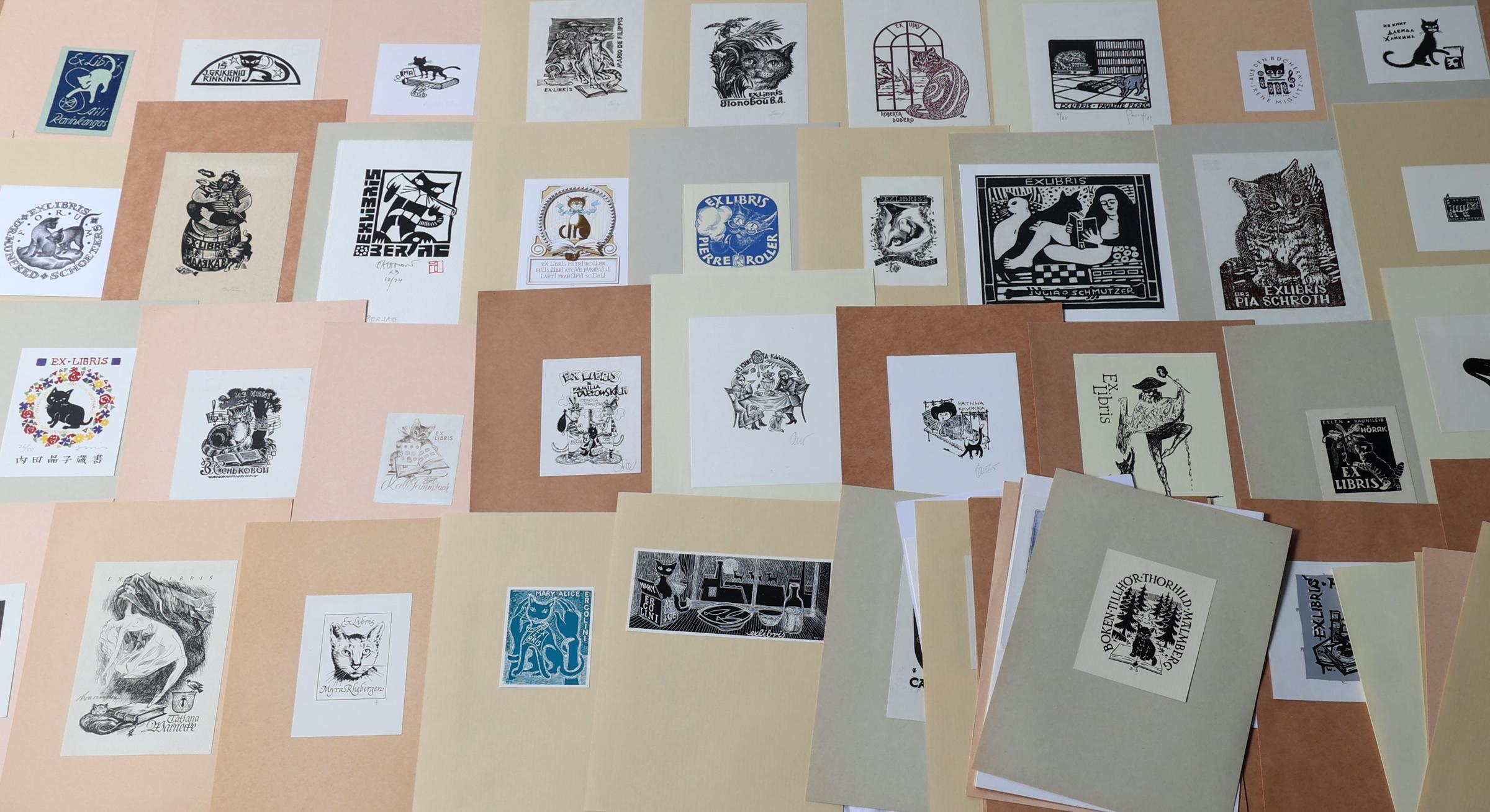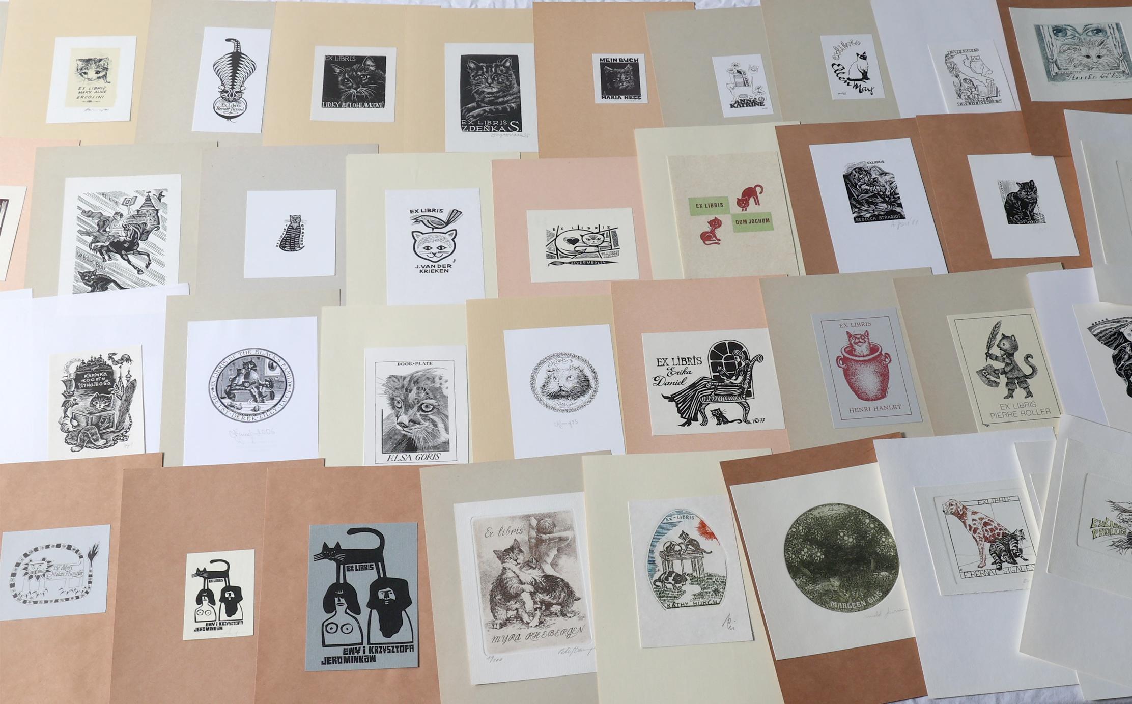 collectie van plm. 130 exlibris, thema: katten. Plm. 120 hoogdruk / vlakdruk, rest diepdruk. Plm. 70 x gesigneerd. Opgeplakt. Werk van o.a. Rueter, Schmuell, Vycholidova, Zwiers, De Koster, Wolf.