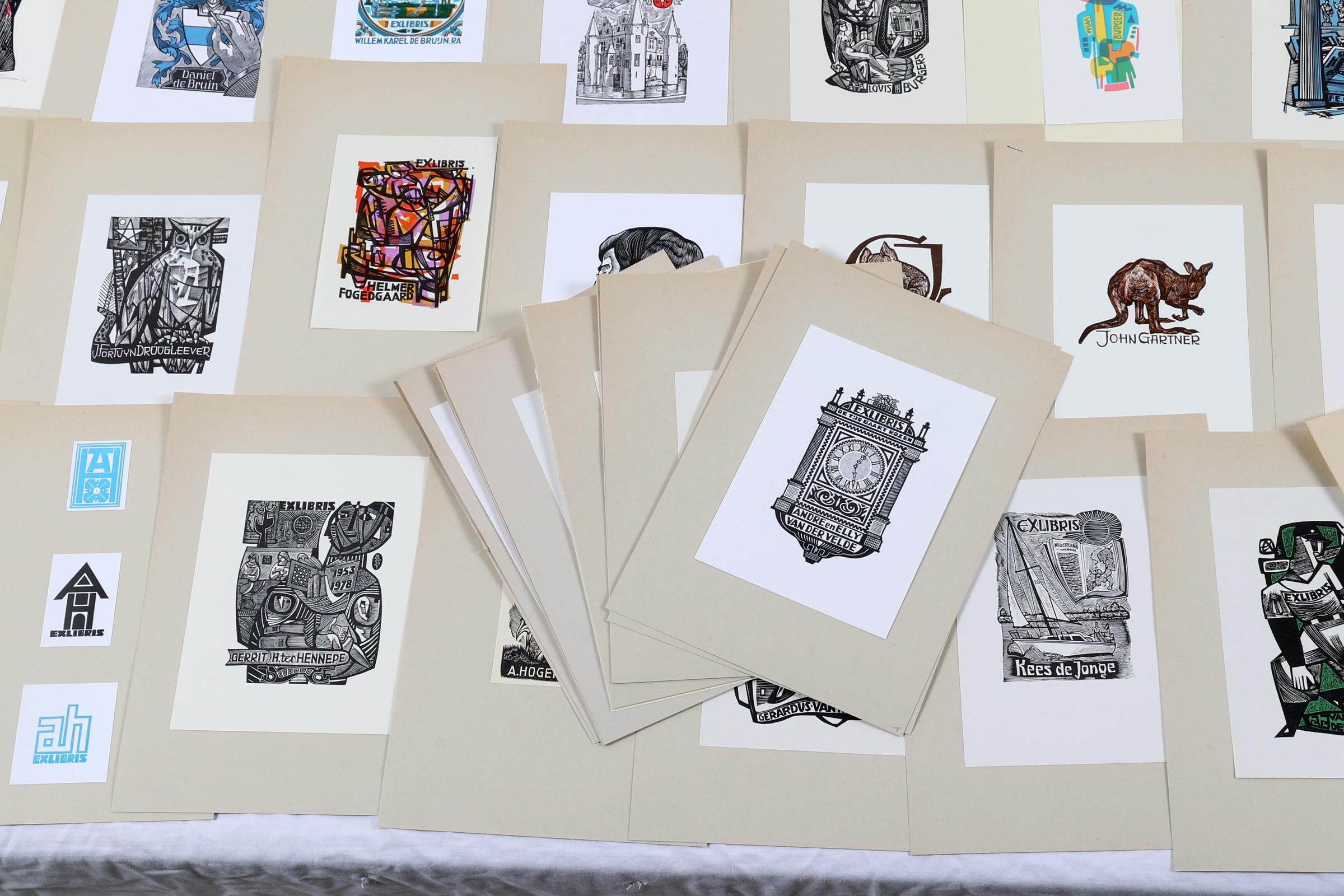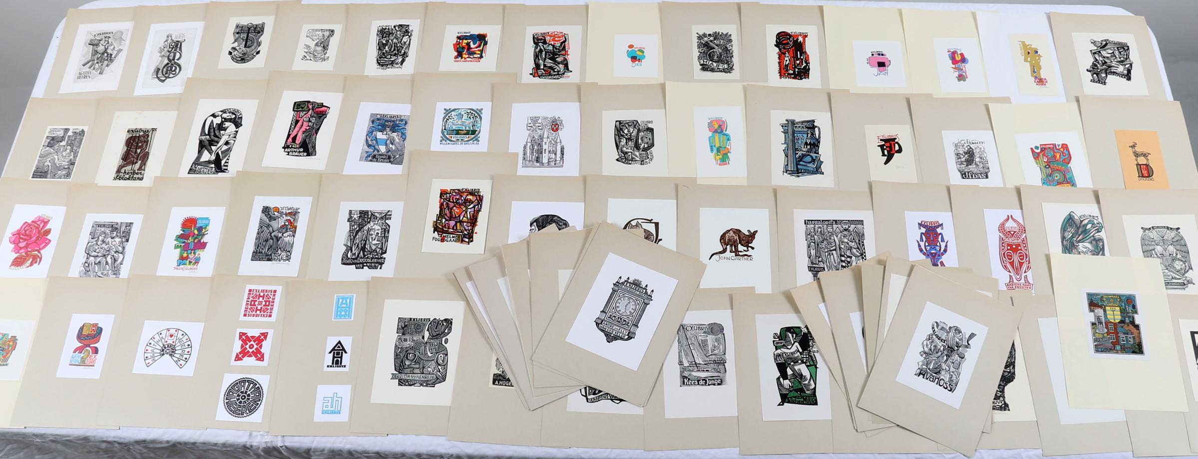 Battermann, J., plm. 100 exlibris, 2 x diepdruk, rest hoogdruk - deels in meerkleuren. Plm. 25 x gesigneerd. Opgeplakt.