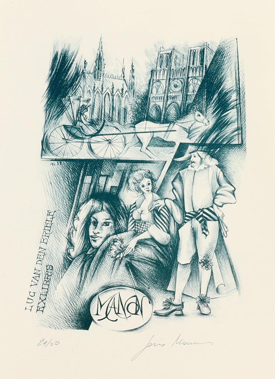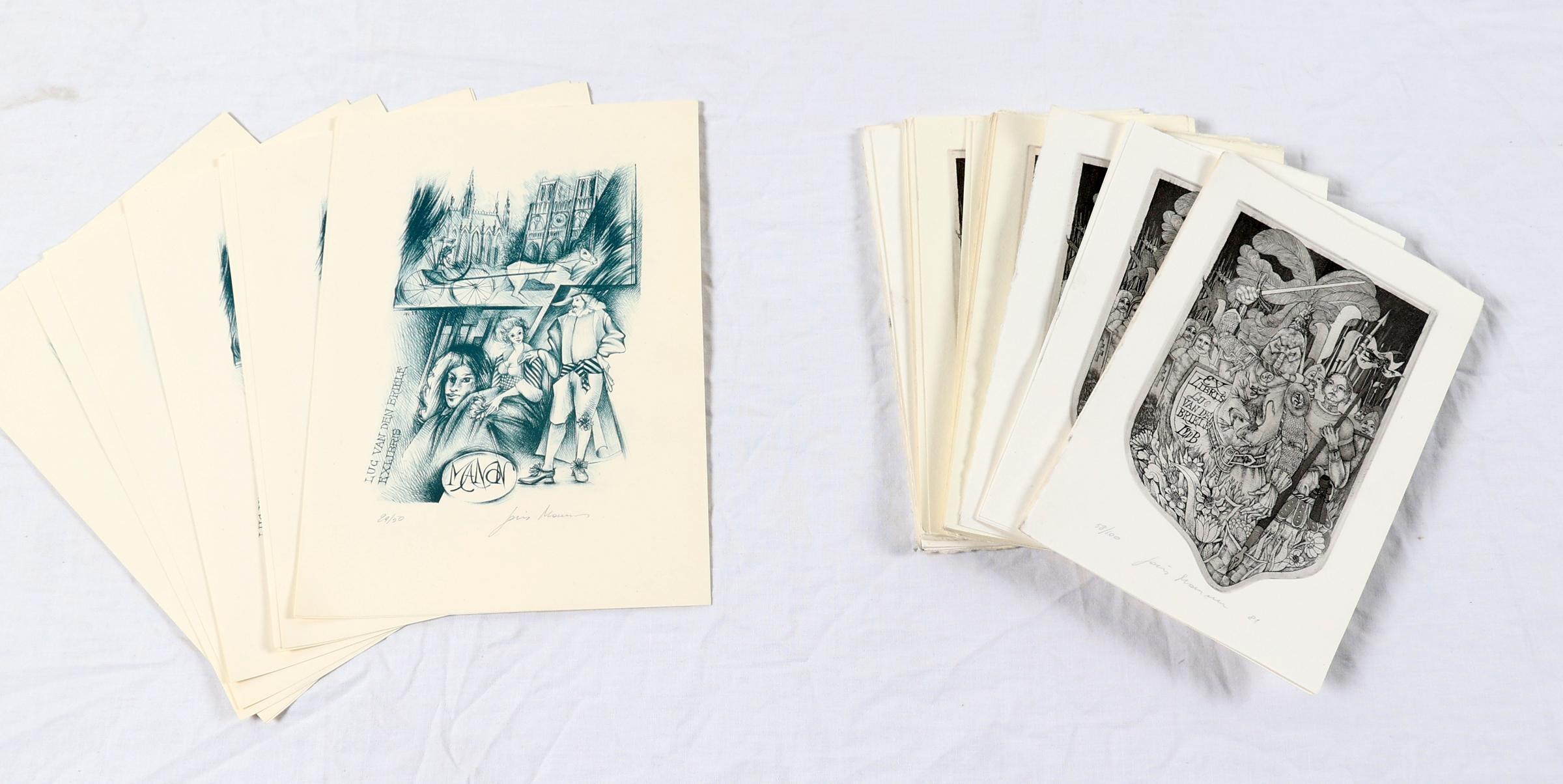 Mommen, Joris, exlibris voor Van den Briele. Restoplagen, 2 verschillende: 1) plm. 35 x diepdruk, 1981, genummerd en gesigneerd, 'De Leeuw van Vlaanderen 2) plm. 15 x litho, genummerd en gesigneerd.