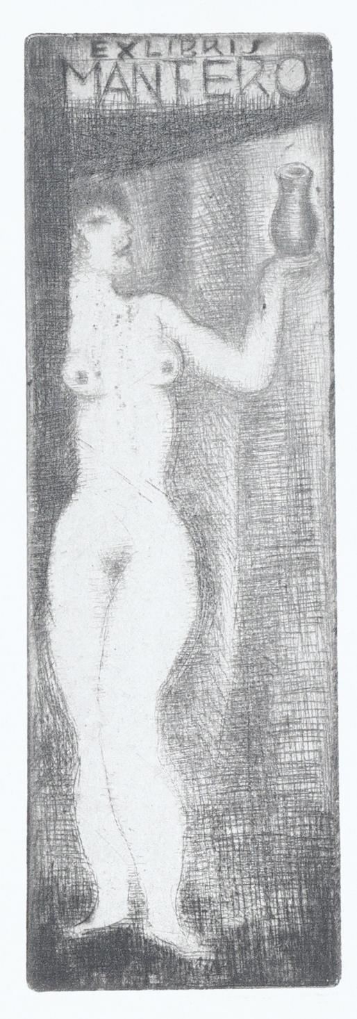 Fingesten, M., 3 exlibris, C3, (Gino Sabattini, Eva, gesigneerd; Mantero, naakt met kruik, niet gesigneerd - nieuwe druk?; Stefan Heyman, litho, niet gesigneerd)