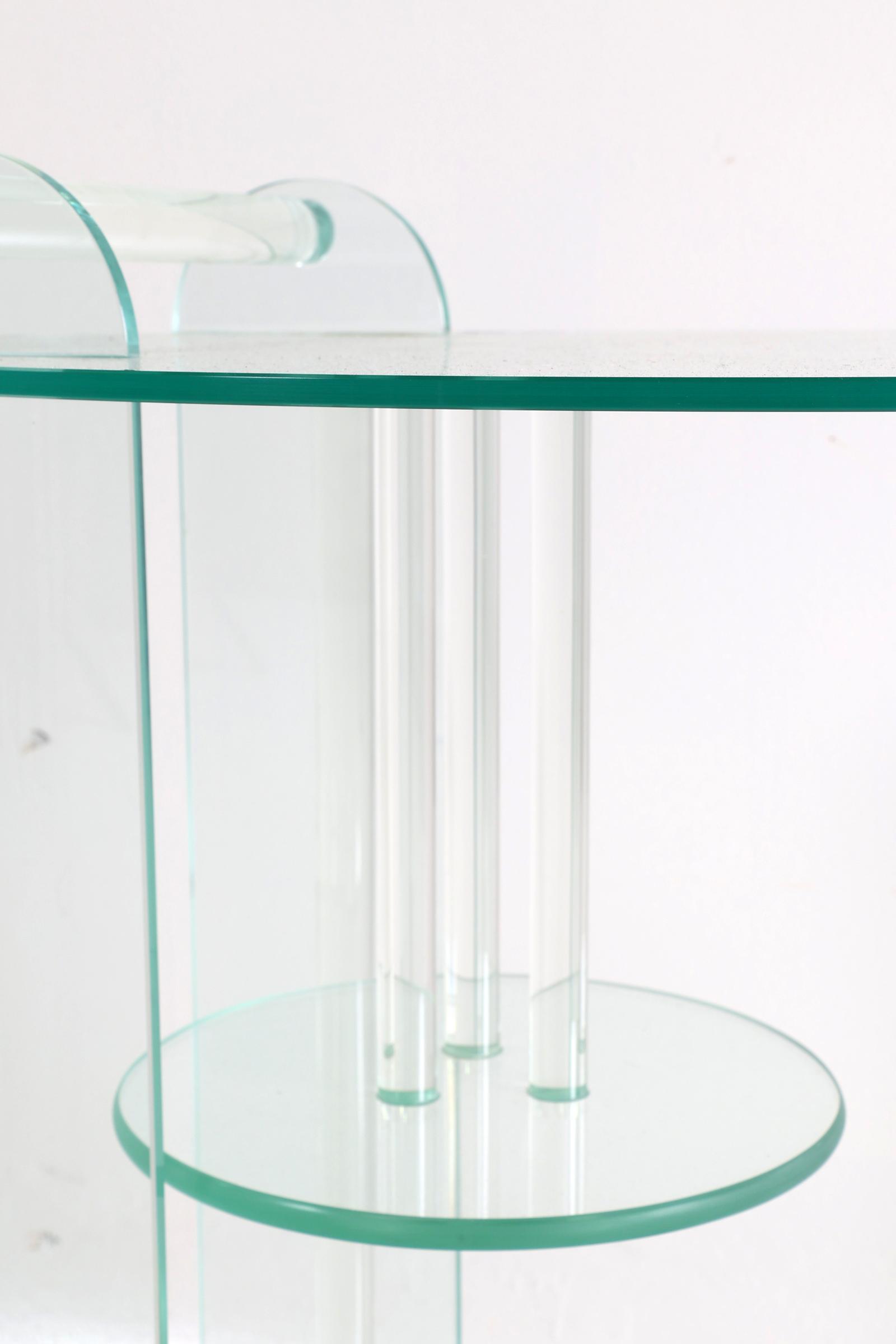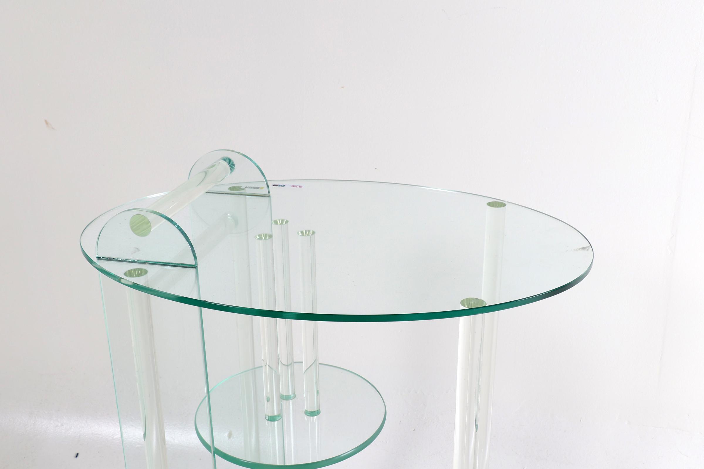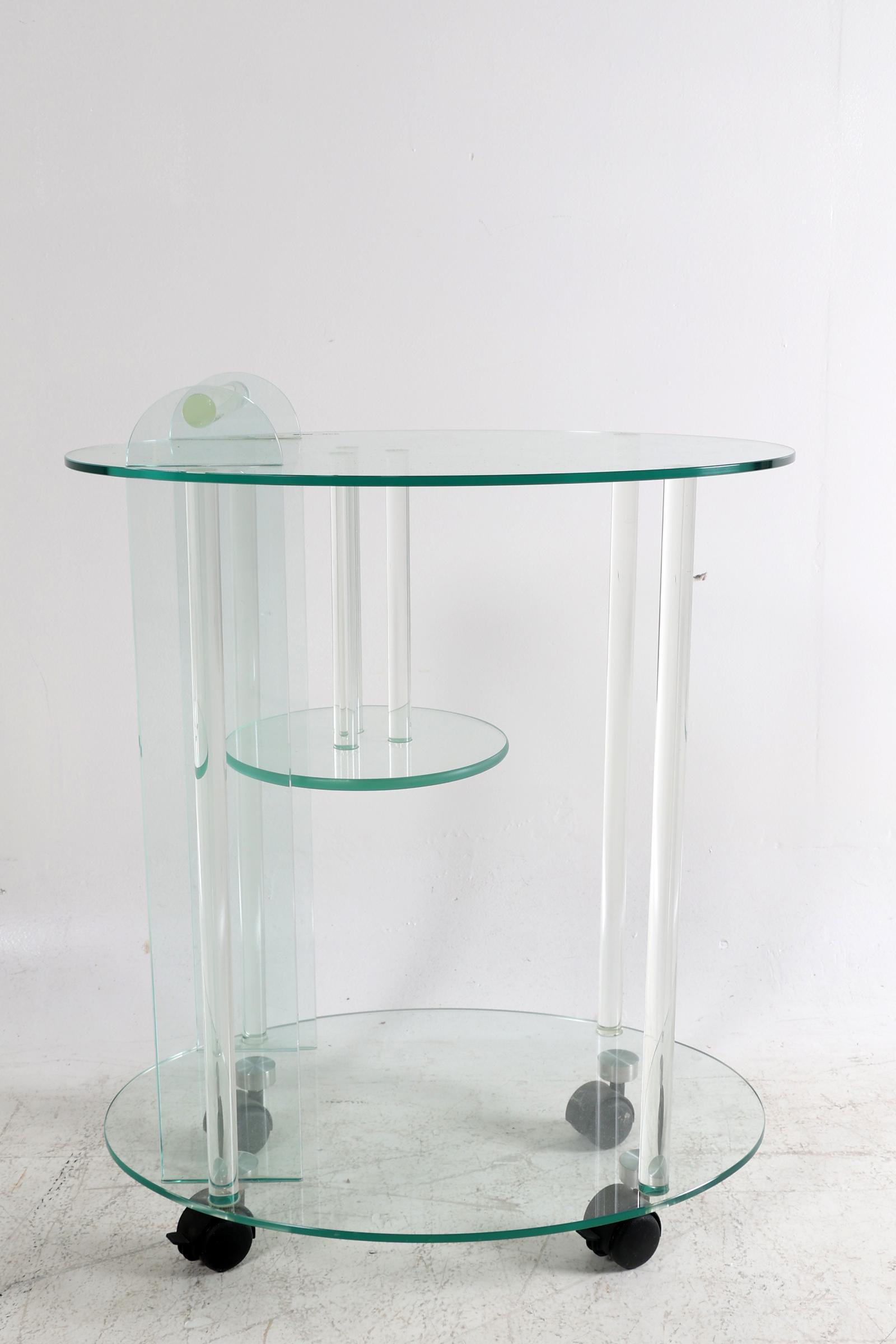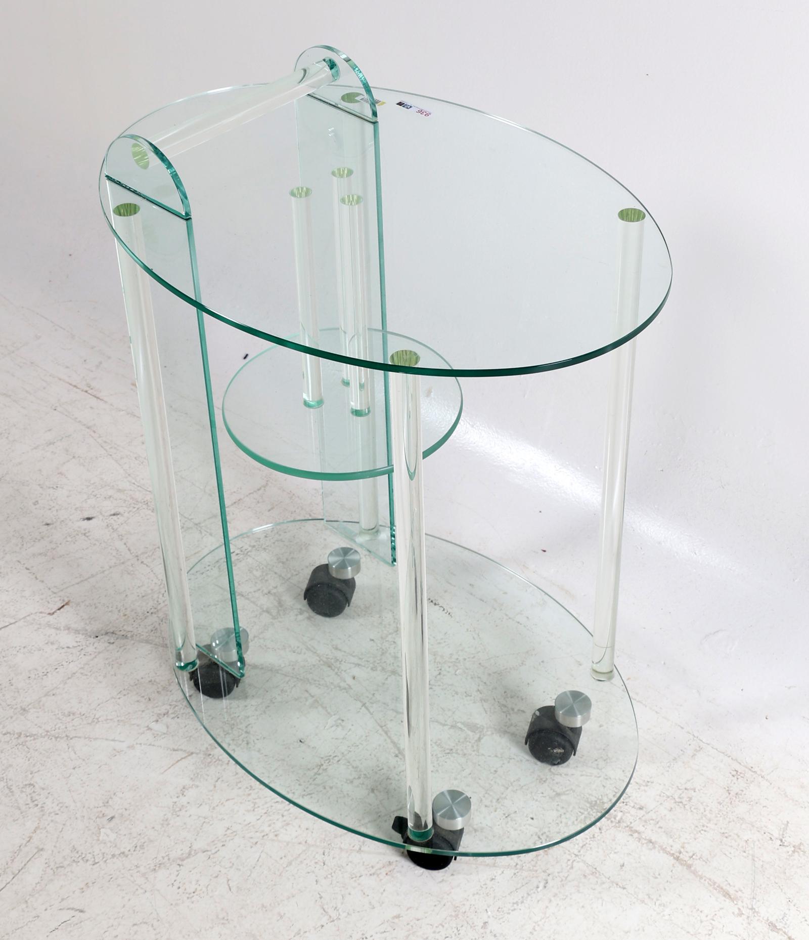 Moderne glazen met plexiglazen bijzettafel op wielen, h.76 x b.61 x d.43 cm.