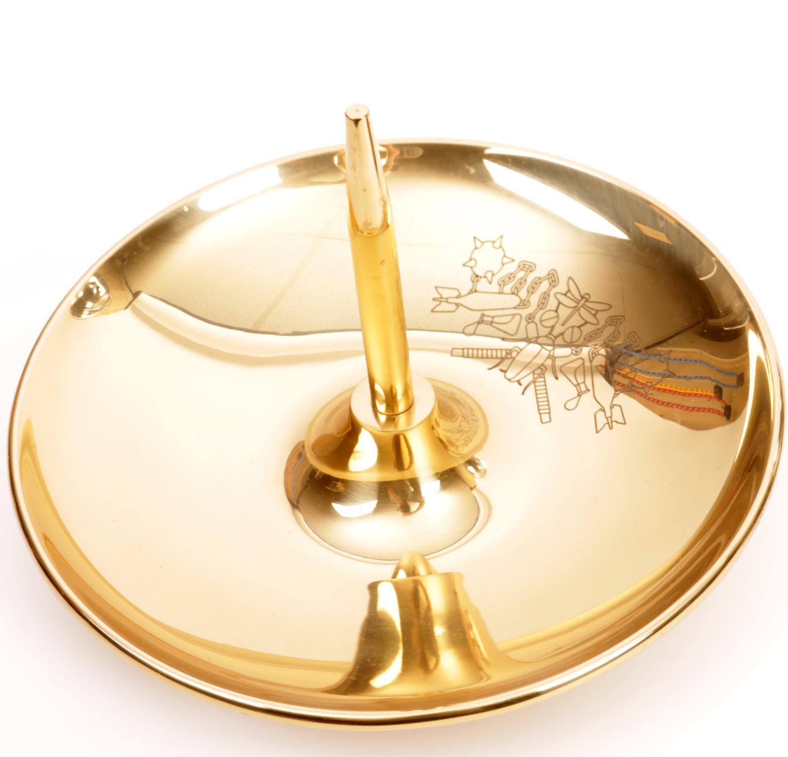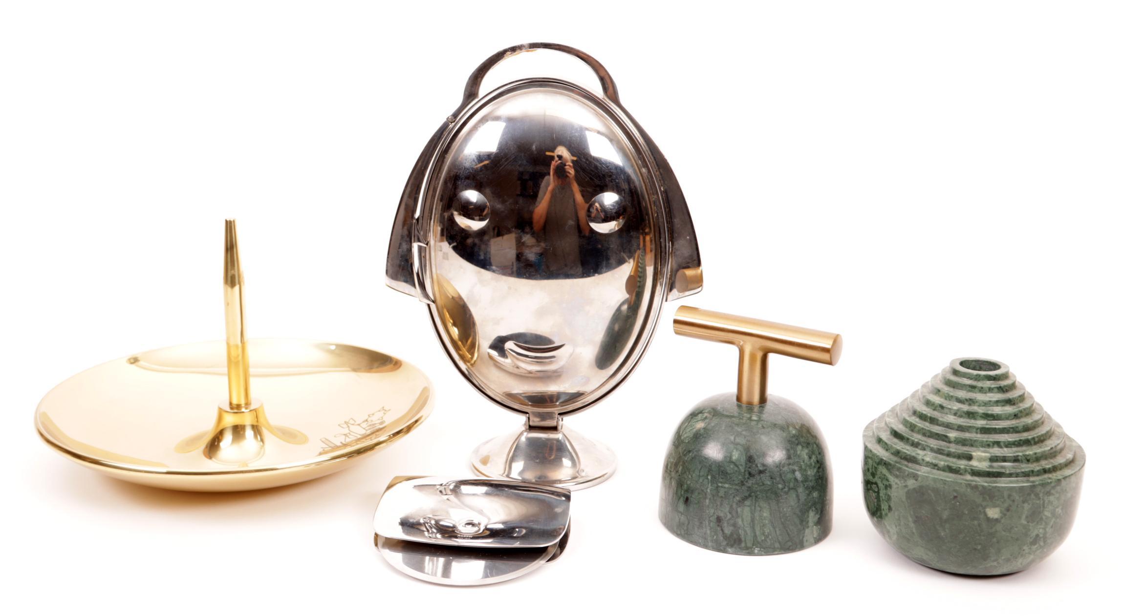Koop van : Alessi rvs taart etagére, pizzasnijder, Studio Job messing kandelaar, groen marmeren kandelaar en een presse papier
